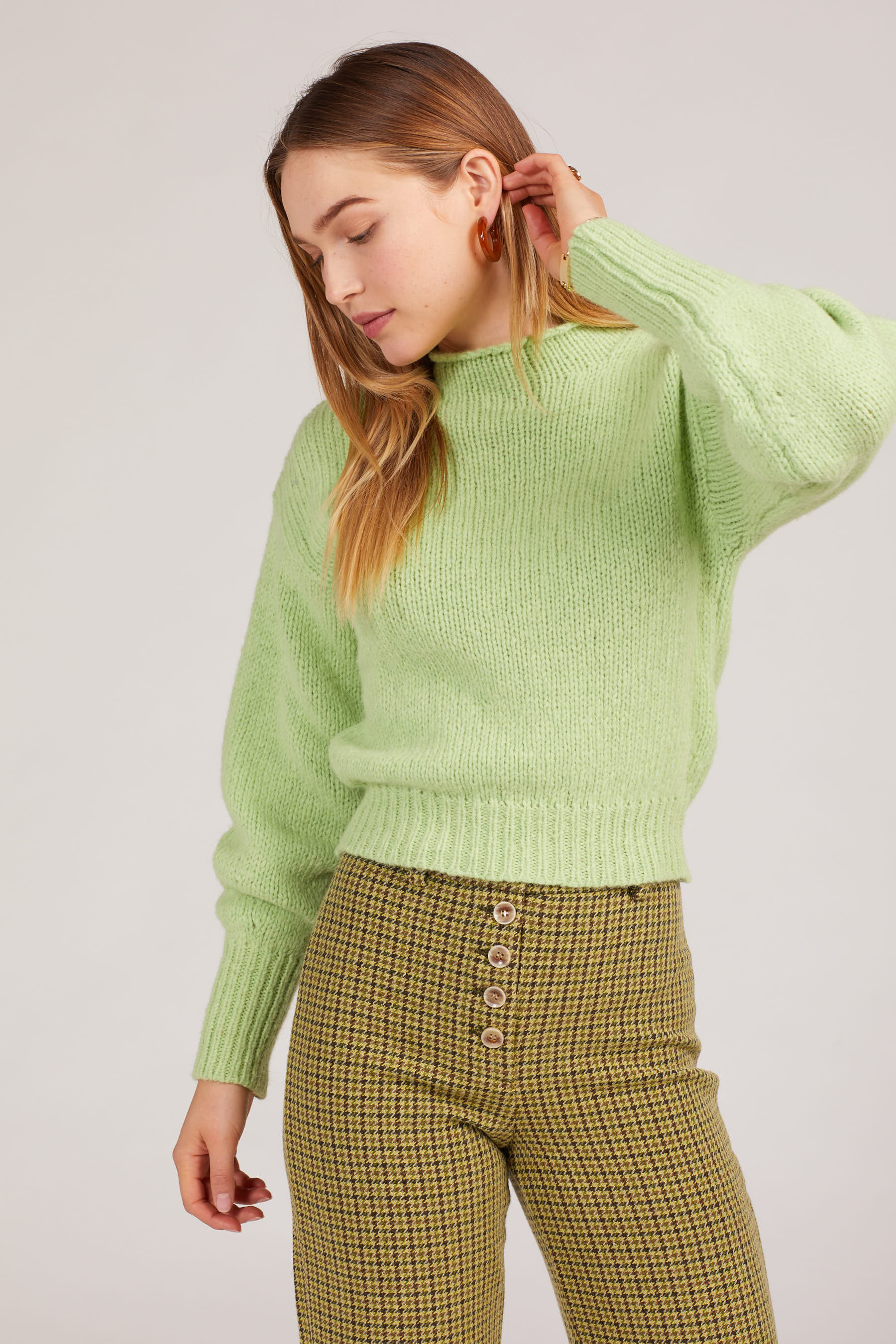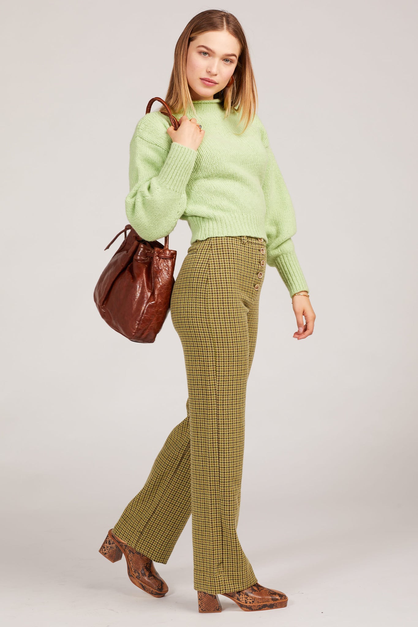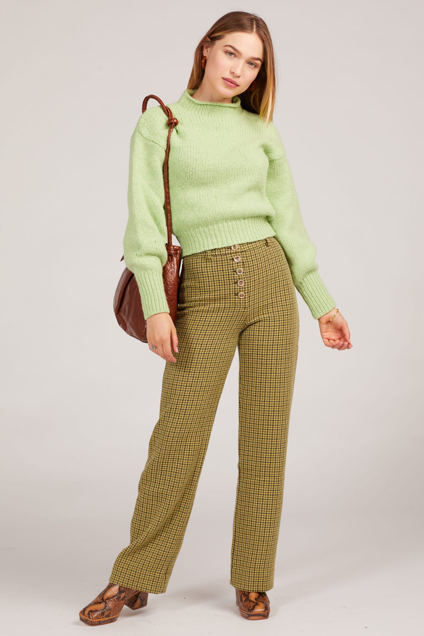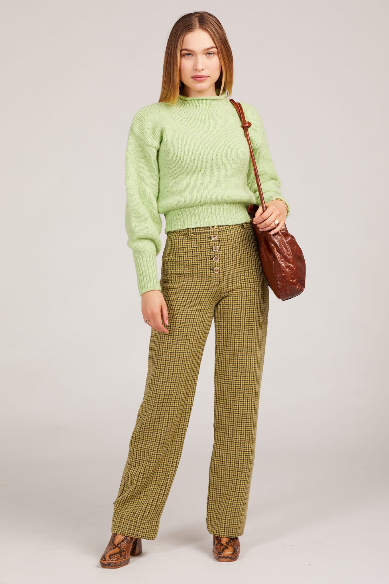 Green tweed houndstooth pants? Say no more. A high rise with a button up closure and the perfect lime tweed make for a piece that can be styled upscale or comfy and casual. Features belt loops and a single slip back pocket.