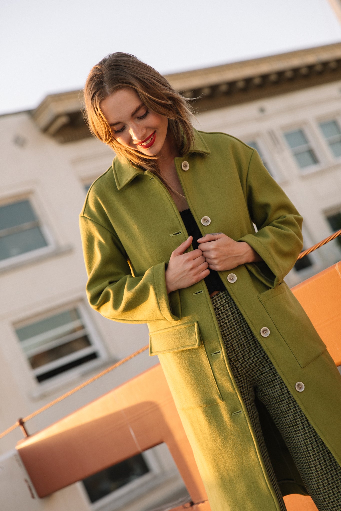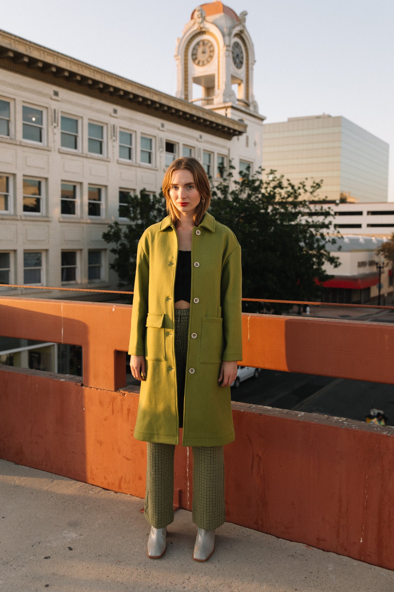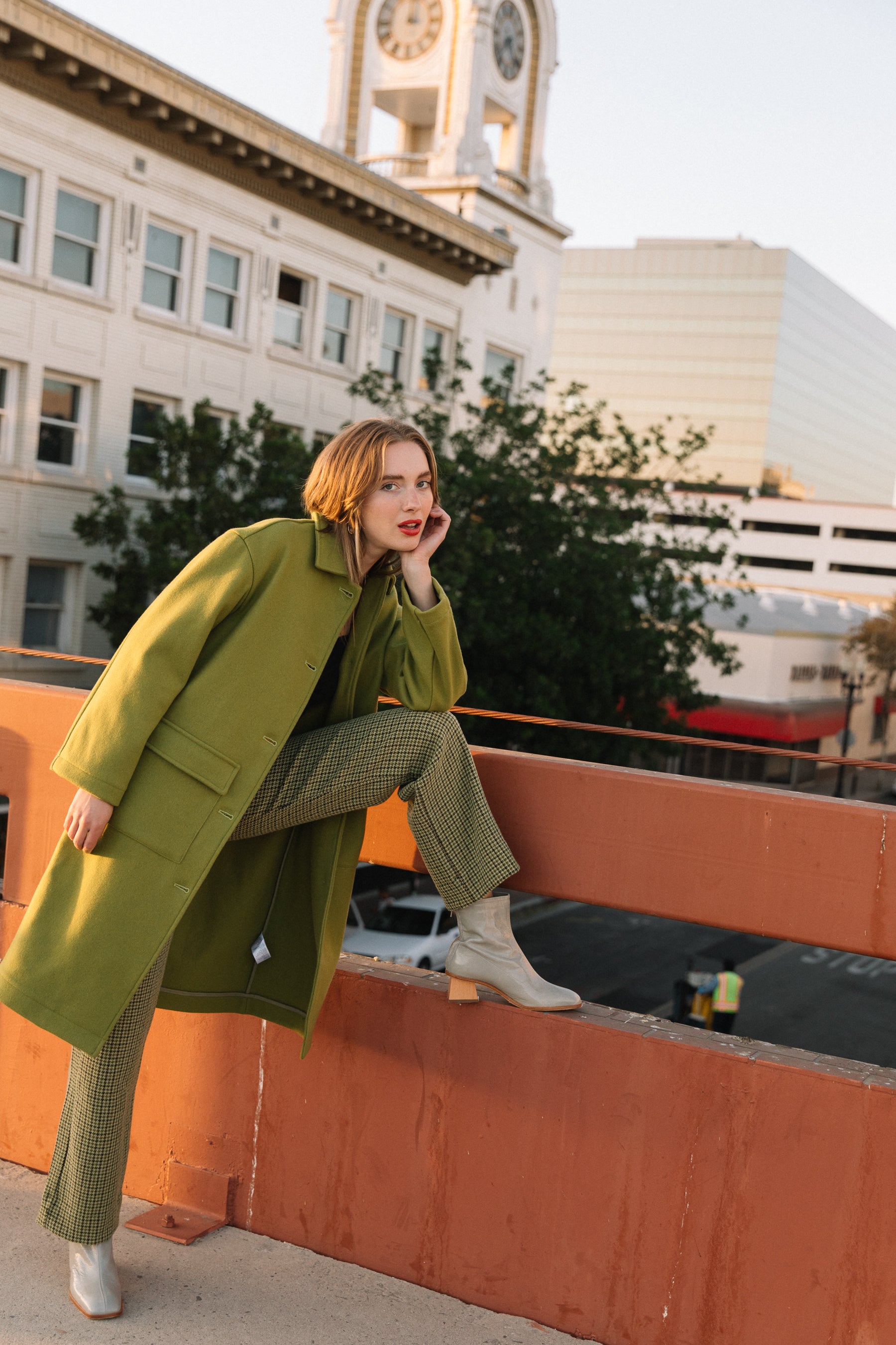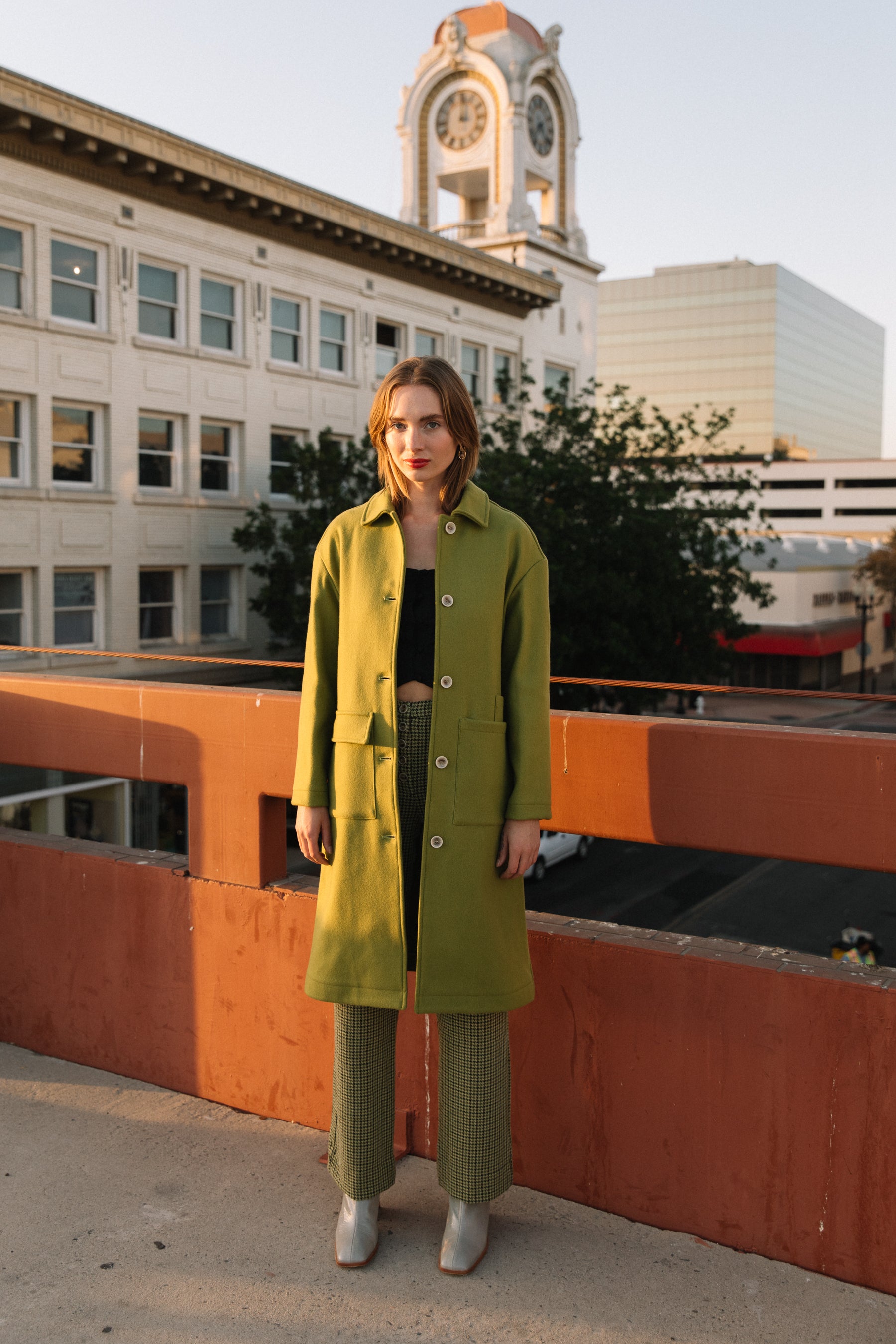 Green tweed houndstooth pants? Say no more. A high rise with a button up closure and the perfect lime tweed make for a piece that can be styled upscale or comfy and casual. Features belt loops and a single slip back pocket.
