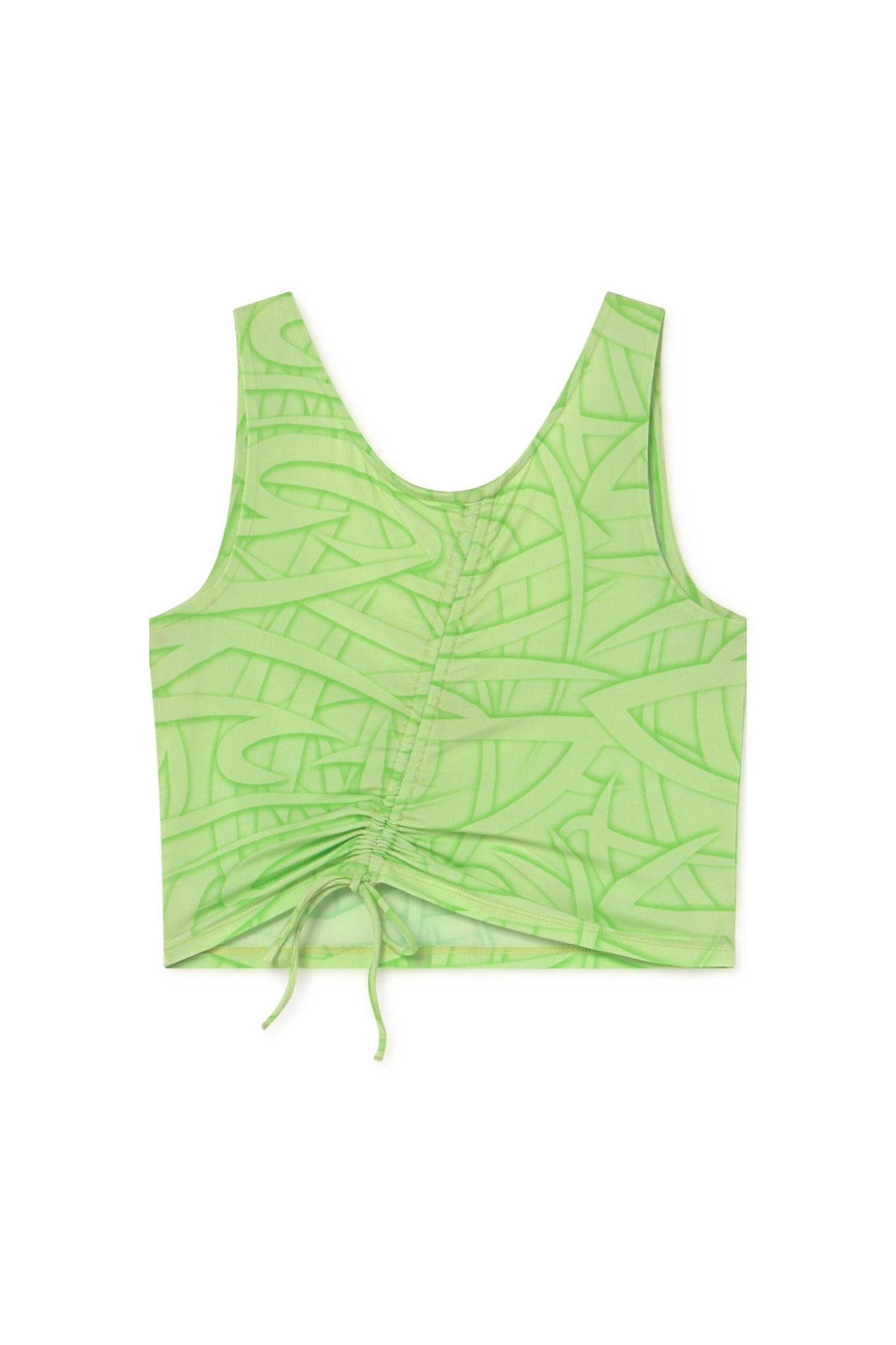 Stretch jersey tank with an adjustable asymmetric drawstring down the front and a cropped length.