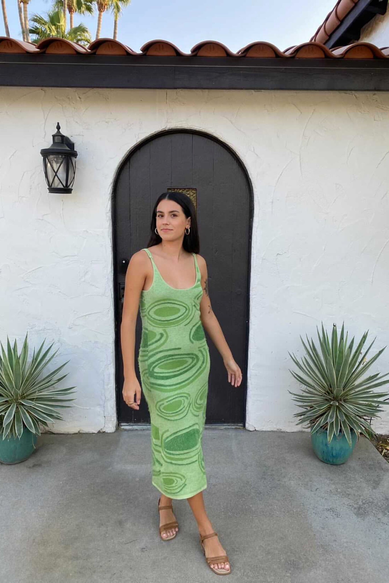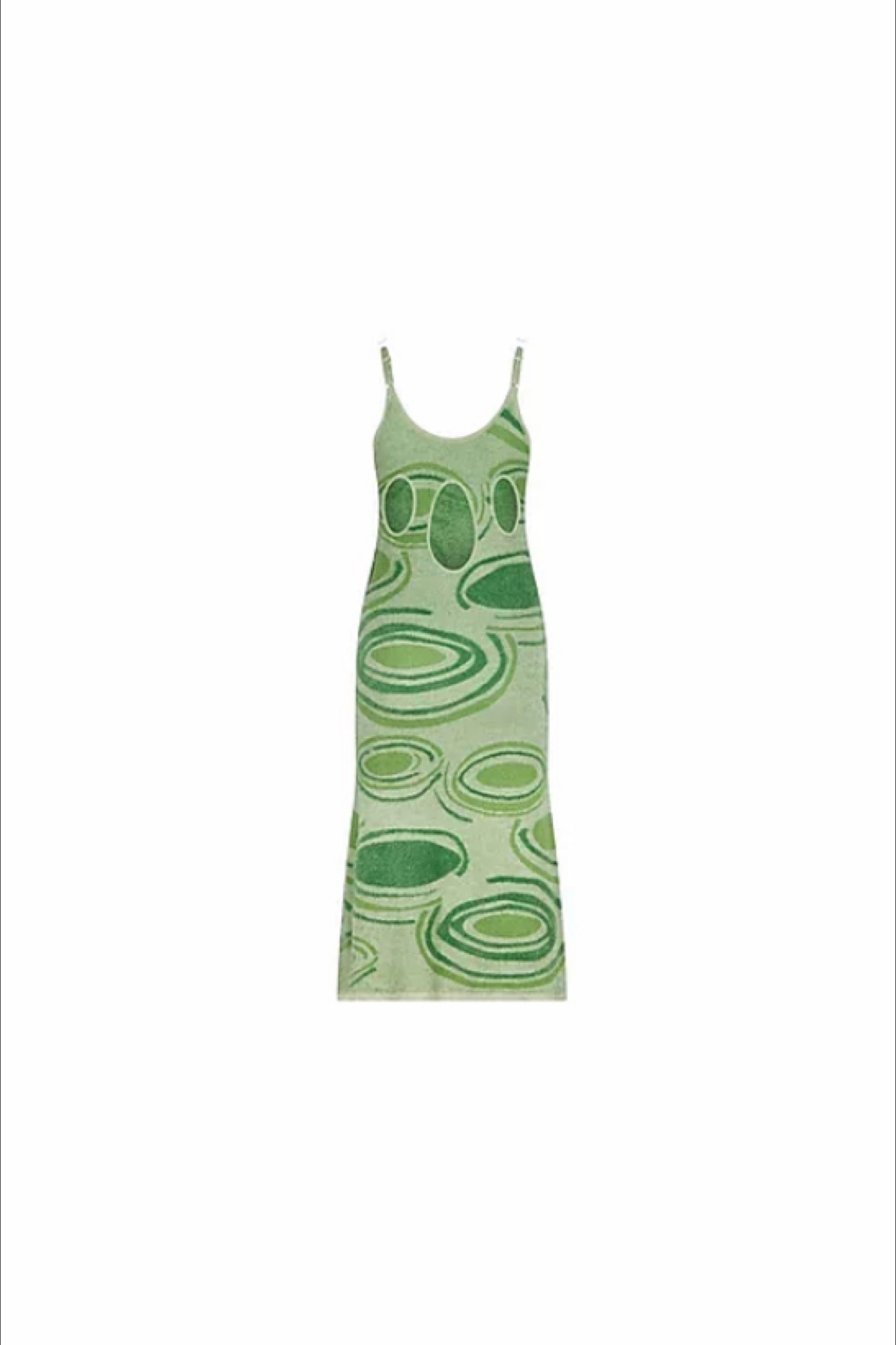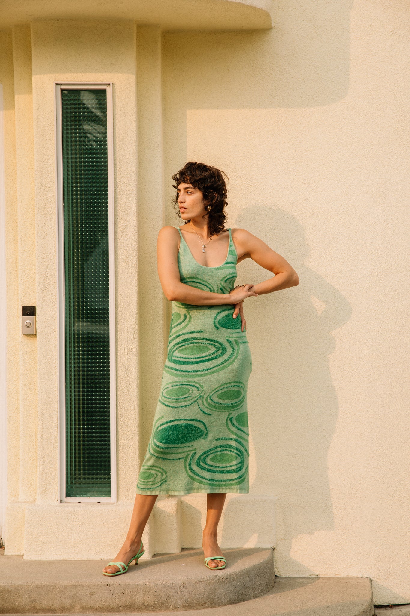 Knit midi length dress with back cut out detail and adjustable straps in an exclusive lily pad print.