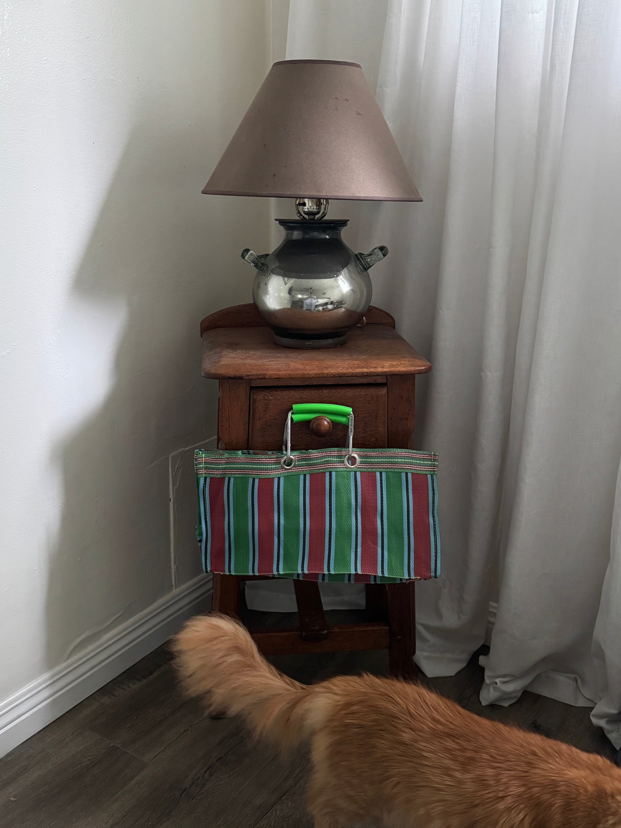 This type of fabric is often seen in India and is widely used for cargo bags and storage. We have never found any surplus of this material in good enough condition to repurpose or in a good combination of colors. One day, we saw very large and vibrant storage bags hauling goods through the airport in Mumbai that were in a striped pattern. It took us a year a half to find a factory that would make exactly what we saw and produce this pattern of fabric by using recycled plastic. The width of the fabric is more narrow than normal cotton or synthetic material, so the size of the bags that can be made is very limited. We decided to start with these four sizes so that there would be no waste during production and are easier to construct as each is made by hand.