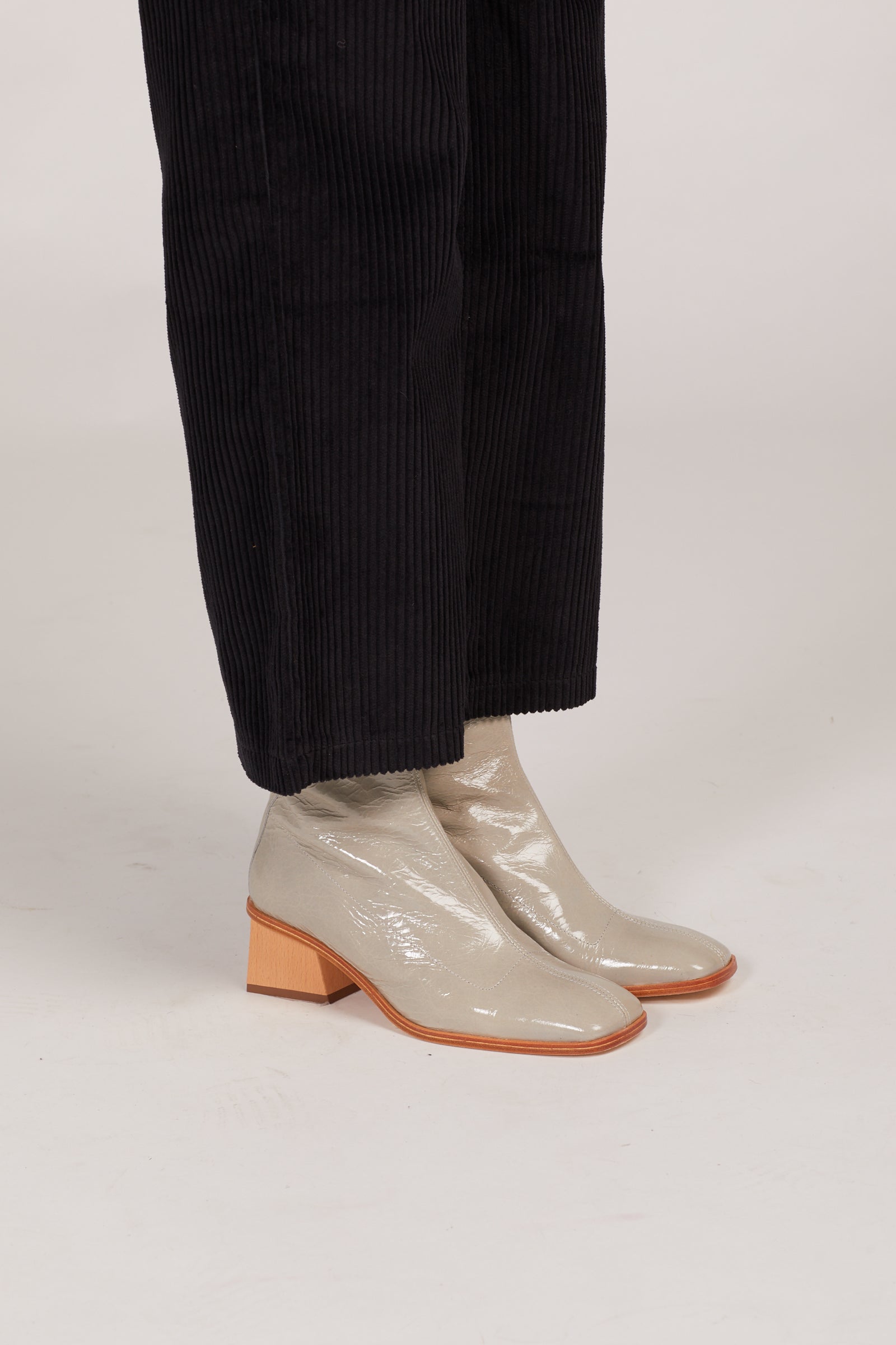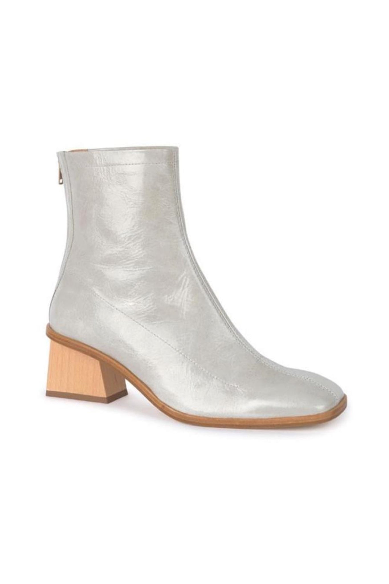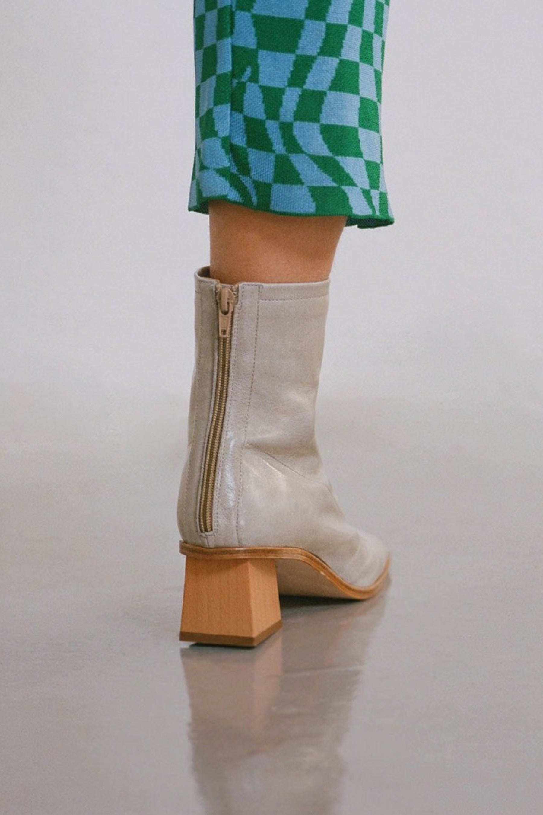 Ankle boots with back zip fastening. Geometric wooden 5 cm heel and leather sole.