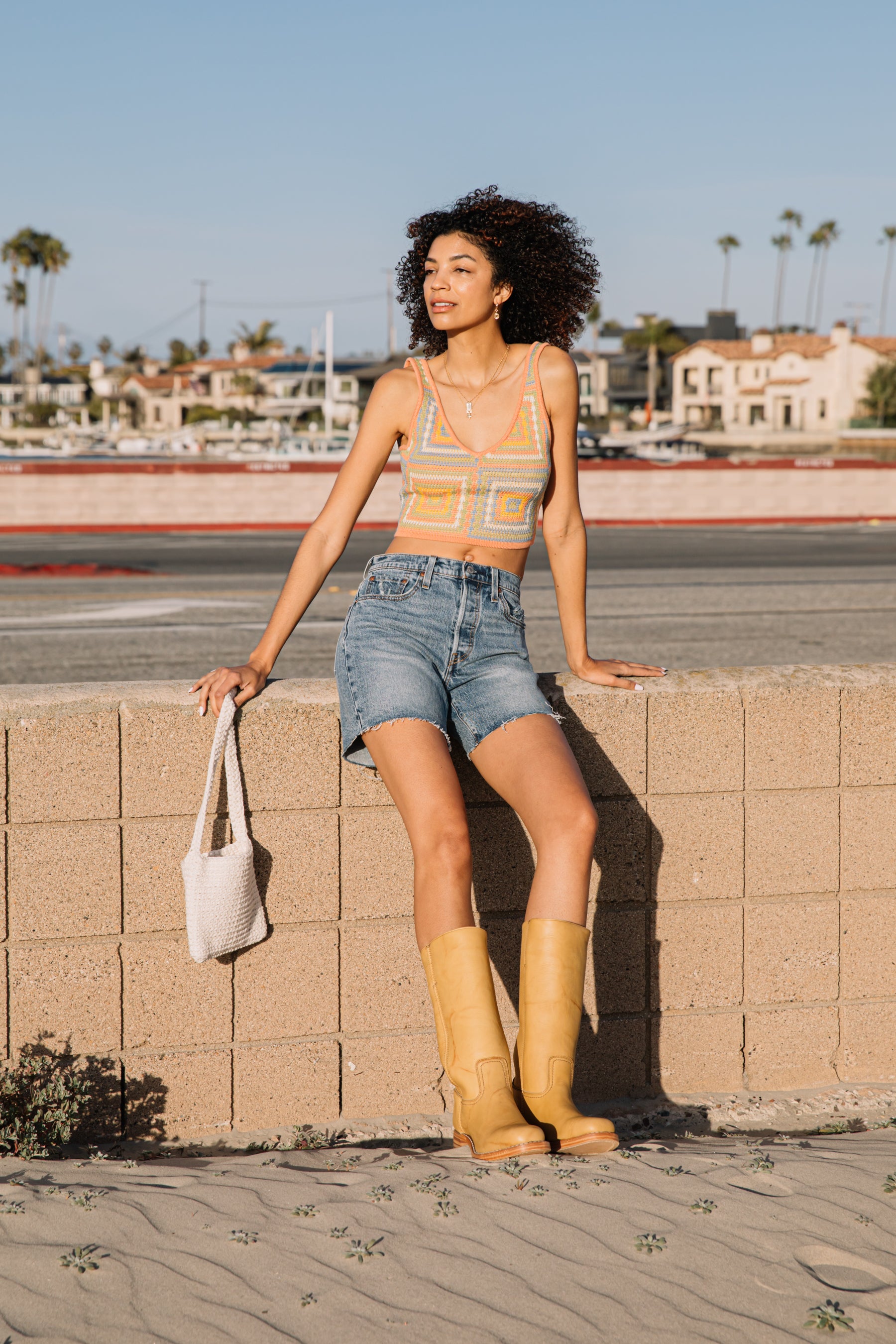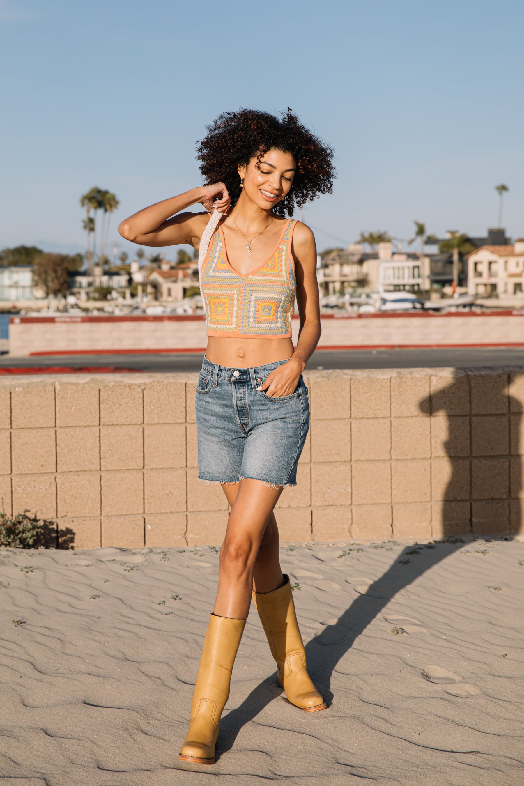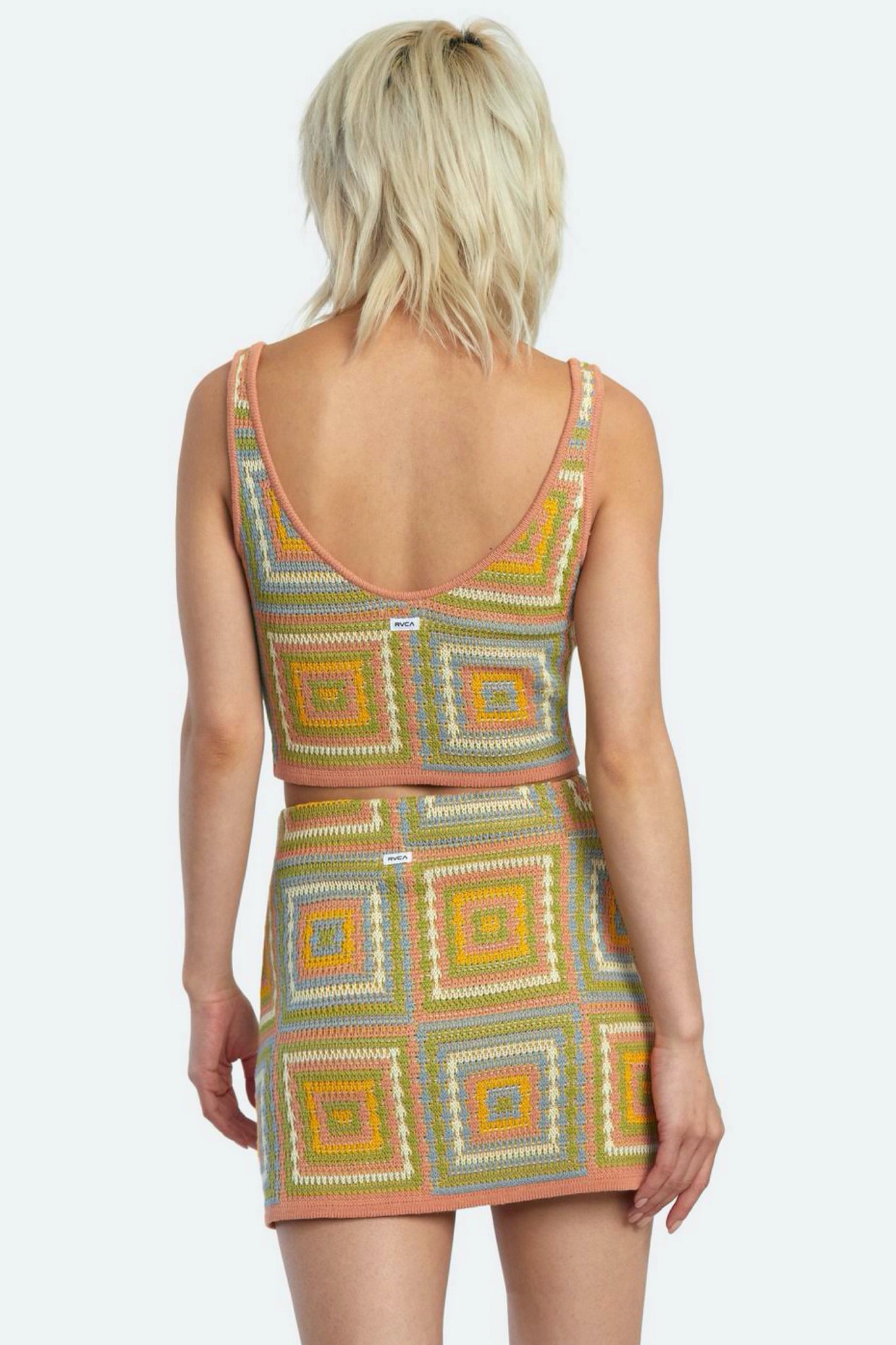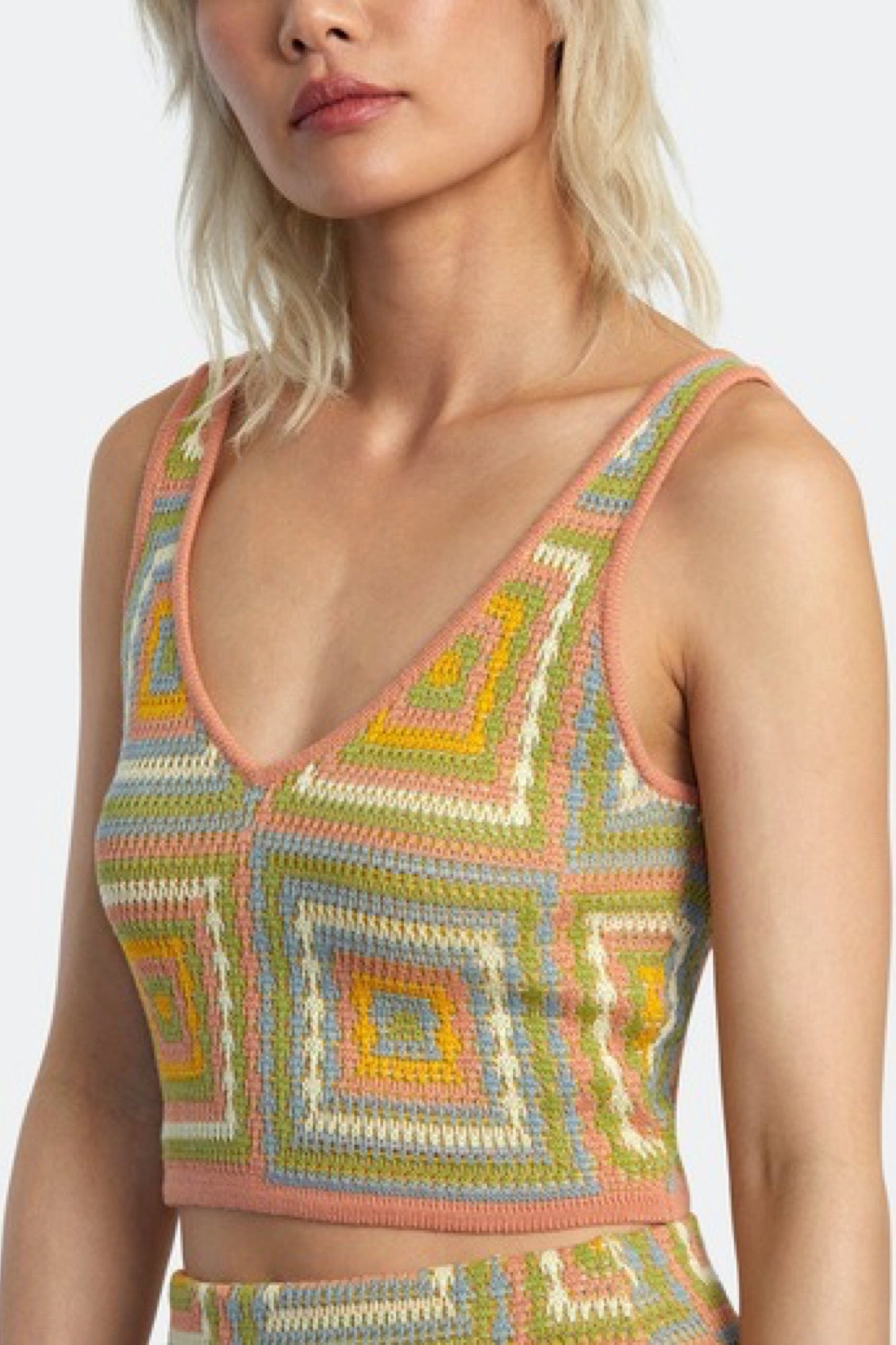 This crochet-inspired tank top features a deep v-neck and a woven square design.