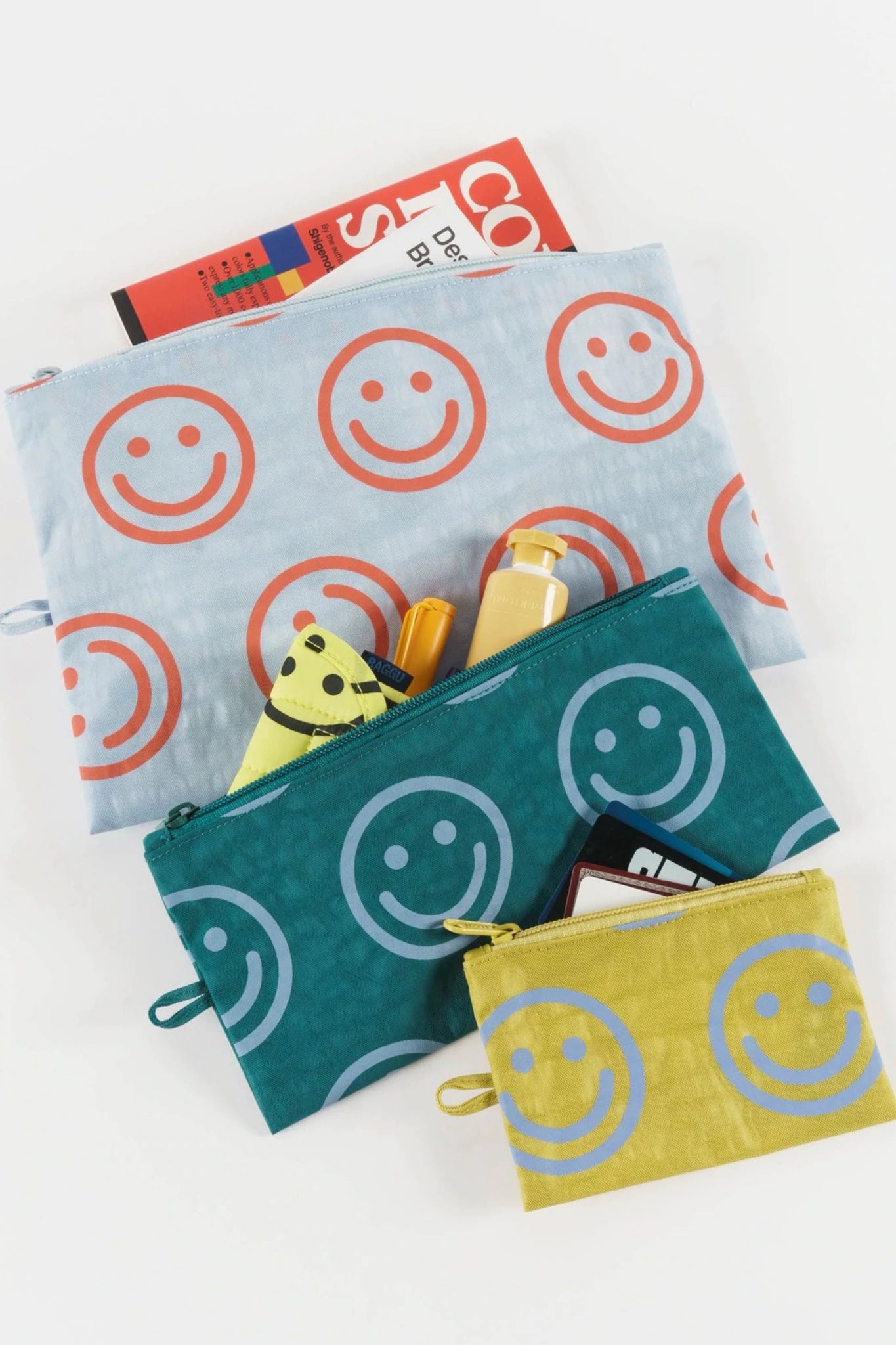 A set of three zippered pouches for travel and organization, with loops for carrying and hanging on the go. Perfect for packing, organizing your bag, or home tidying.