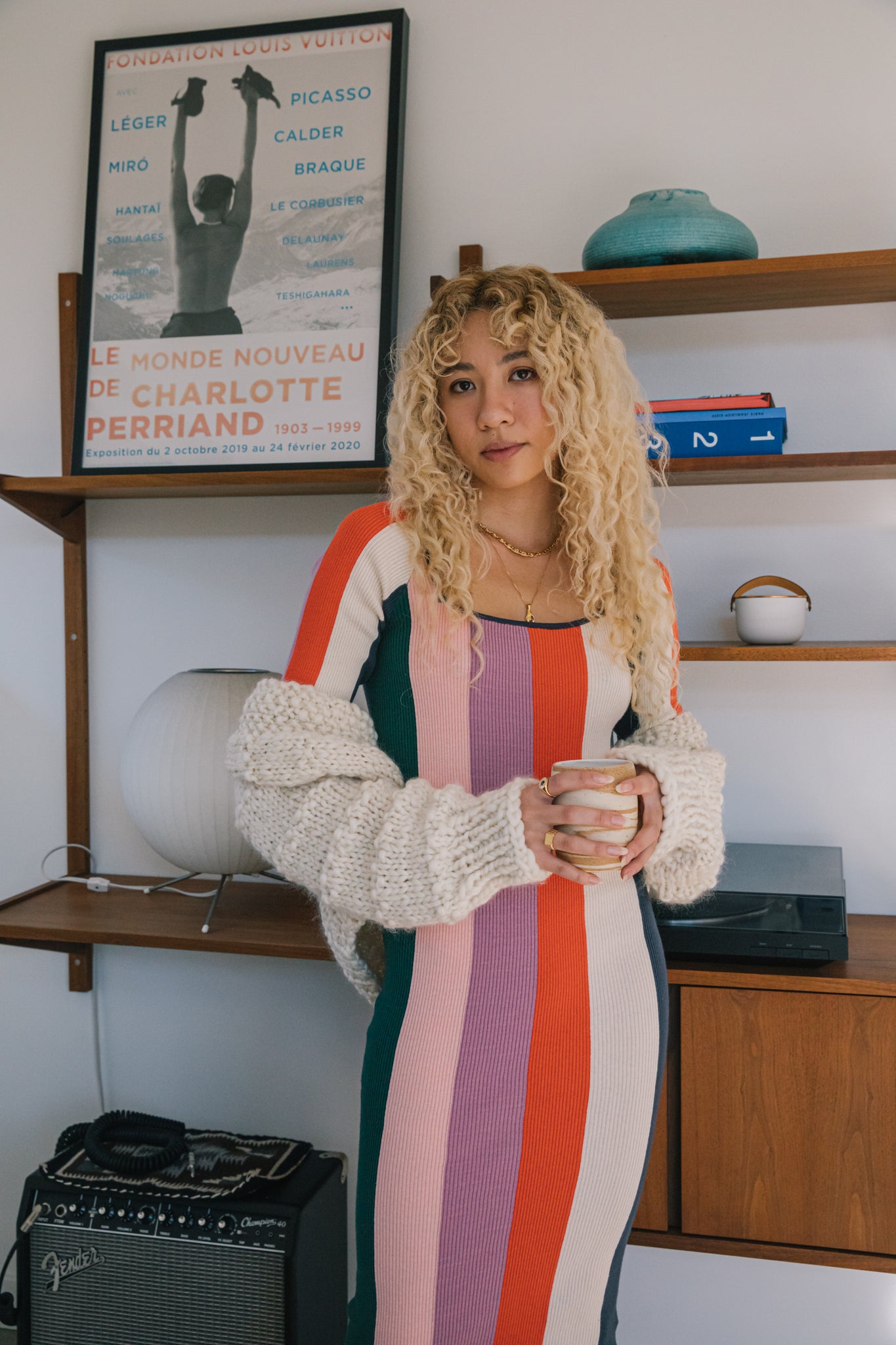 Fitted long sleeve midi dress featuring a square neck and bold ribbed stripe.