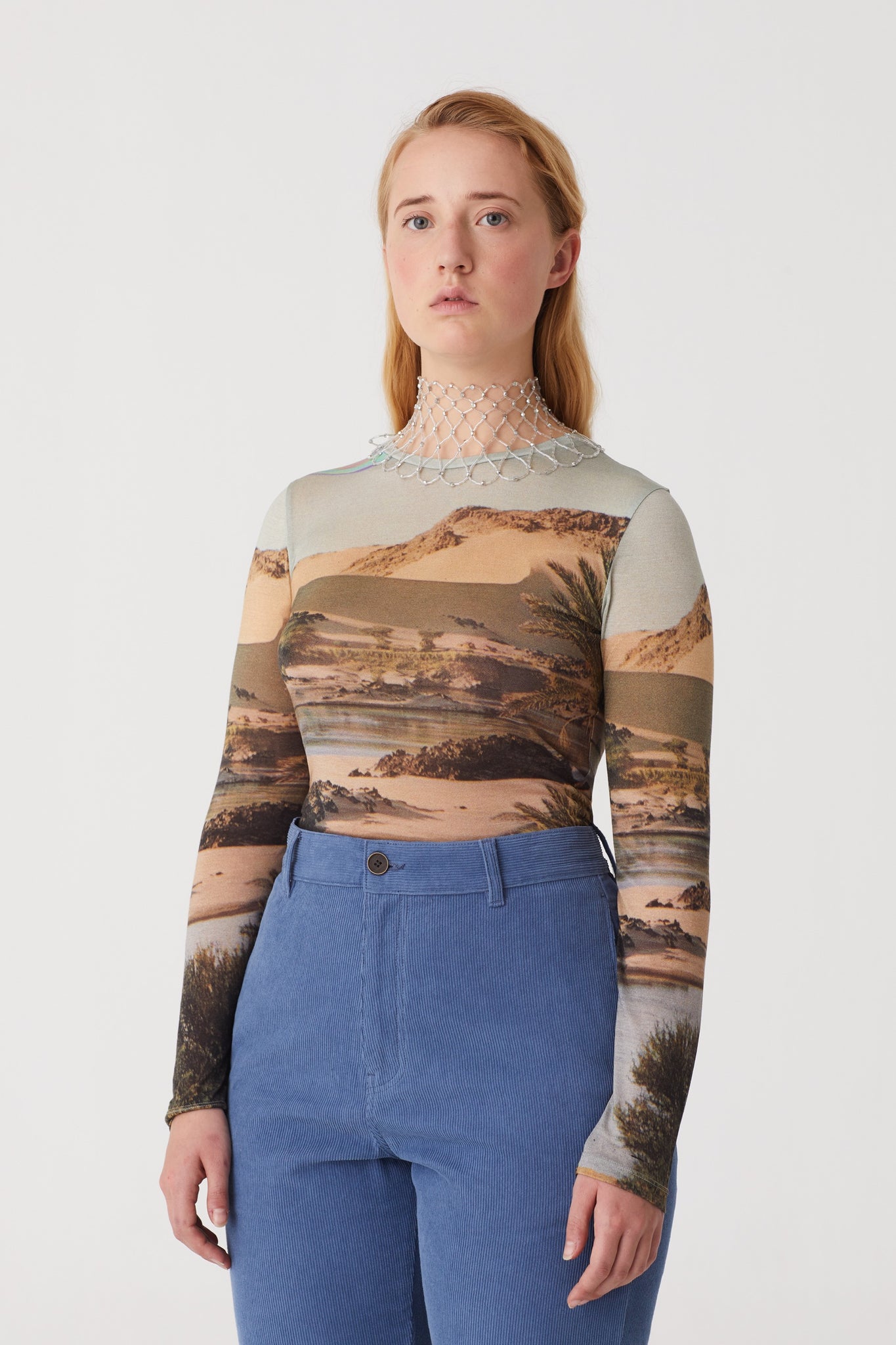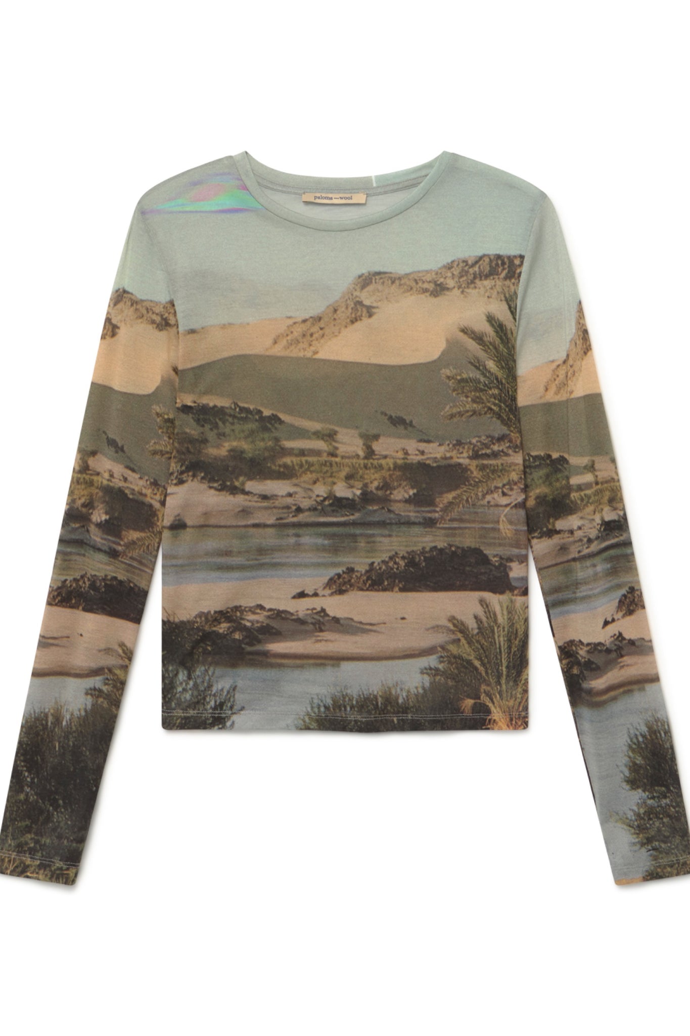 Long sleeve fitted tee featuring a printed landscape in the perfect neutral palette.