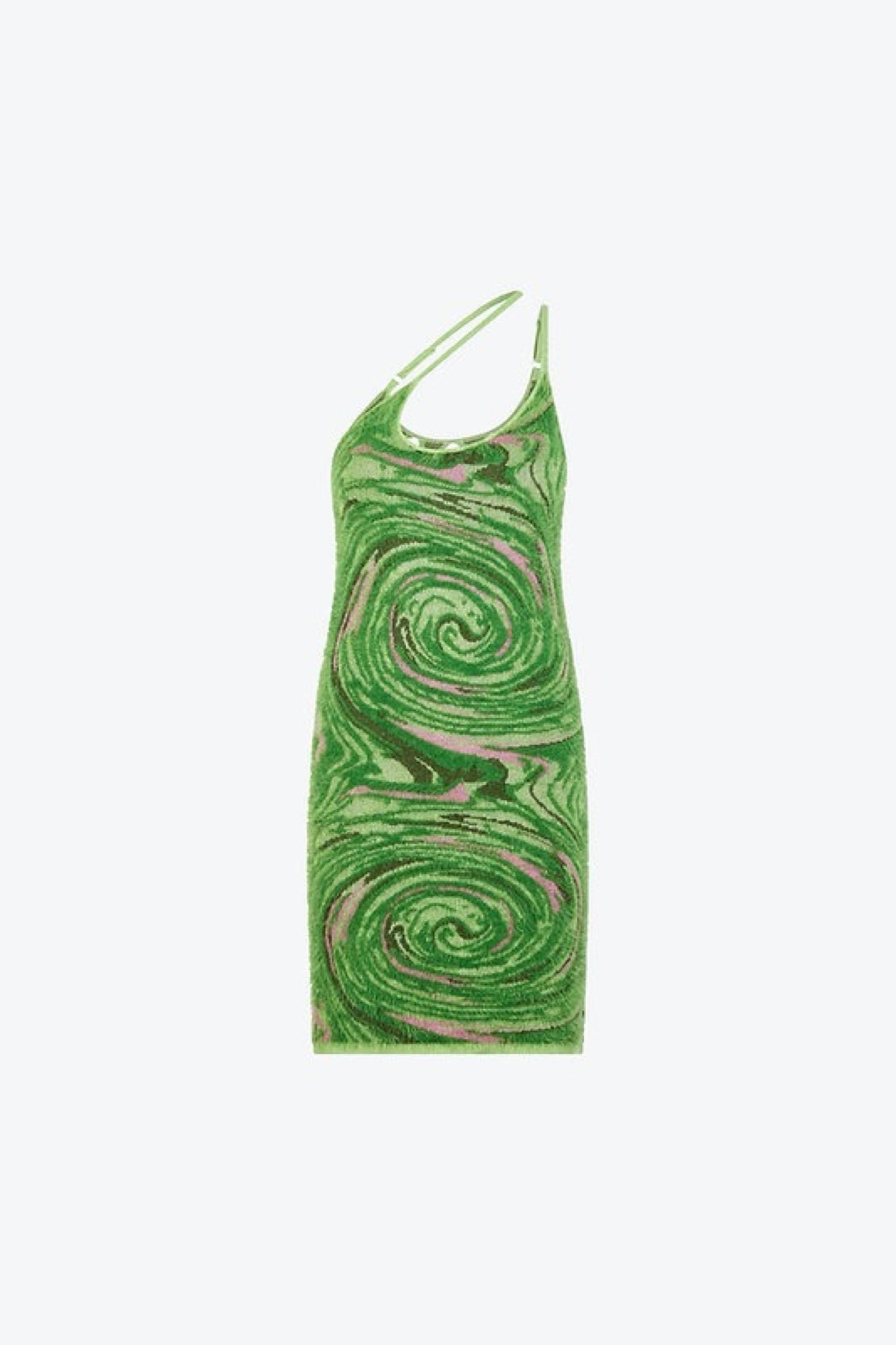 This dress has an asymmetrical single-shoulder strap, alongside a familiar slip-like fit and midi length. It boasts a dramatic cut-out at the back, held in place by a spaghetti strap embellished with four pearly beads. smooth and fluffy touch.