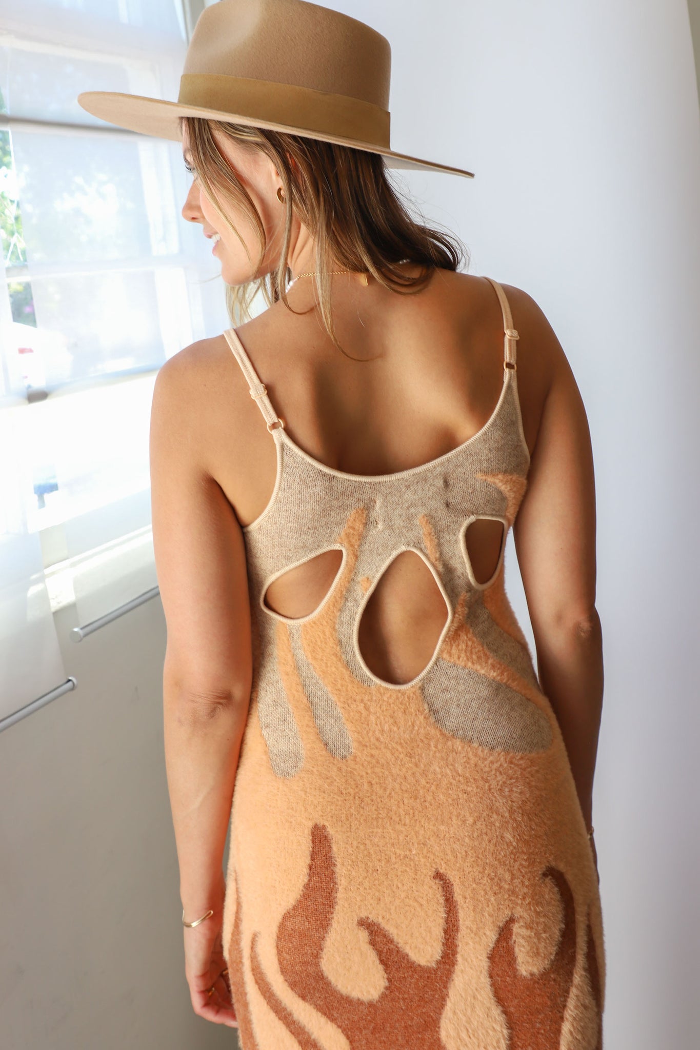Knit midi length dress with back cut out detail and adjustable straps in an exclusive flame motif.
