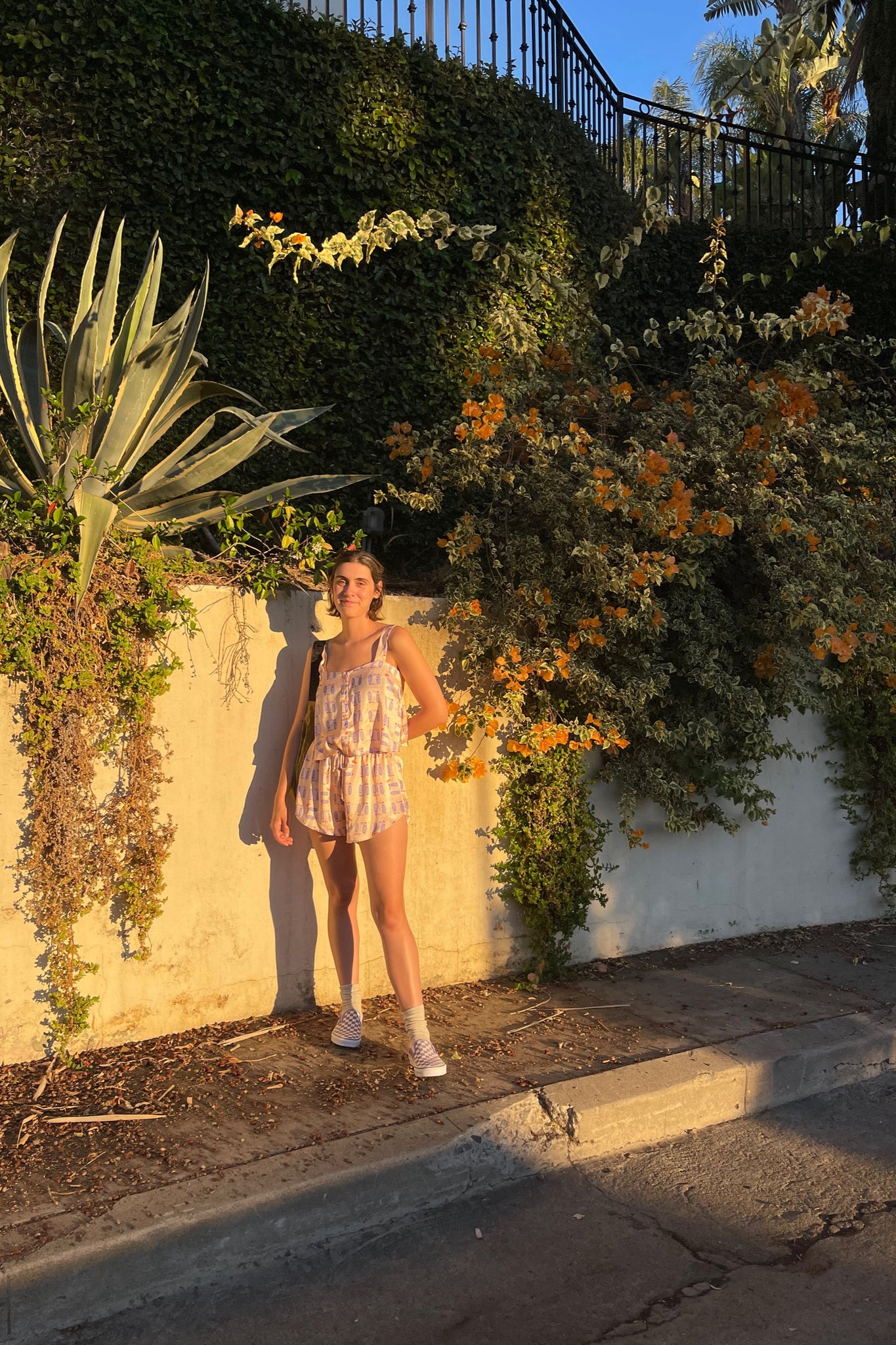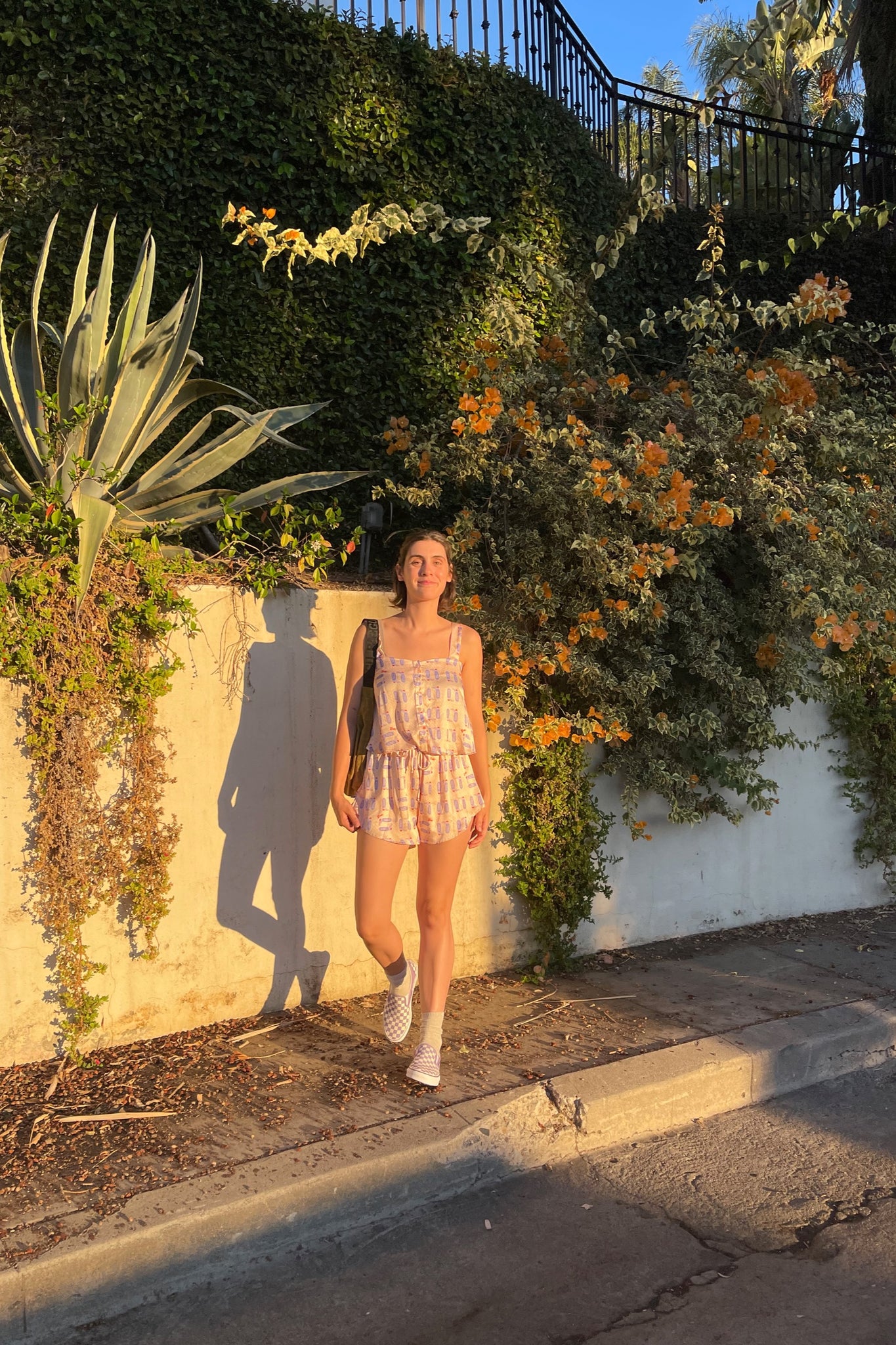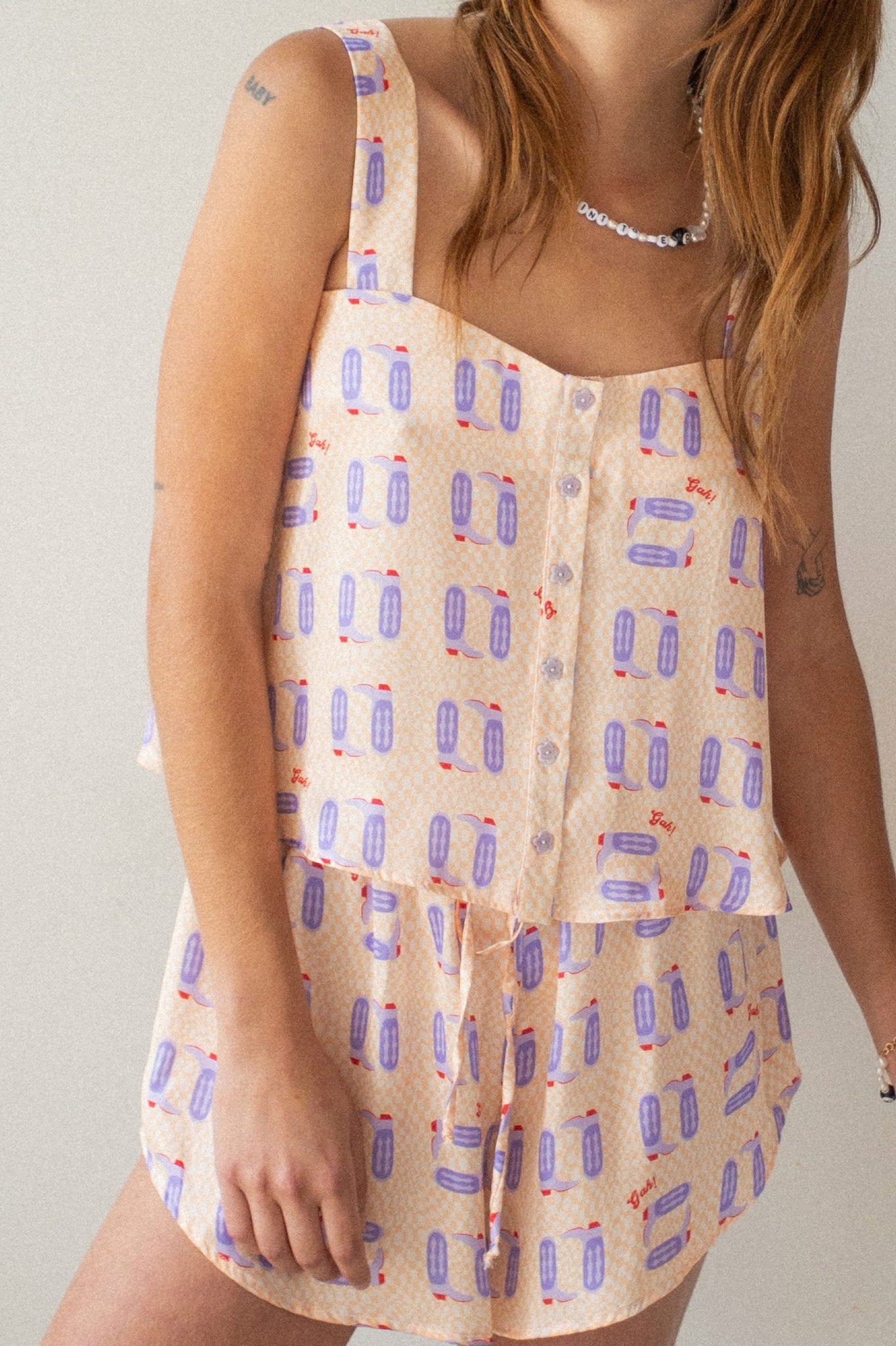 Ultra breezy babydoll tank and short set finished with teeny flower-shaped buttons down the front of the tank.