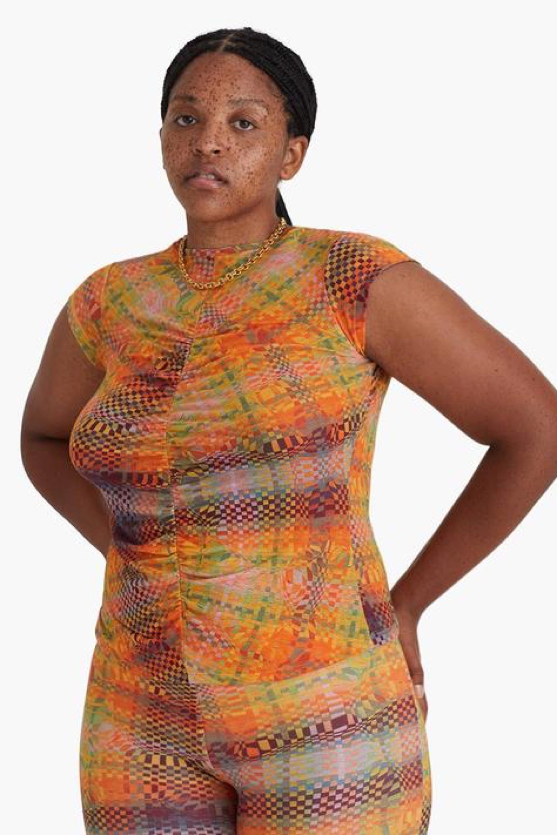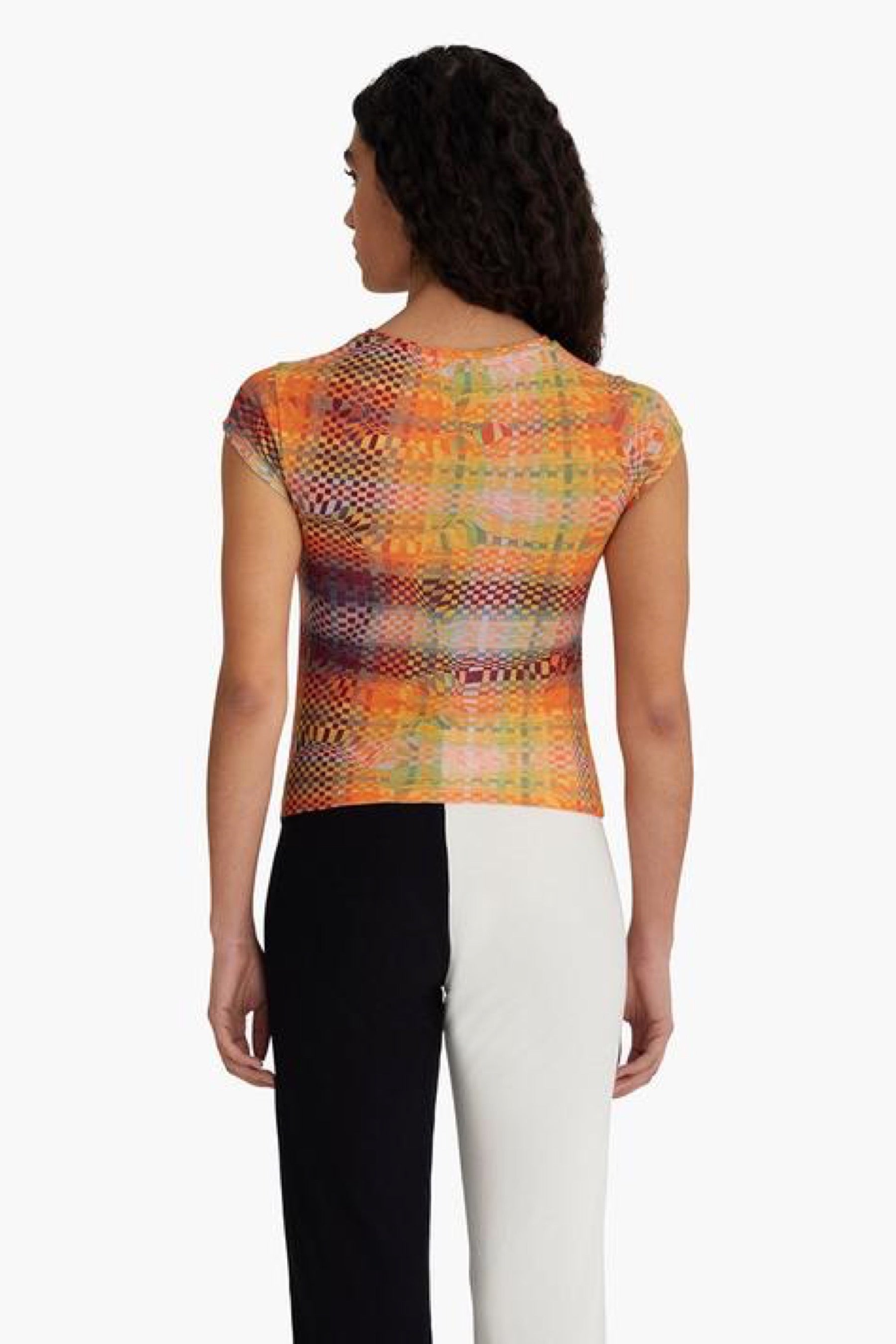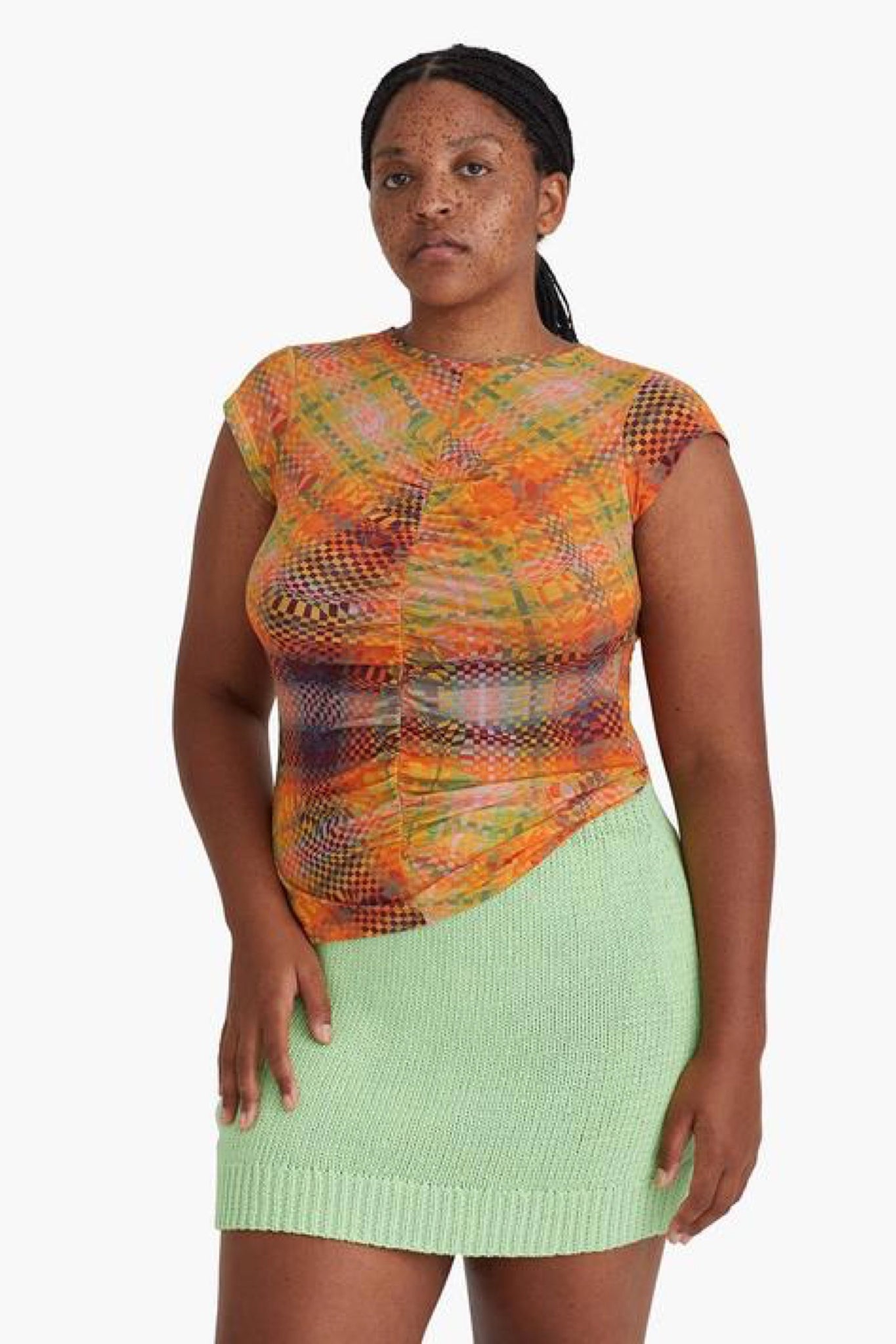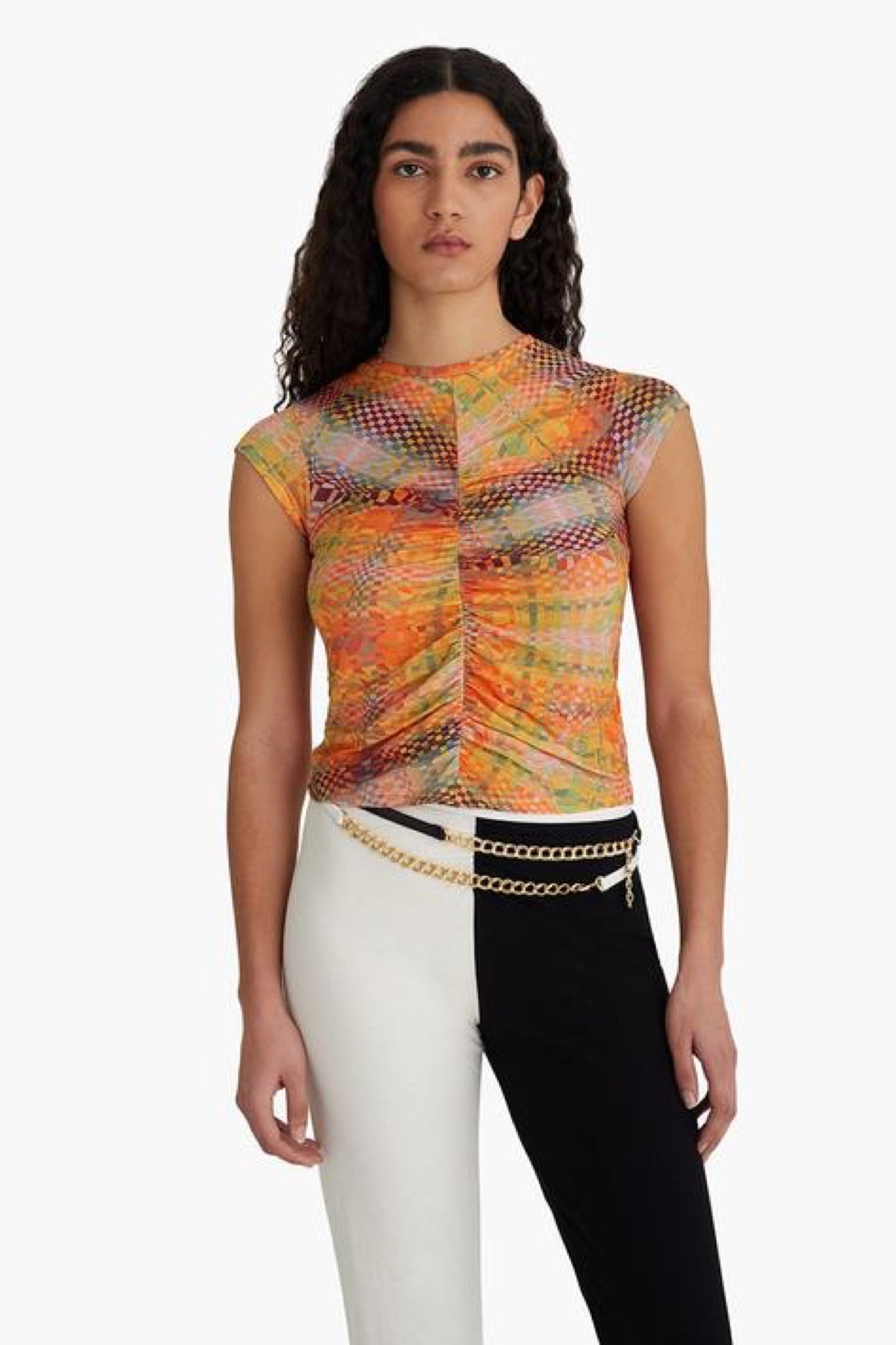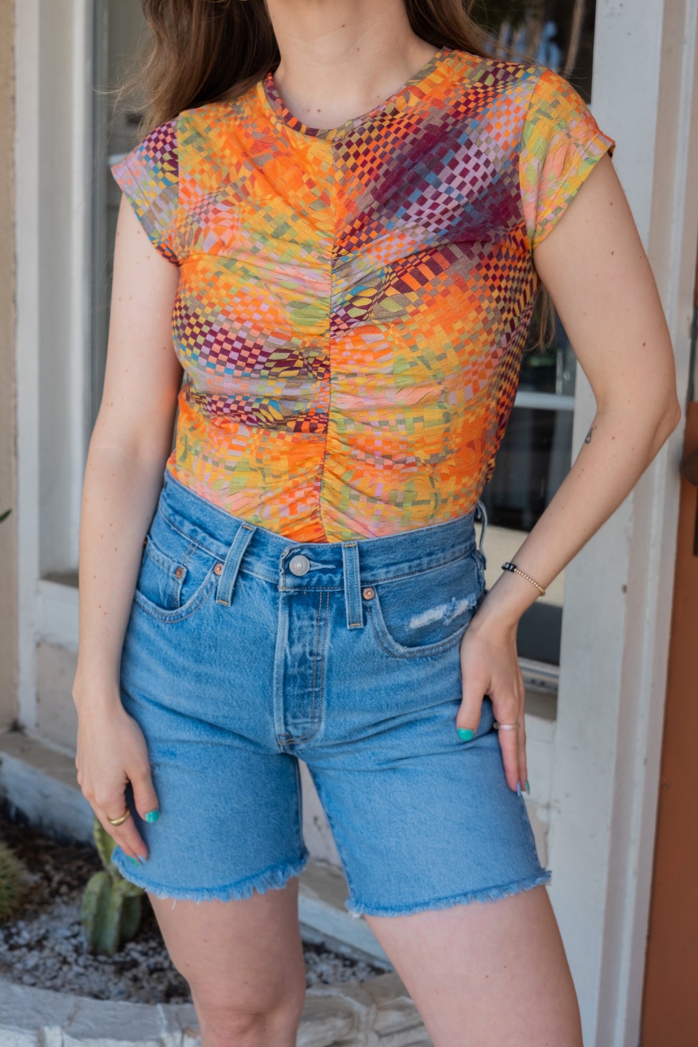 Abstract checkered top featuring a ruched center, cap sleeve and made with eco friendly organic cotton. Print designed by by Julia Esqué.