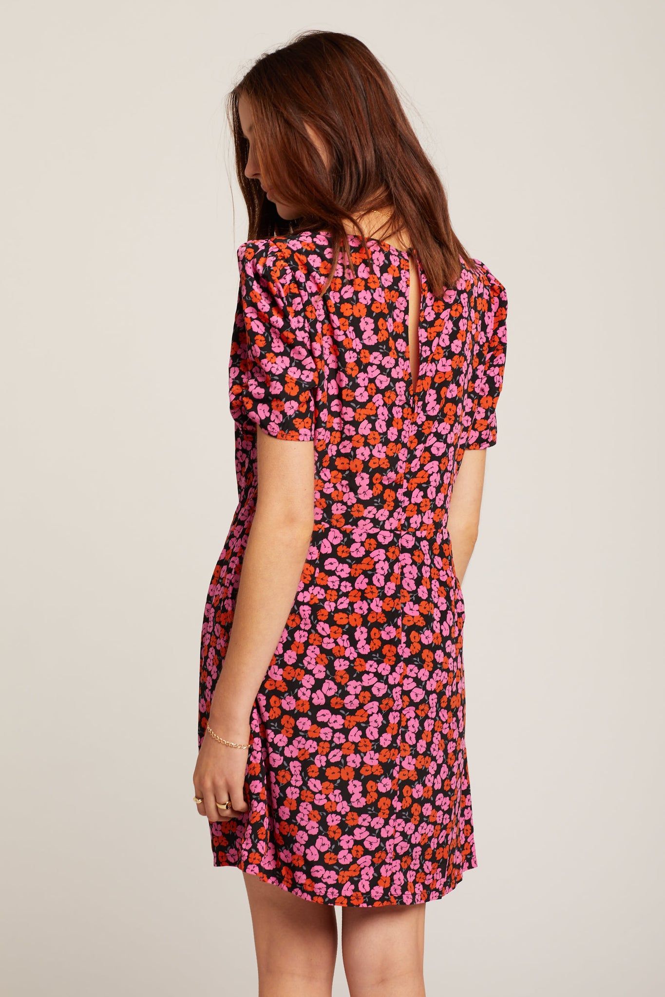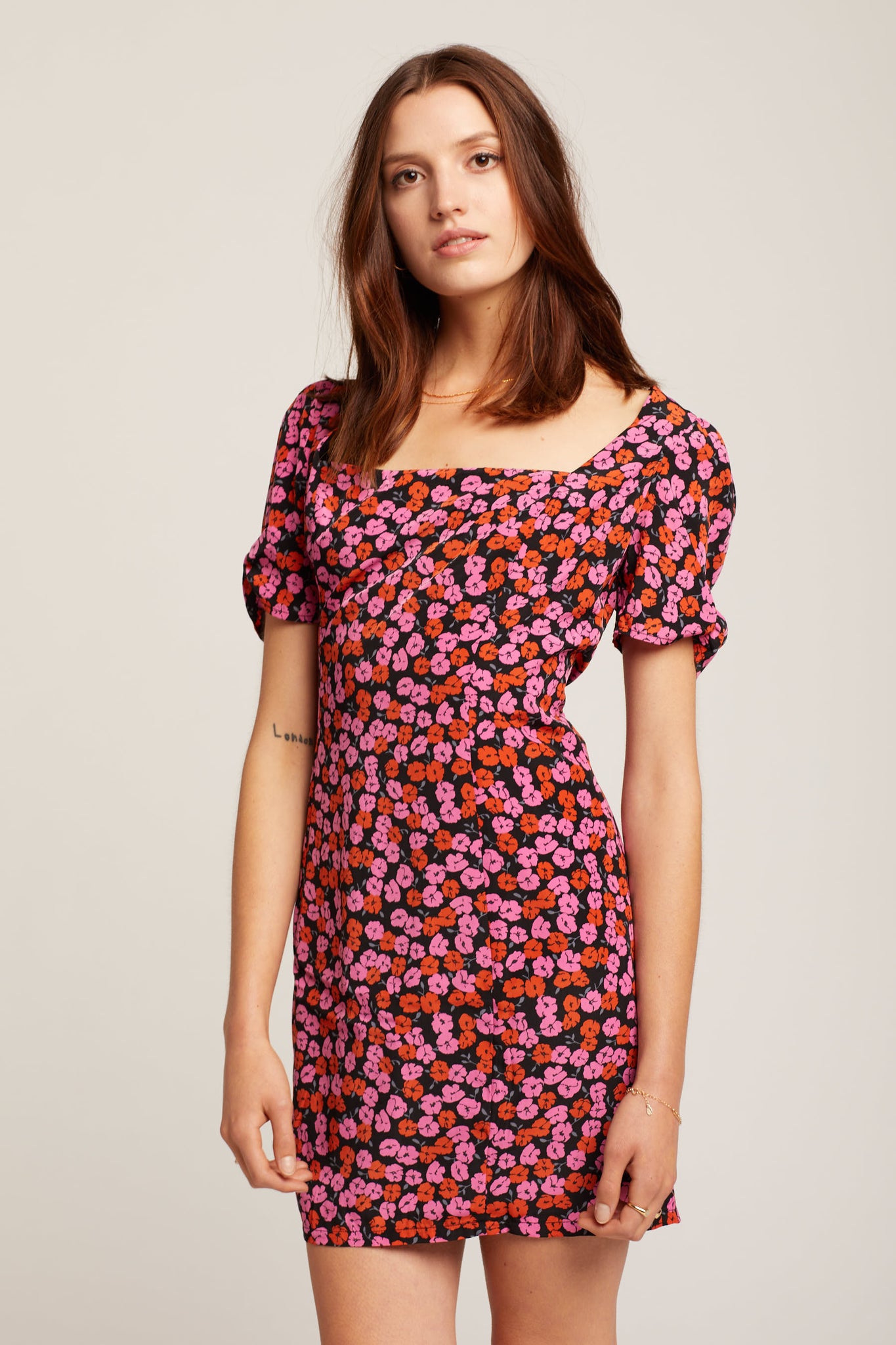 This is the perfect floral print dress for a warm, sunny day. It contains a beautiful bright color palette. Features a straight neckline and a zipper in the back.