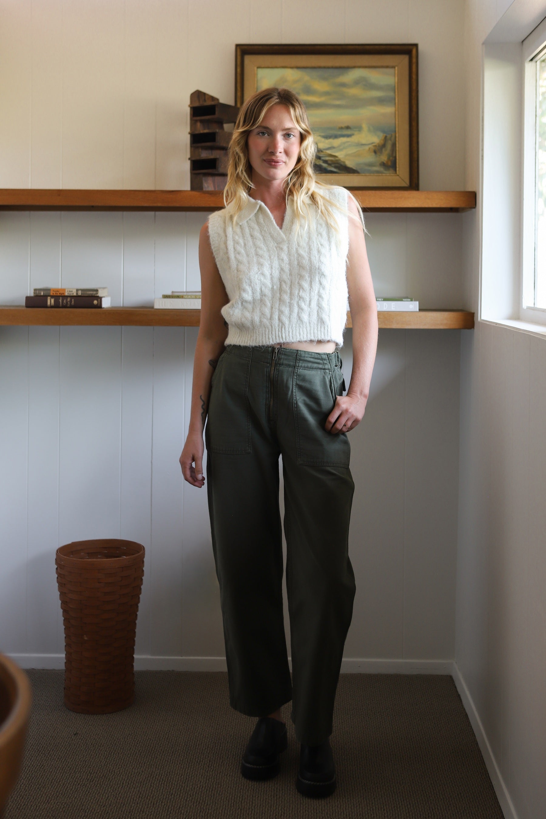 Fuzzy sweater vest with a collar, featuring a cable-knit design. Cropped for a modern fit, combining texture and style.