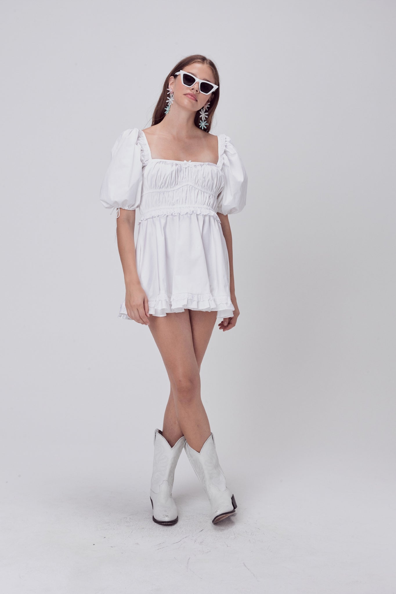 Vintage-inspired cotton poplin mini dress featuring delicate ruffled eyelet trim throughout. Shirred bodice, puff sleeves and side seam hidden pockets. Fit-and-flare silhouette.