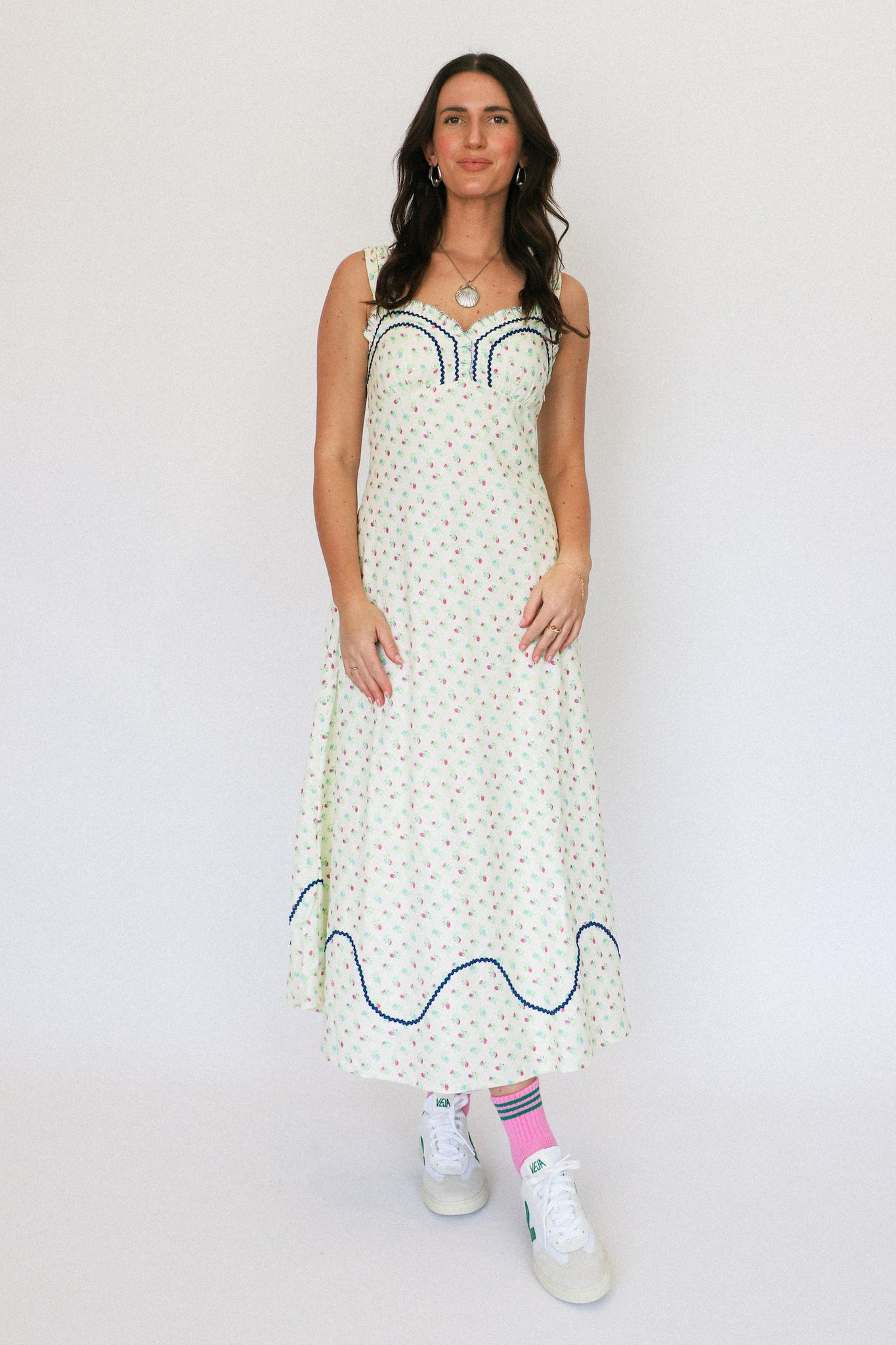 So chic and seriously femme, this flattering midi is featured in a soft cotton fabrication and floral-adorned design with a sweetheart neckline and ruffled trim.