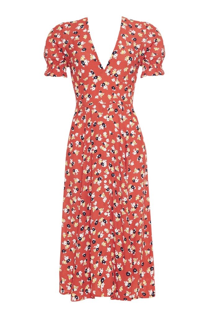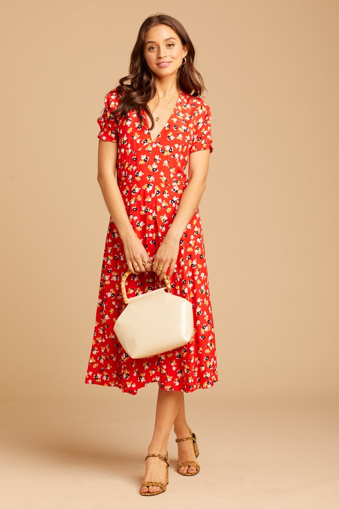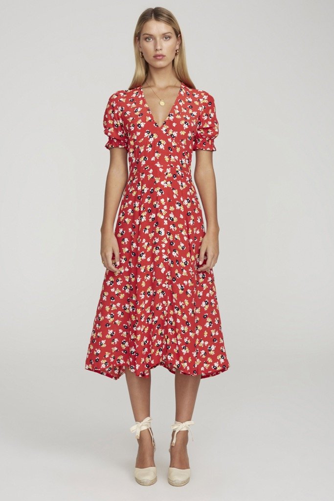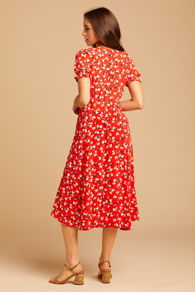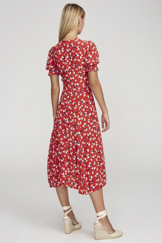 Midi dress with puff frill sleeves, deep V neckline and invisible zipper to the back. Perfect for your Spring endeavors!