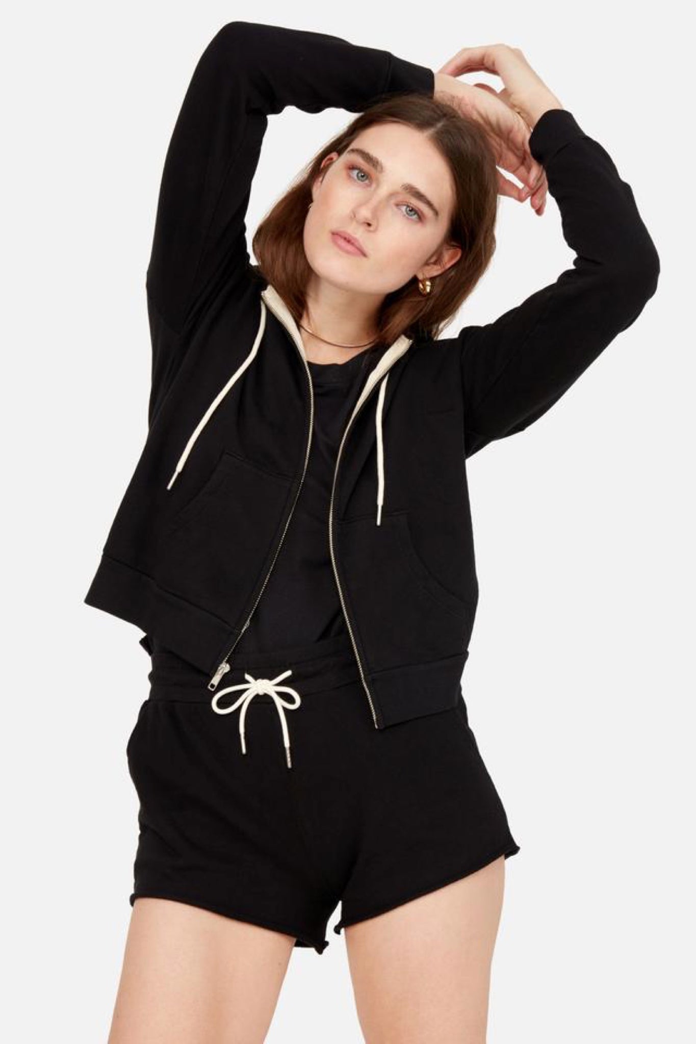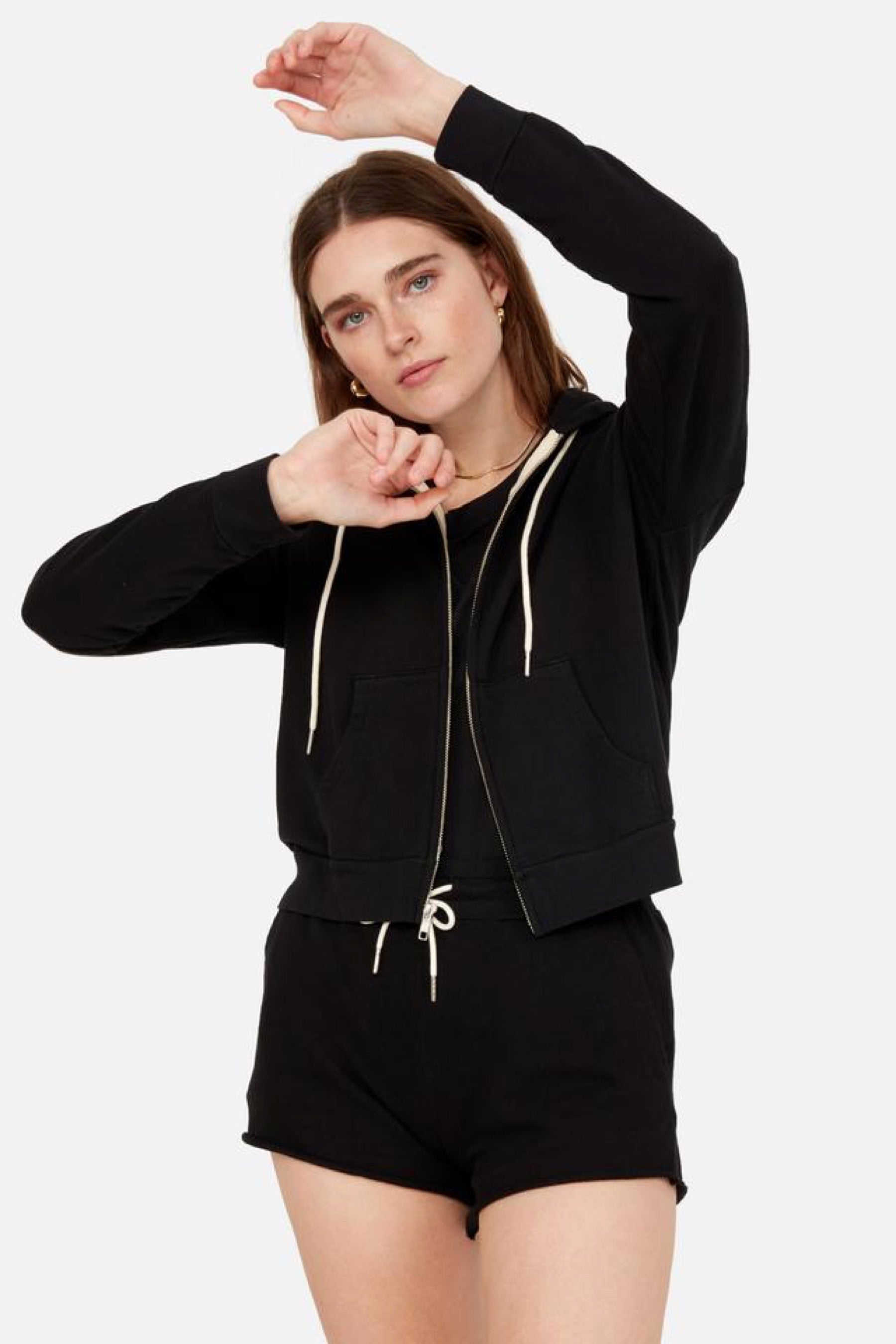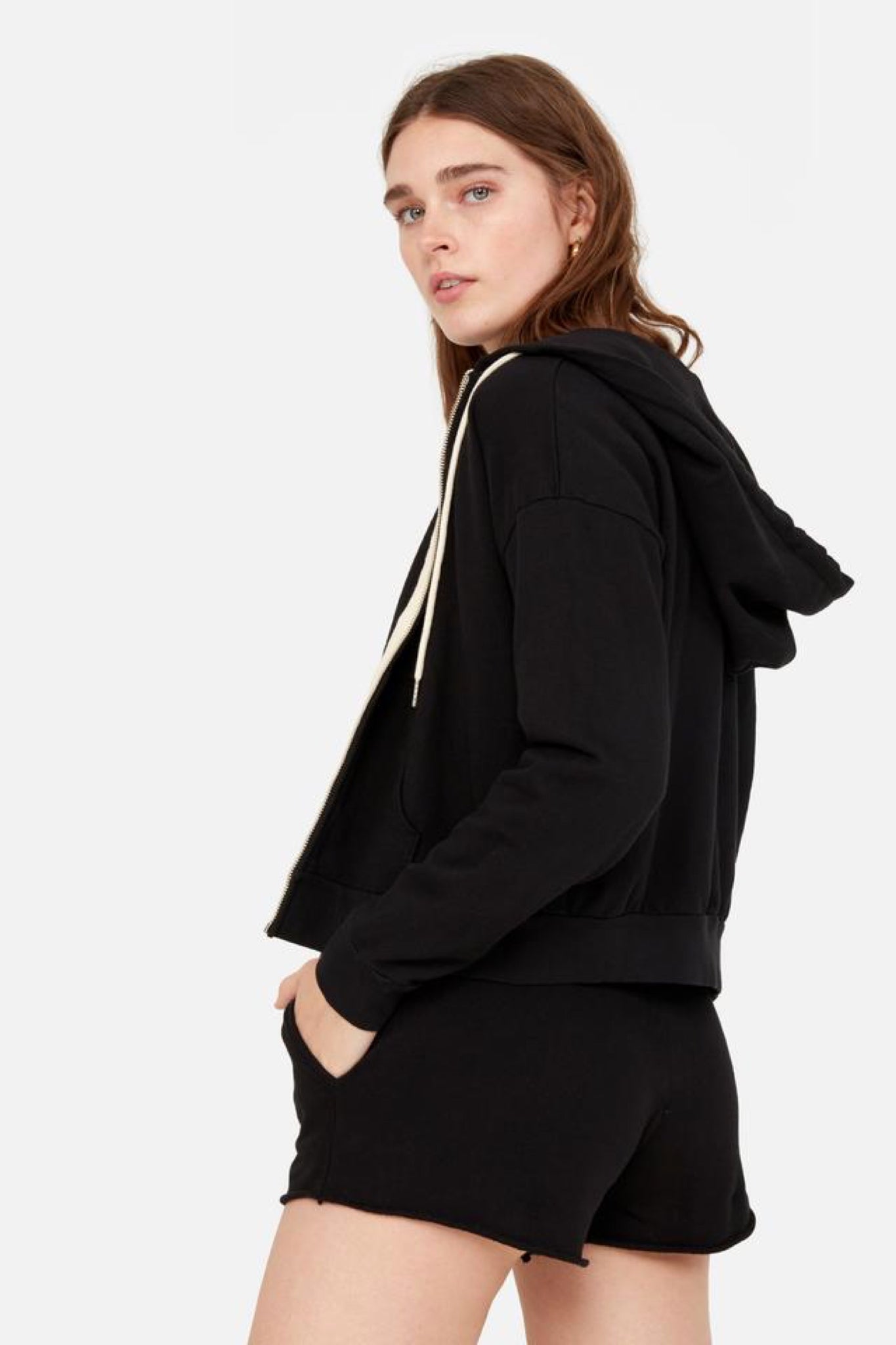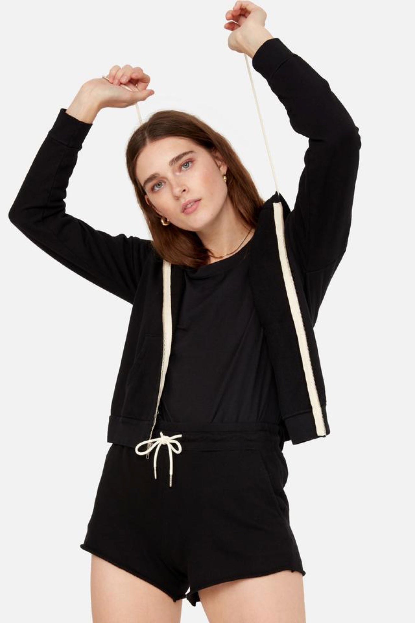 The Classic Hoodie features a natural cord with silver cord ends, silver zipper and raw details.