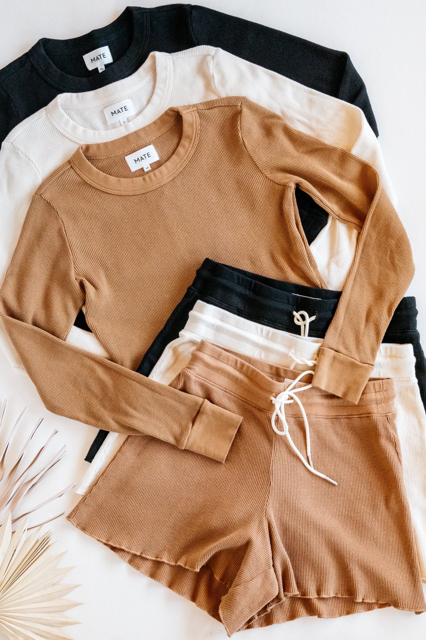 The Lincoln is a relaxed fit thermal short with a drawstring waist and rib waistband.
