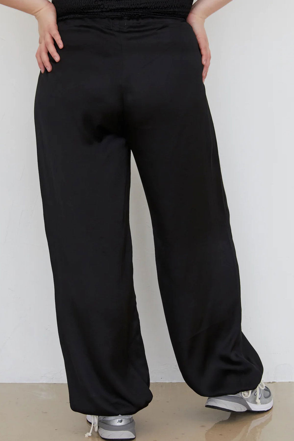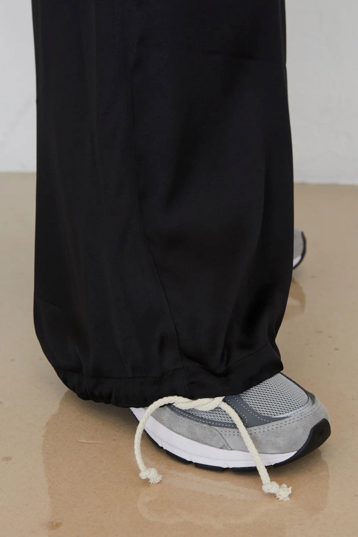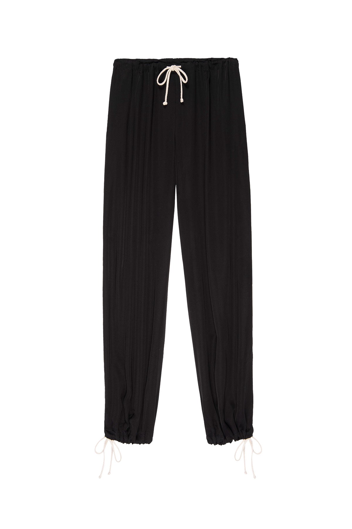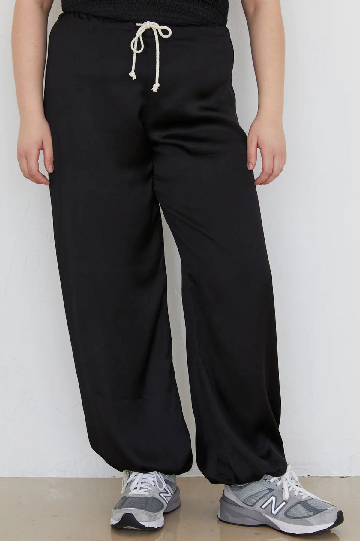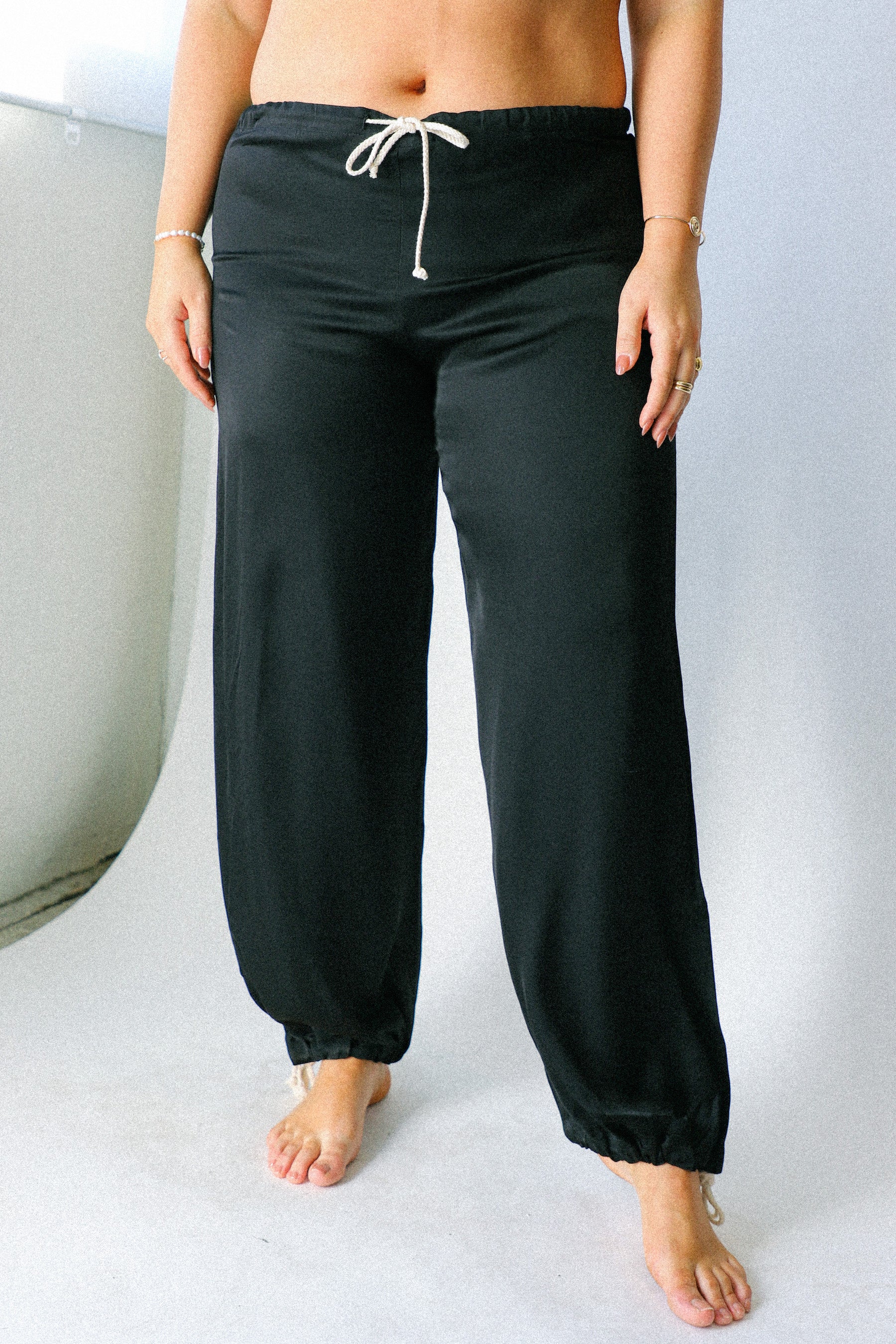 Silky cinch pant with drawcord waist, medium rise and medium wide leg. Finished with rope tie string cinch detail on each ankle. Set in a lightweight, breathable and luxe silky fabric equally perfect for a dinner date or beach days. Made in LA.