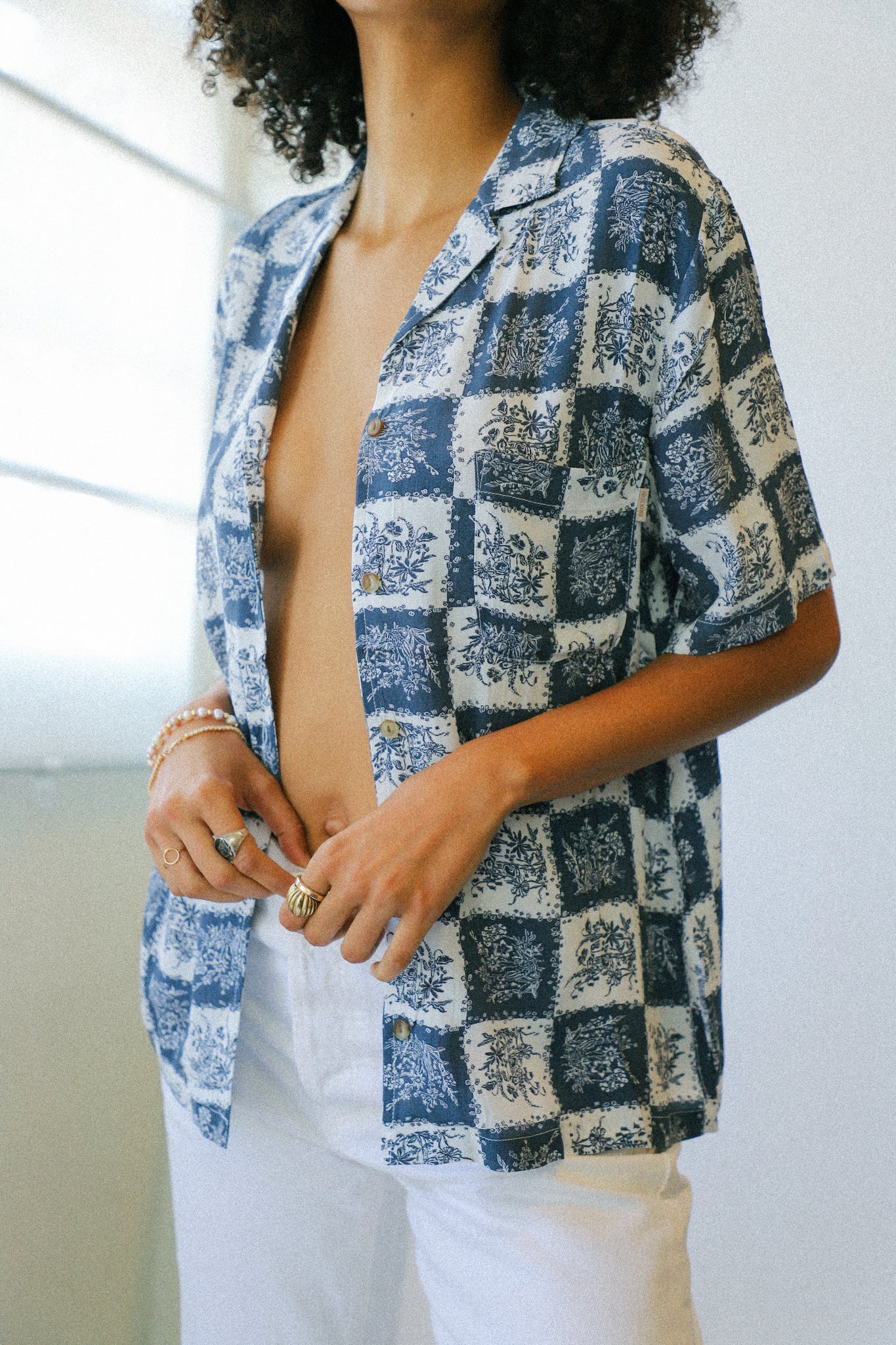 The Bunker Patchwork Boyfriend is a short-sleeve button-up with a relaxed fit. Crafted from draping moss crepe viscose, it has a relaxed, notched collar.