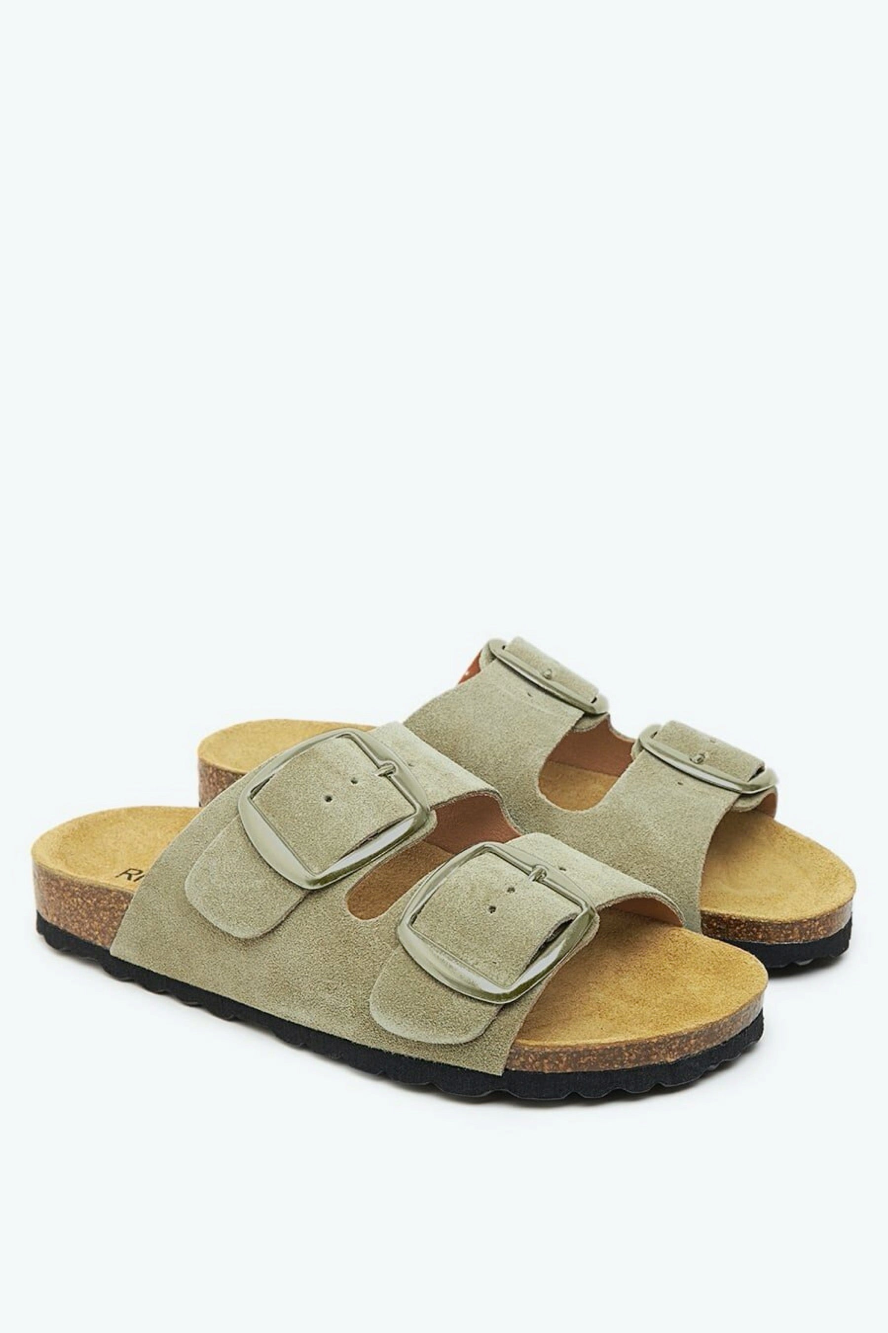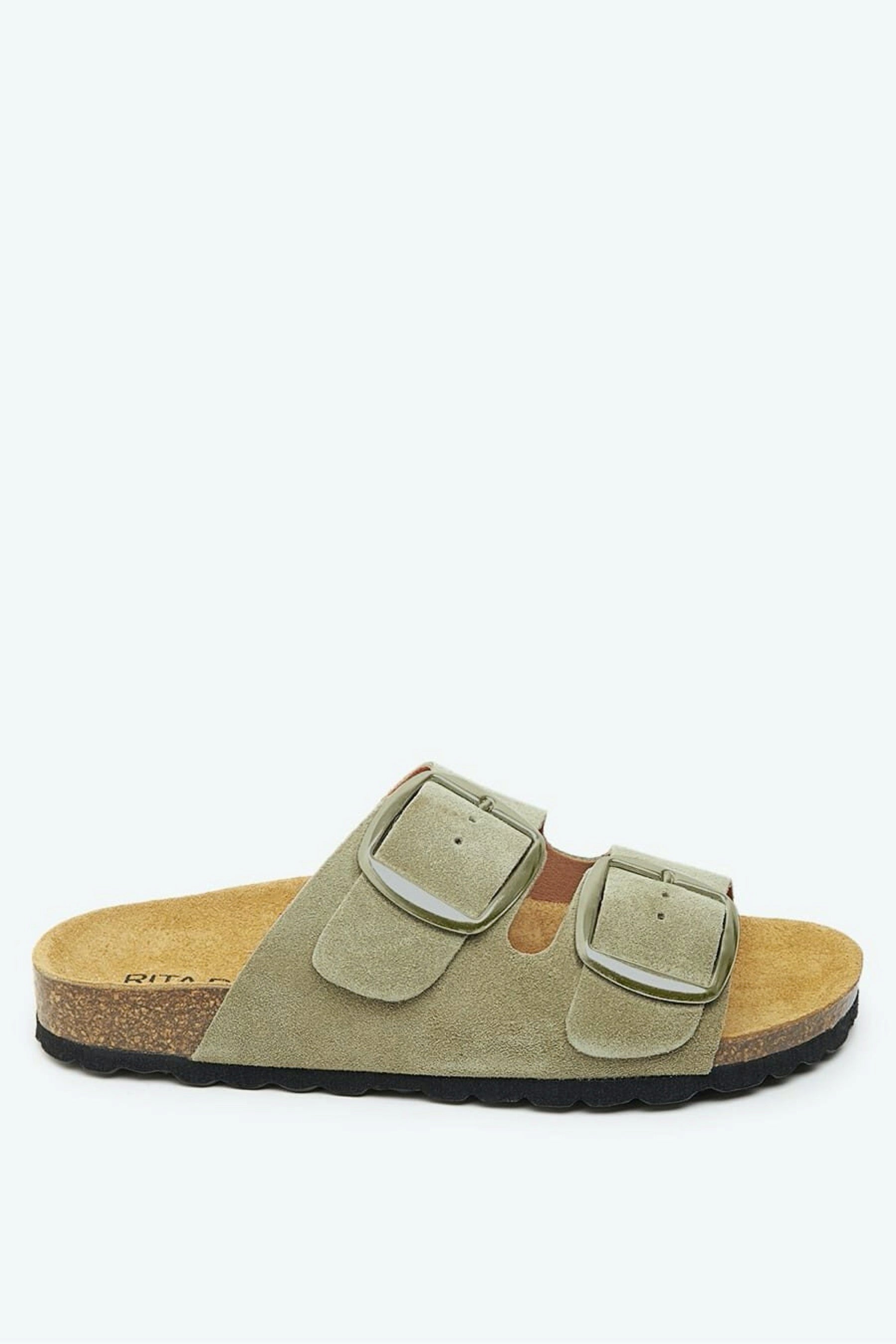 Soft suede two strap sandal featuring tonal buckles and a cork footbed. Ethically made in Spain.