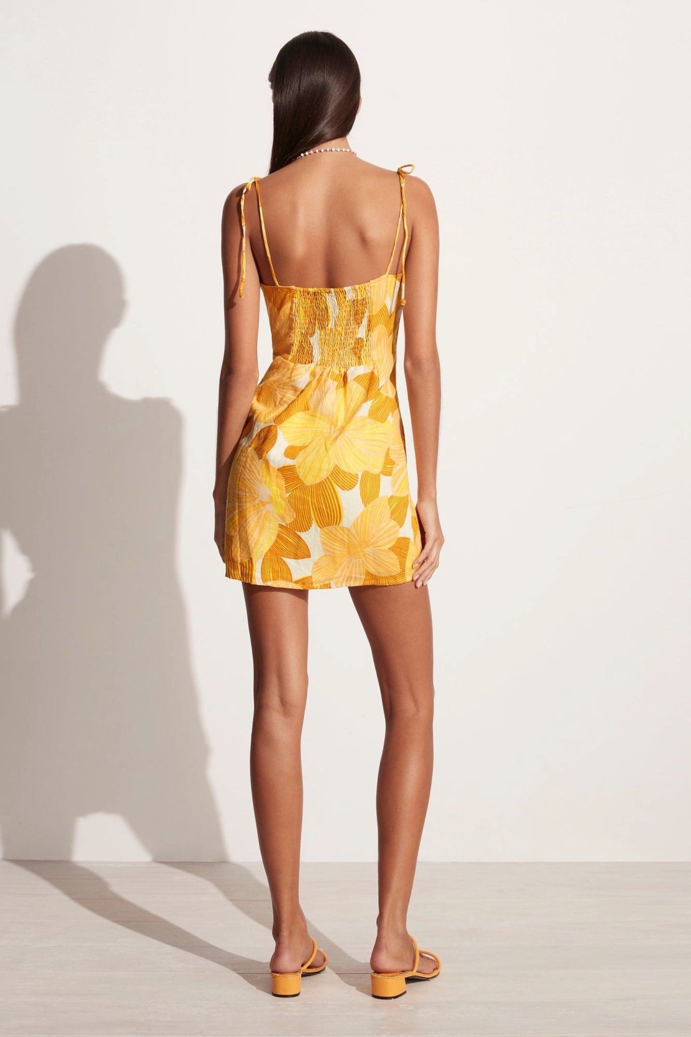 Inspired by a summer spent along the coastline of Careyes, the effortless Ysla Mini Dress has been hand-printed in a sun-drenched La Marieta Floral Print. This style offers a square neckline, rolled over shoulder tie straps and a shirred panel through the back.