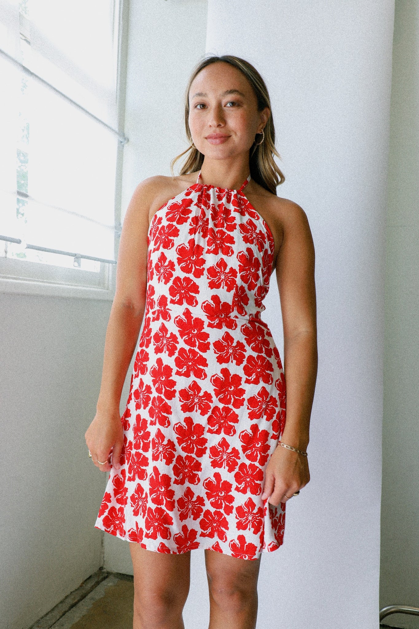 The Gaia Mini Dress flatters with a fixed waistline, slip mini skirt, high neckline and an open back with adjustable neckline ties, the Gaia Mini Dress is the perfect balance between playful and feminine. Fully lined.