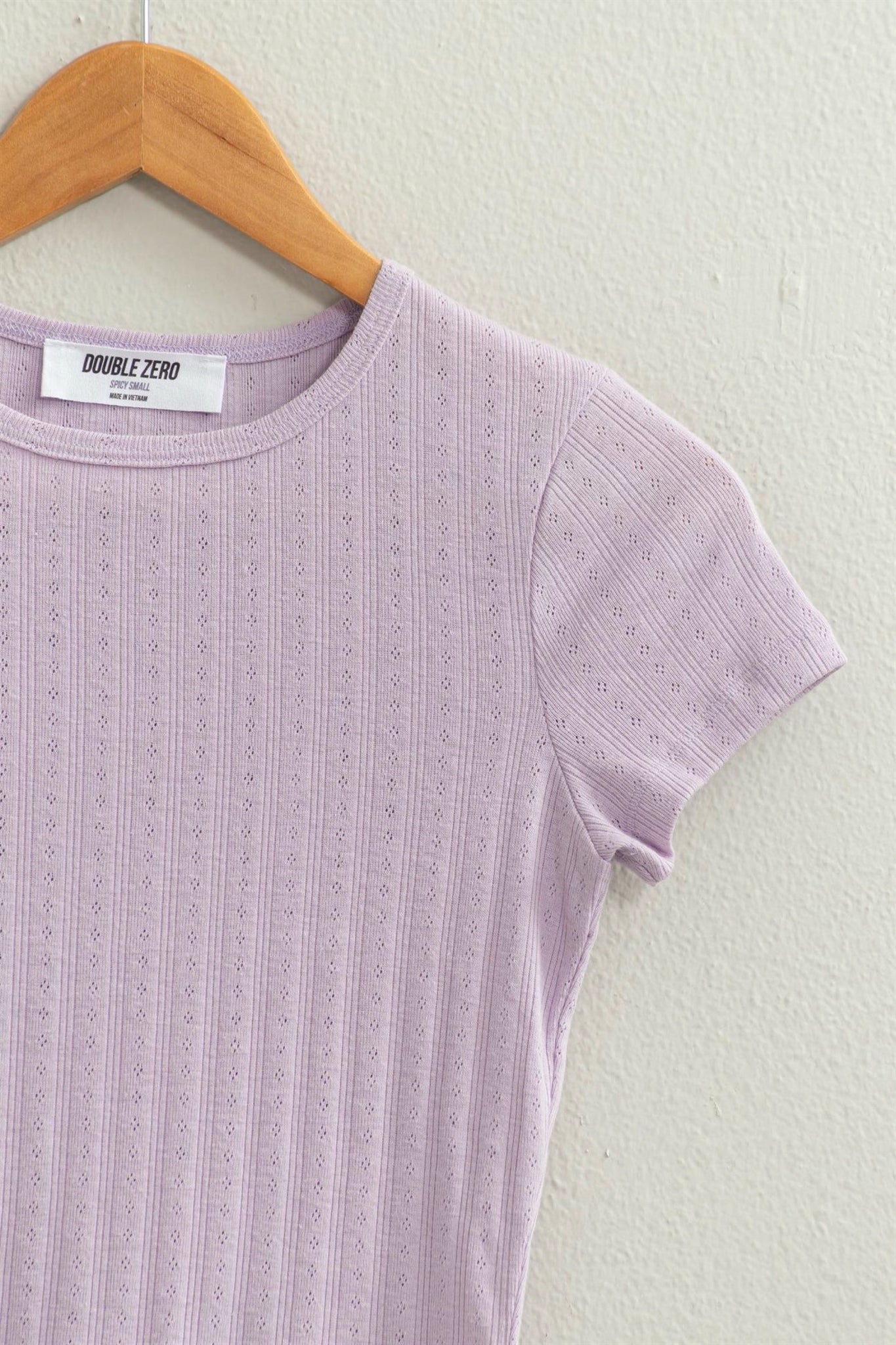 This Lavender Pointelle Casey Tee features a delicate pointelle design and a cropped, baby tee silhouette. Made from soft and breathable material, this tee is the perfect combination of style and comfort.