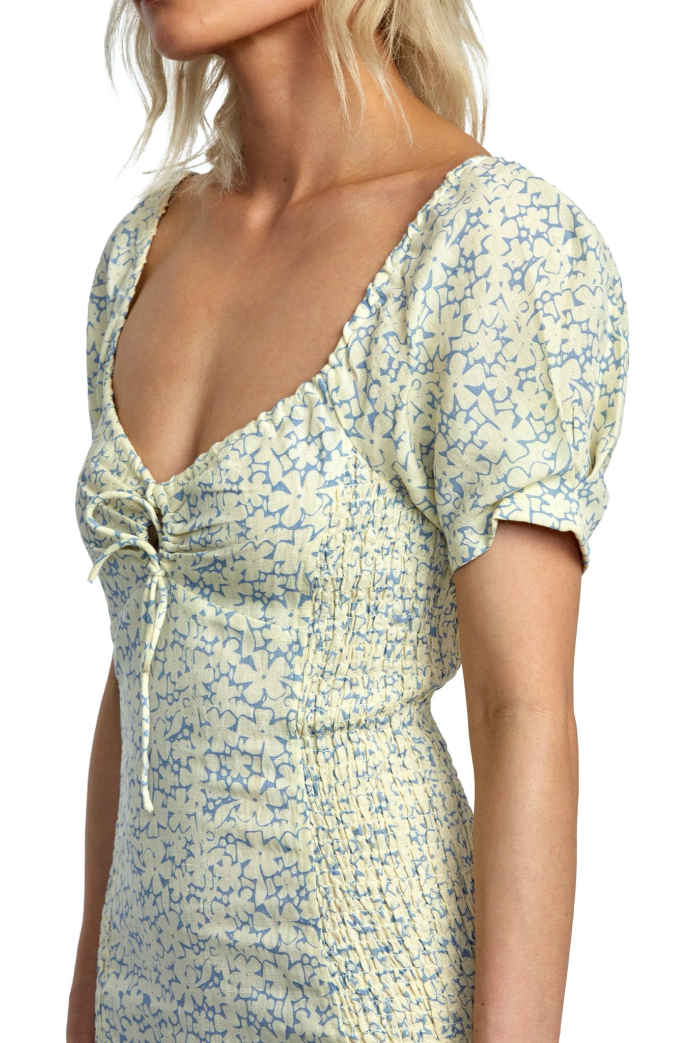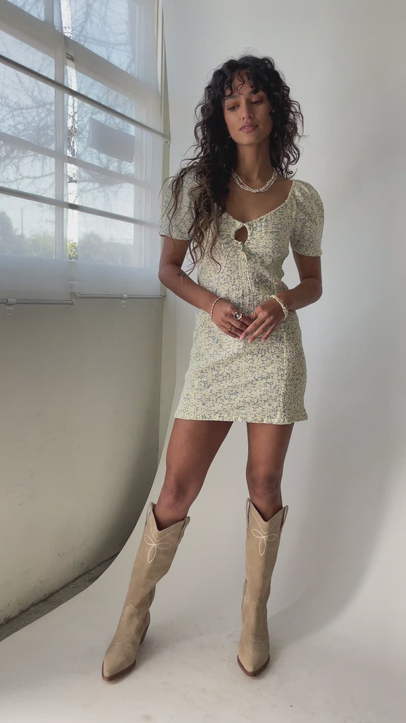 This floral mini dress has all the pretty details, puff sleeves, empire waist and smoked side panels to hug your figure.