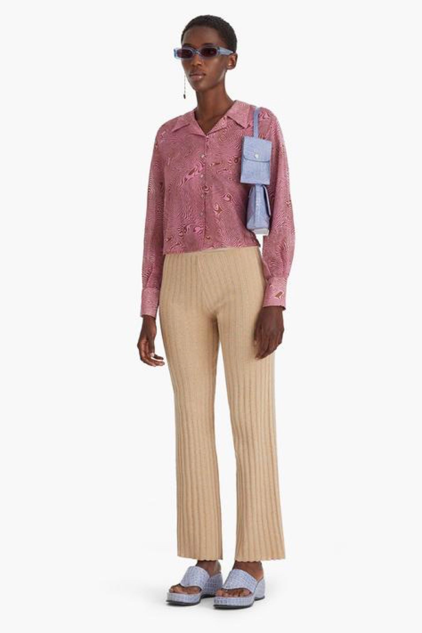 Slightly puffy long-sleeved soft pink shirt with Huella print.