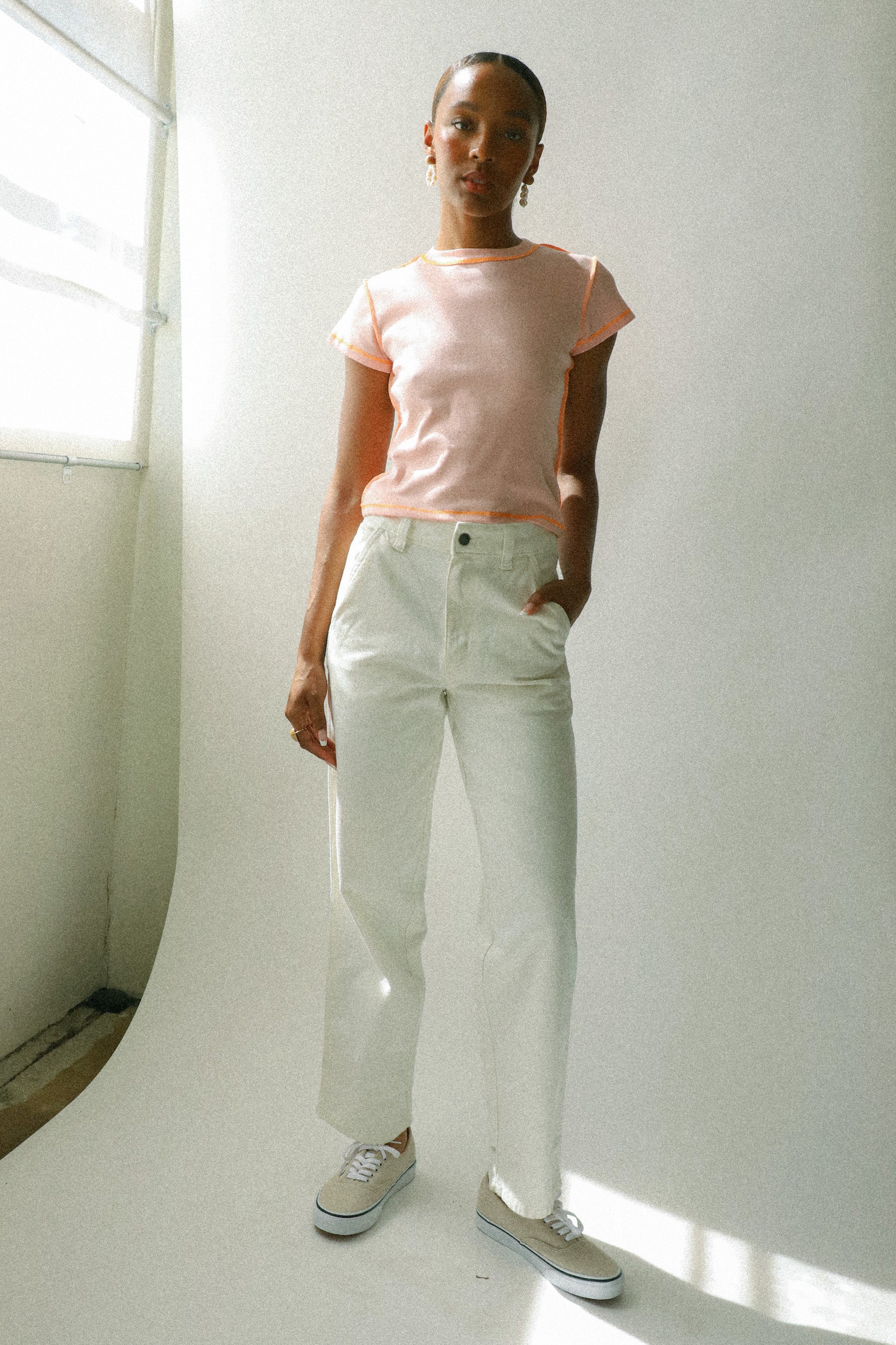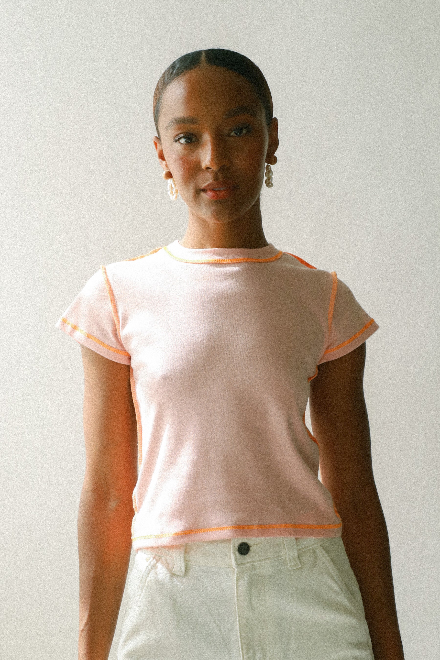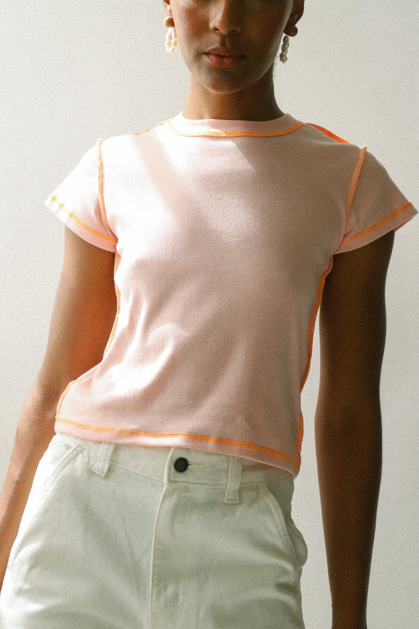 With its contrast stitch and irresistibly soft fabric, this cool light pink and orange baby tee is the perfect staple to add to your closet.