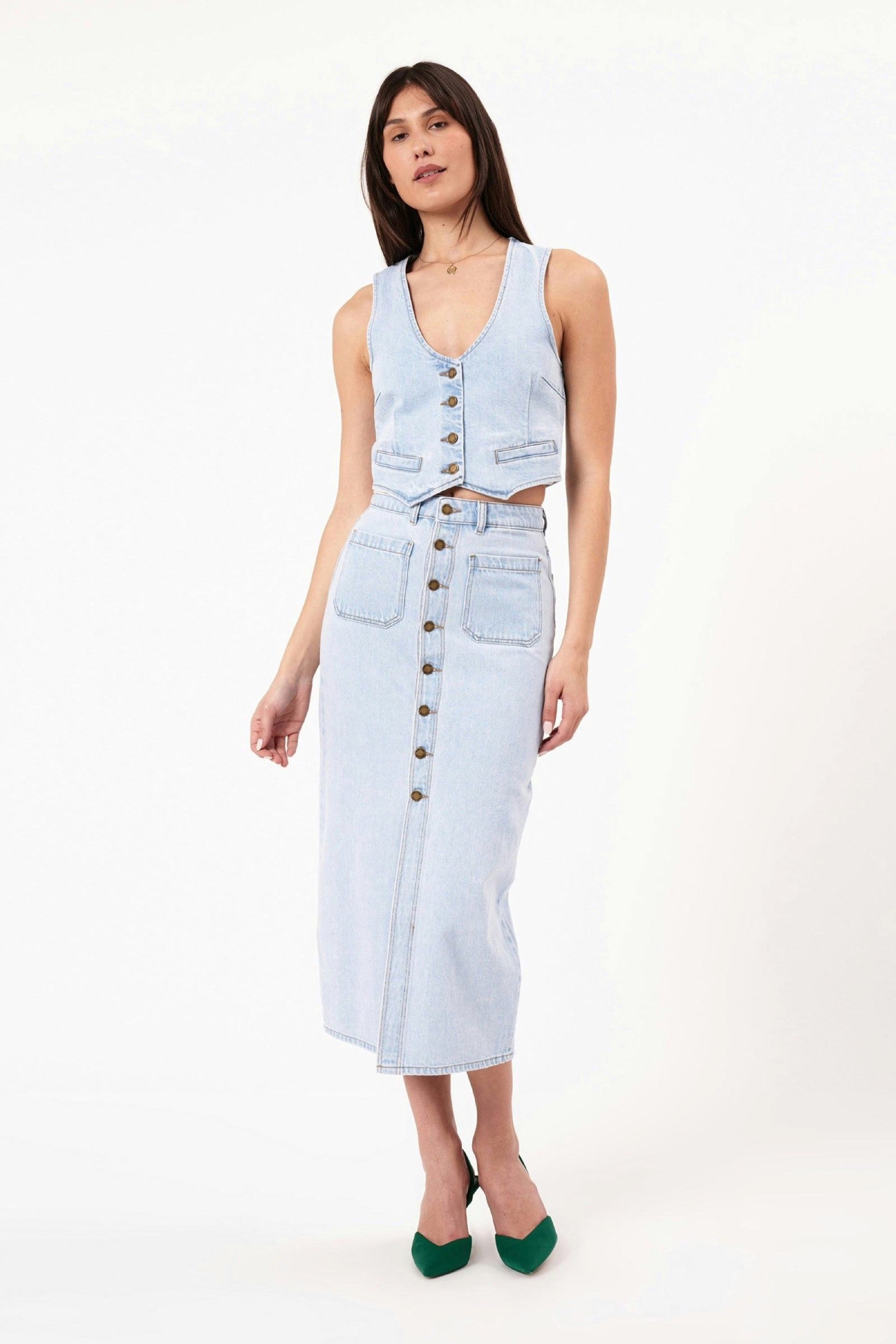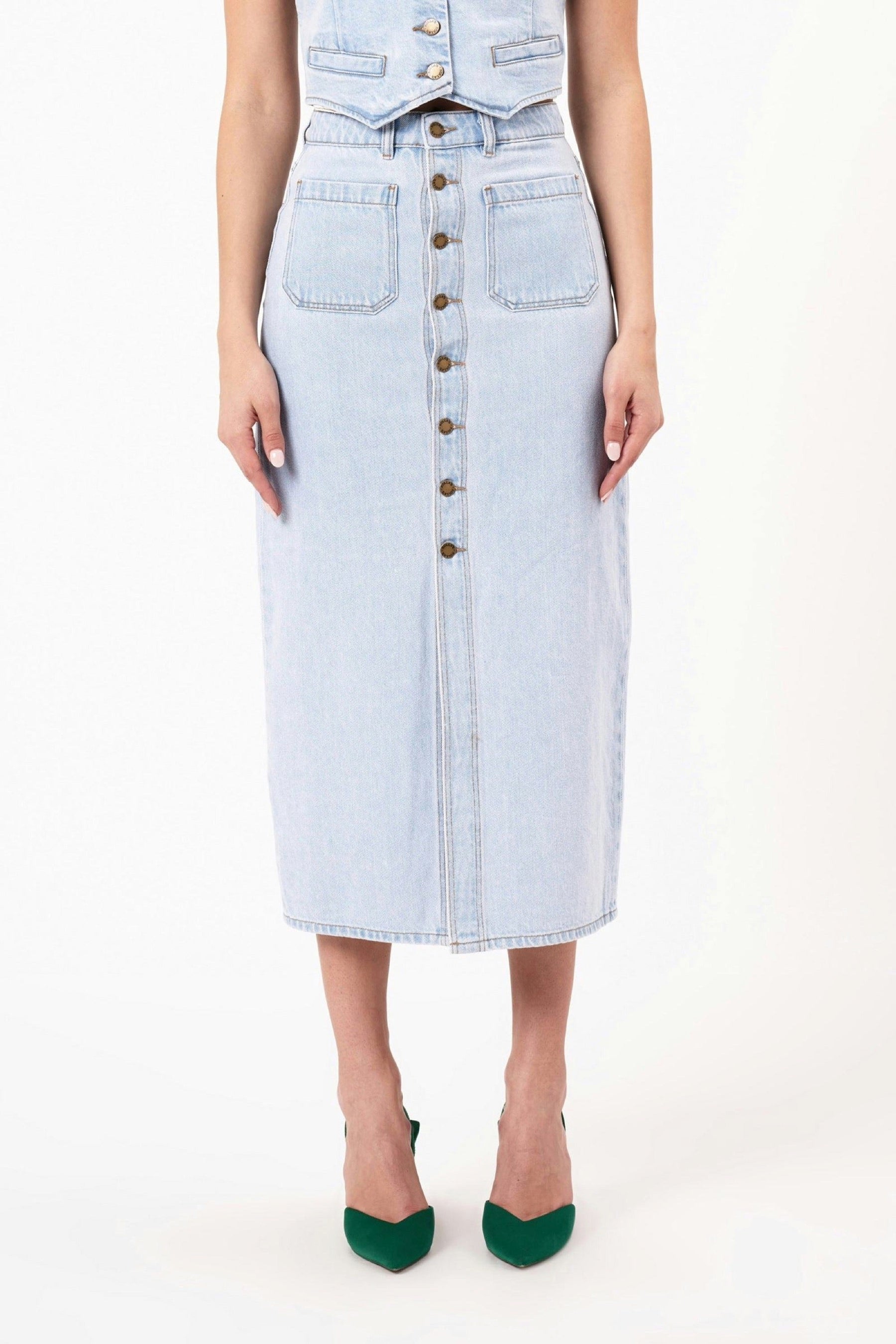 The high rise and slim fit of this long skirt will flatter your figure, while the Rolla's signature back pockets and sailor front patch pockets add a touch of whimsy. With a light blue wash and vintage logo buttons, this skirt is both playful and stylish.