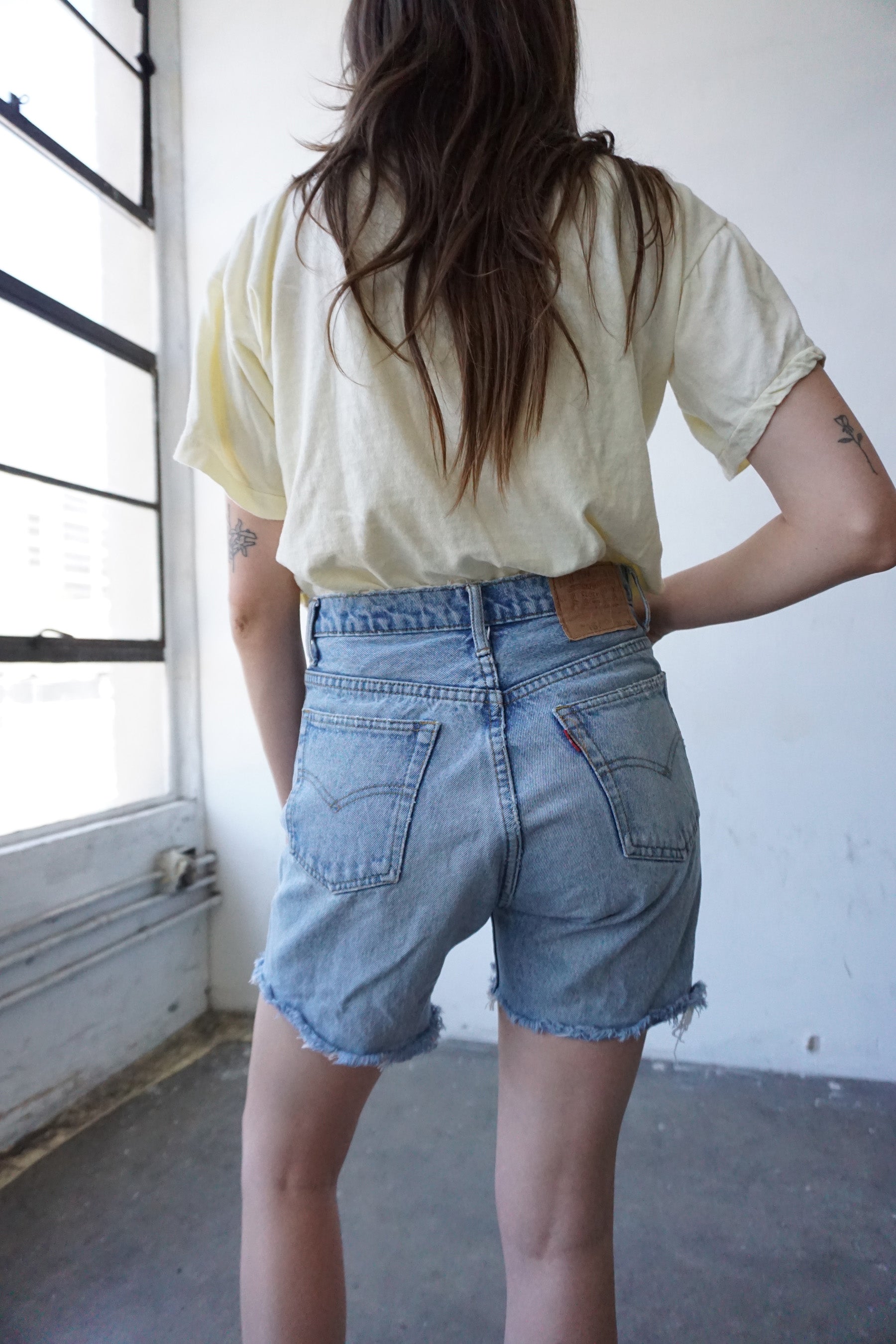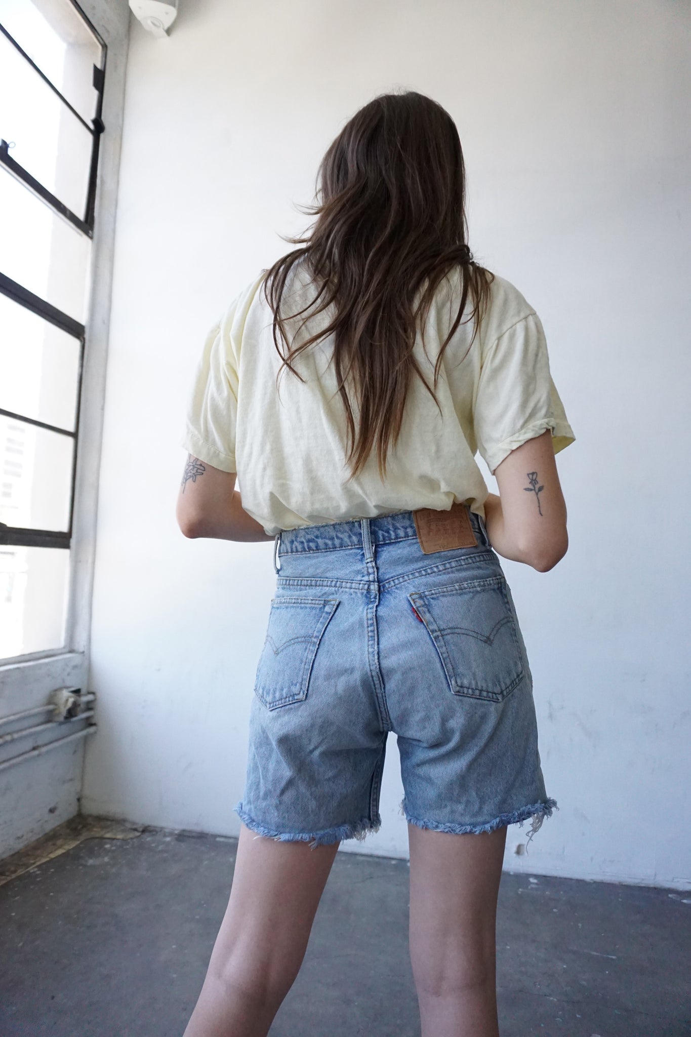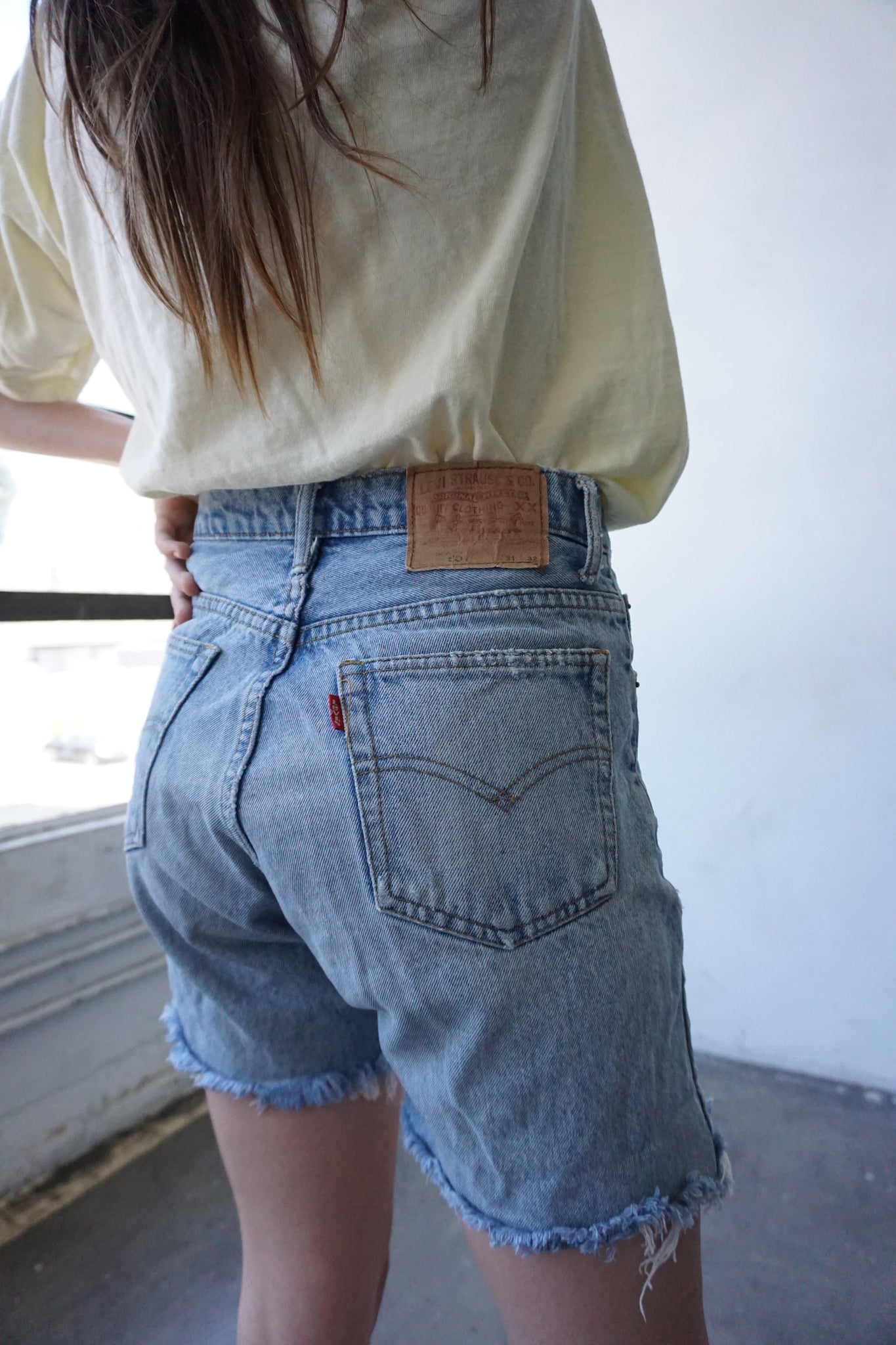 Classic Levi's 501 cutoffs. U.S. made. Light wash. Mid rise. button fly. 100% cotton, non-stretch denim.