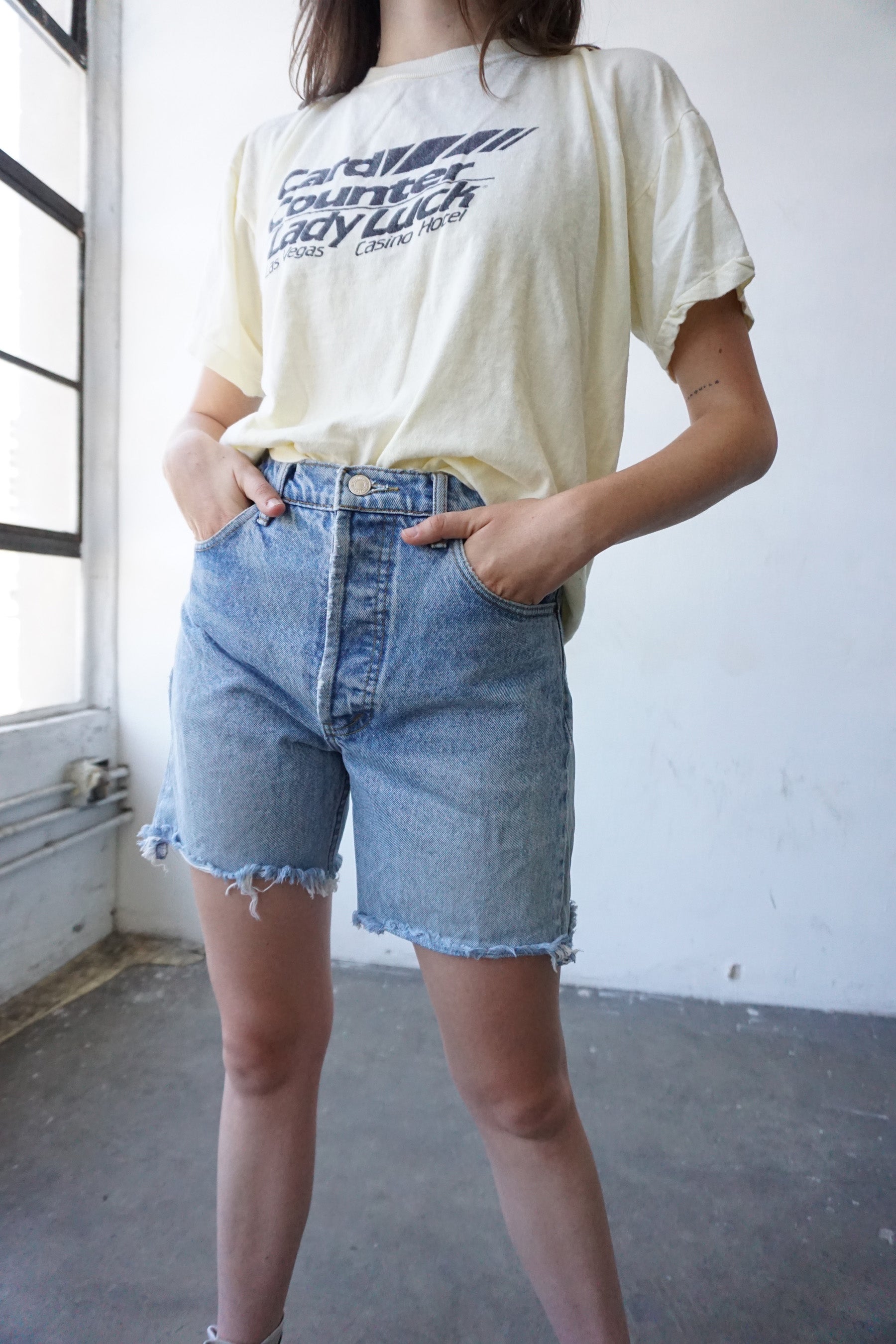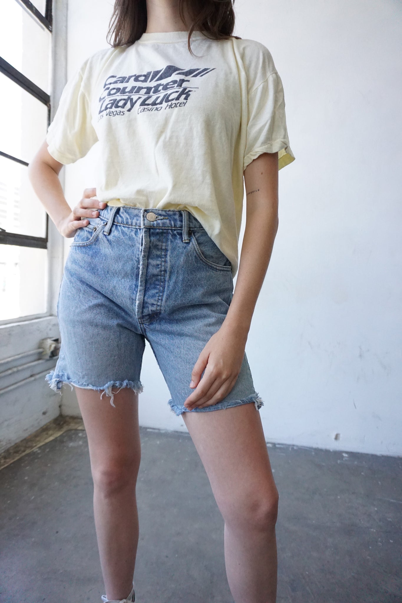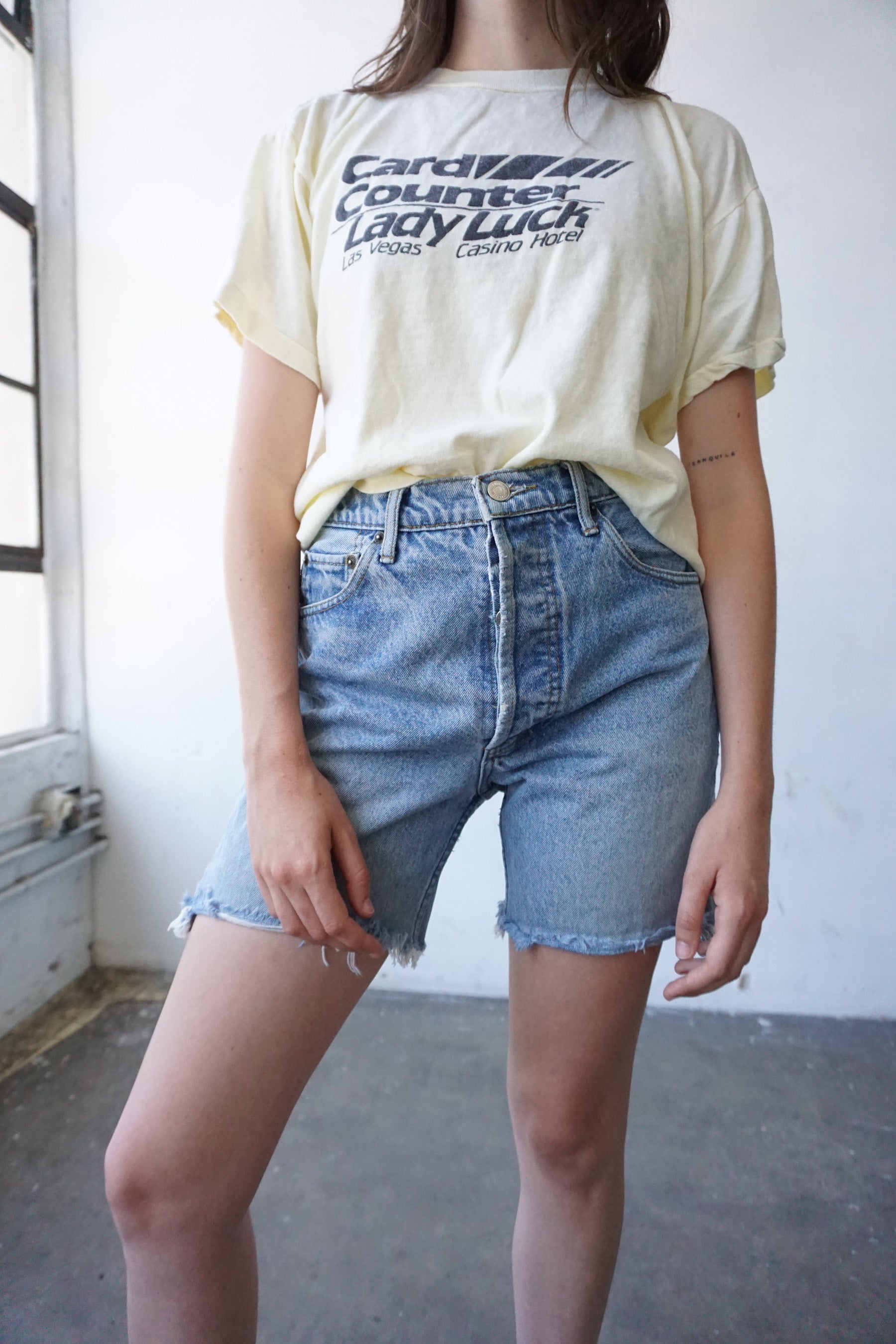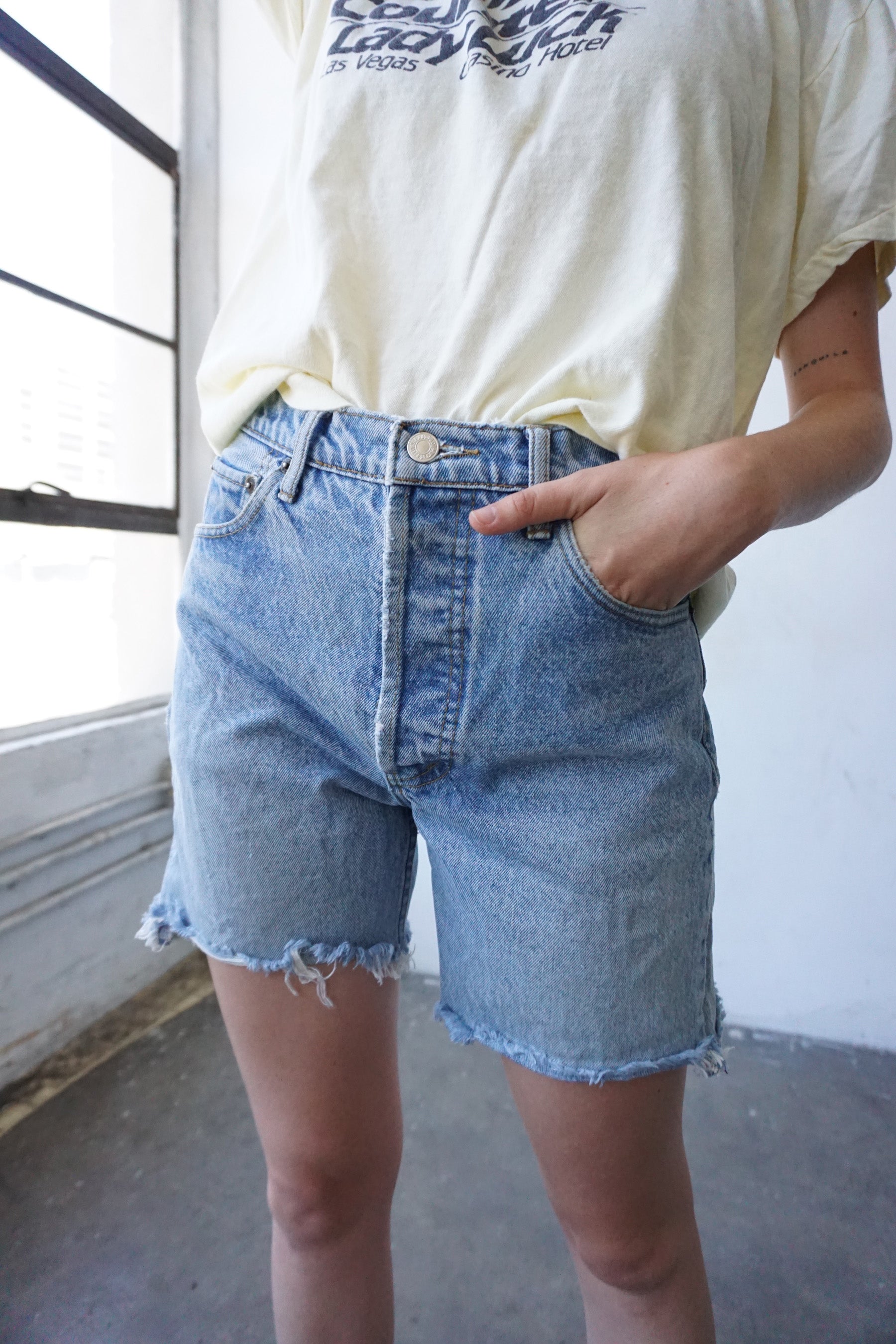 Classic Levi's 501 cutoffs. U.S. made. Light wash. Mid rise. button fly. 100% cotton, non-stretch denim.
