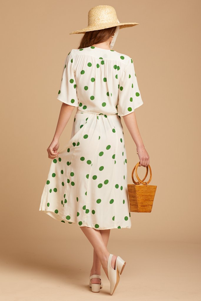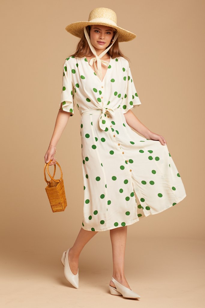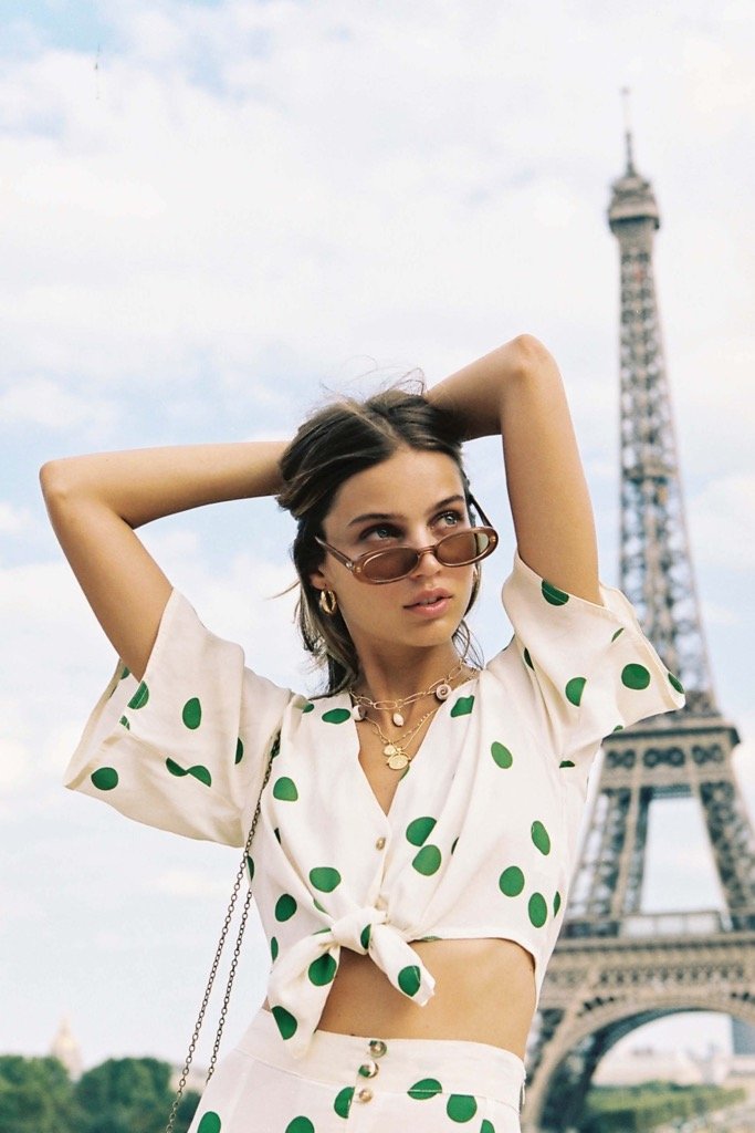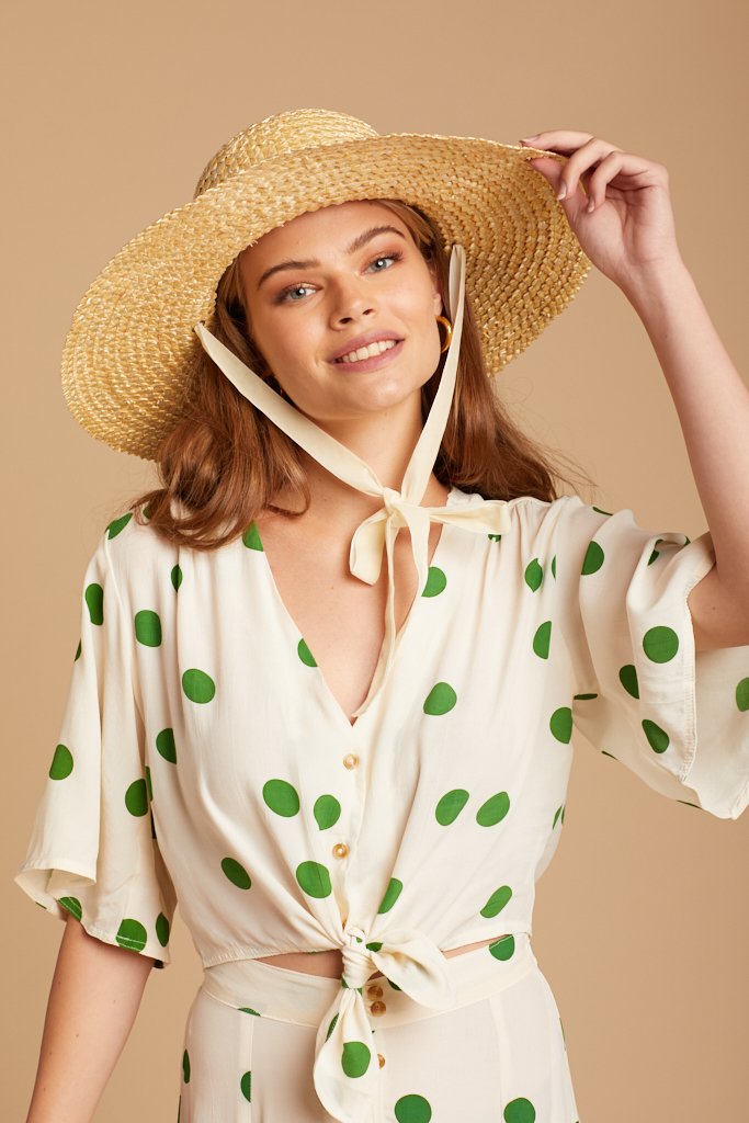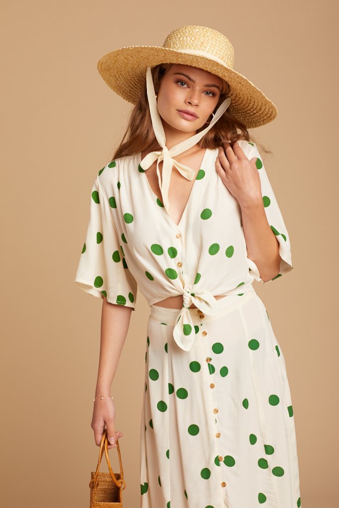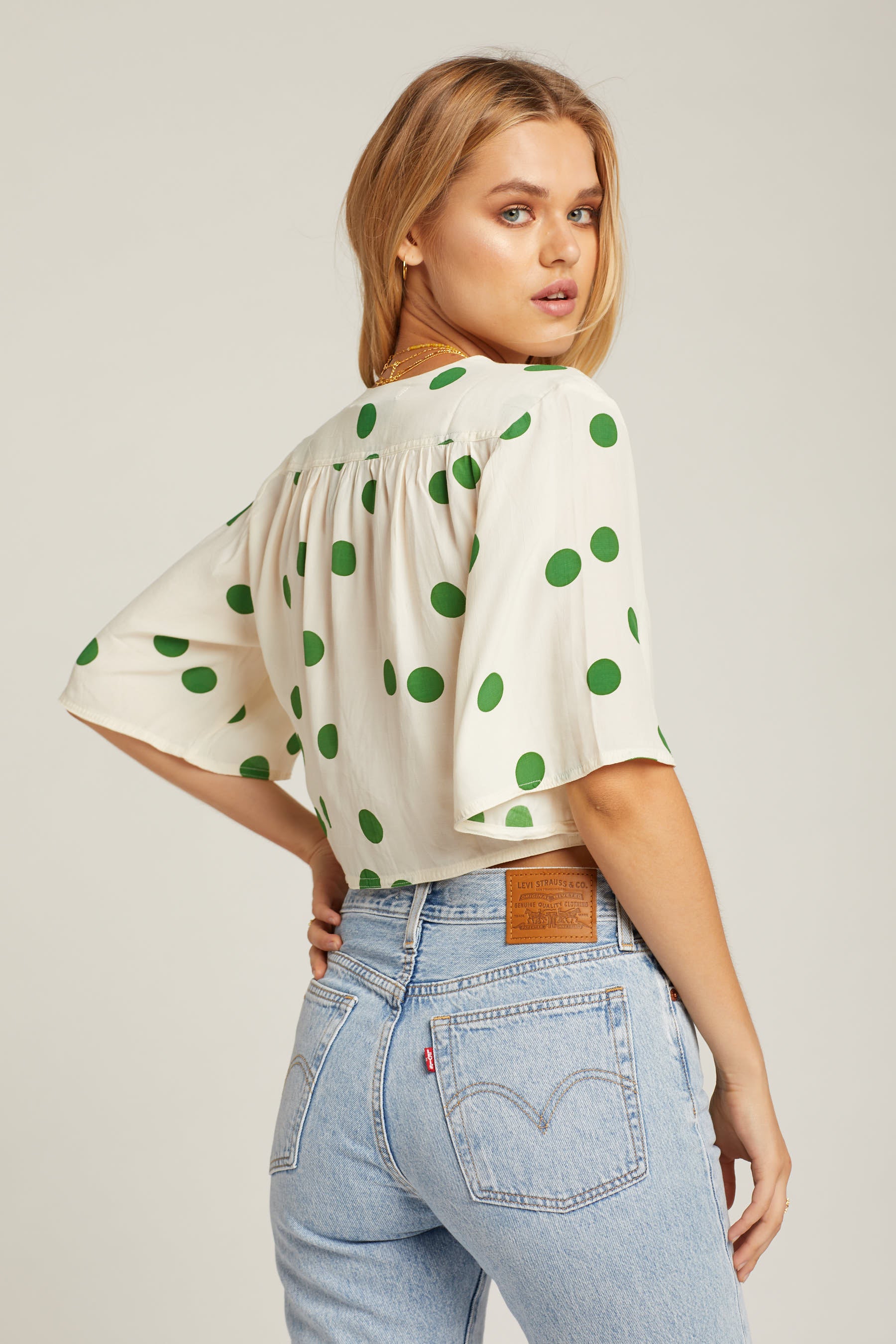 Relaxed cropped blouse with fluted sleeves, a button front, and a front tie detailing. With it's flowy, lightweight, and feminine feel, it's the perfect summer top! Wear as a set with it's matching skirt!