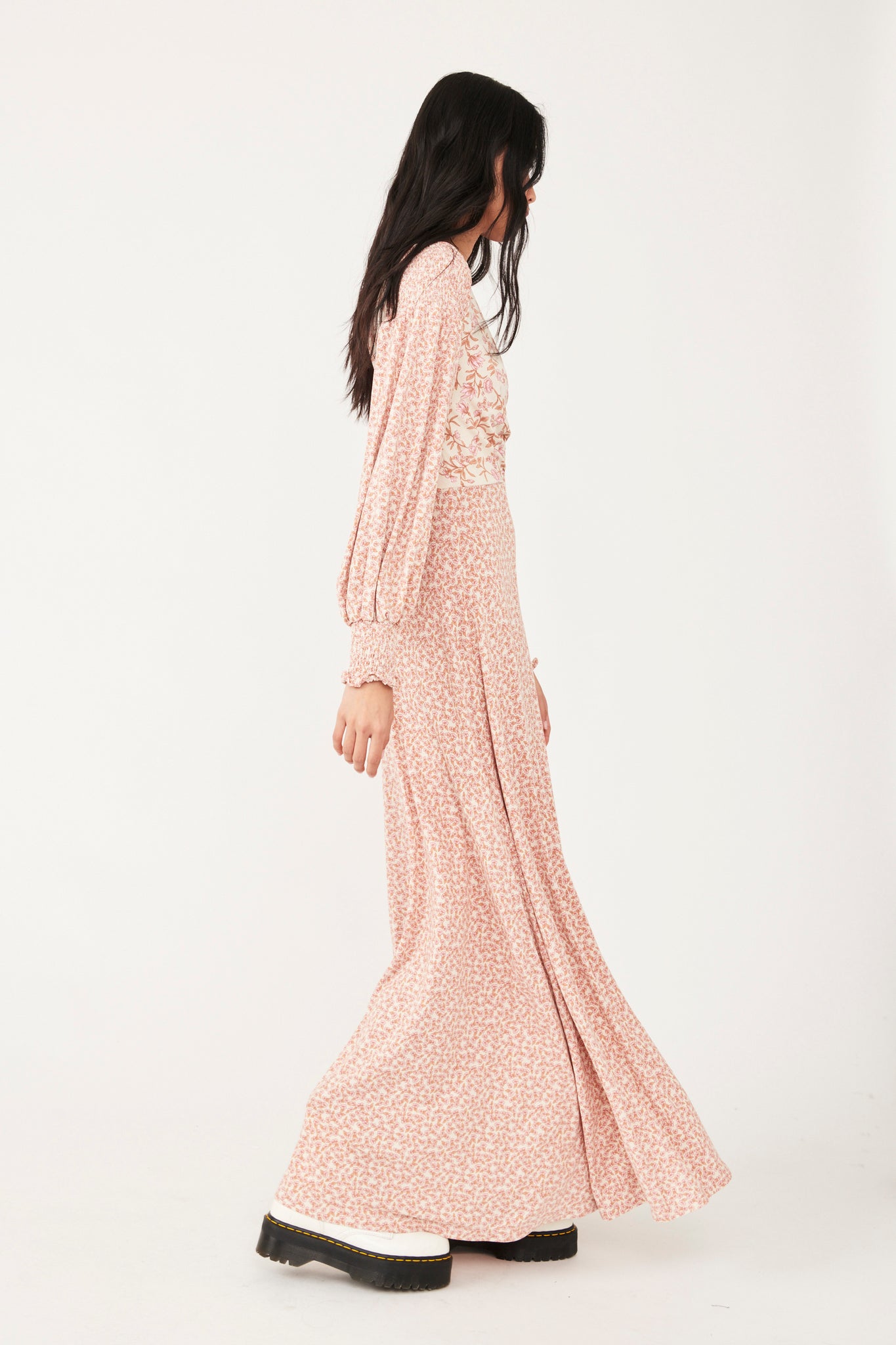 Romantic and forever-femme, this stunning maxi features a plunging V-neckline and balloon sleeves in a mixed-print design and A-line silhouette
