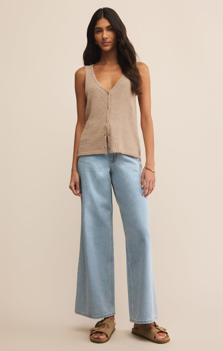 Relaxed and effortlessly stylish, this sleeveless sweater vest features a textured tape yarn knit, an easy v-neck, and button-up styling. It's the perfect lighter layer worn on its own.