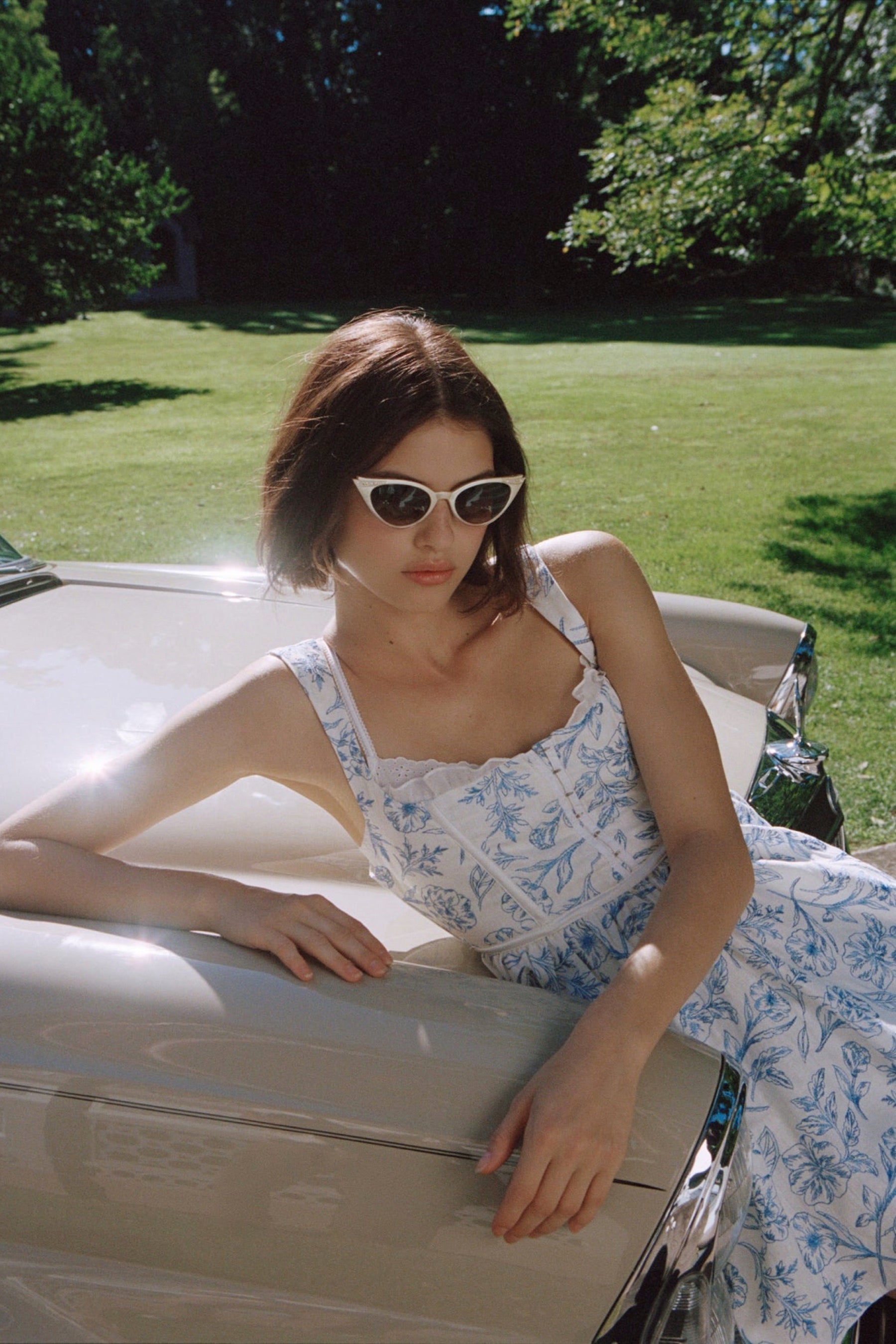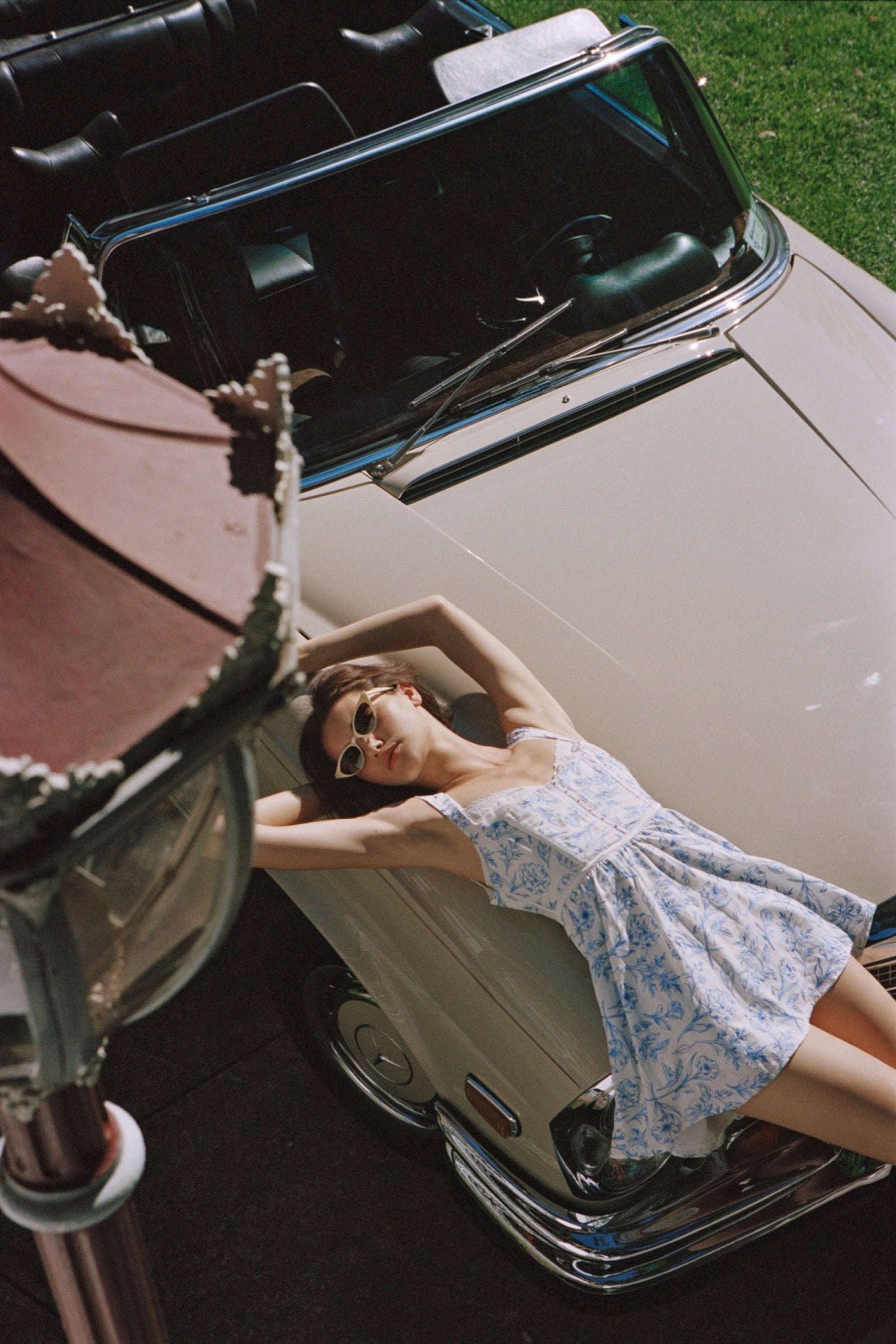 Vintage-inspired toile embroidered mini dress featuring a ruffled sheer organza trim details and white contrast piping throughout the bodice. Hook & eye detailing at bust.