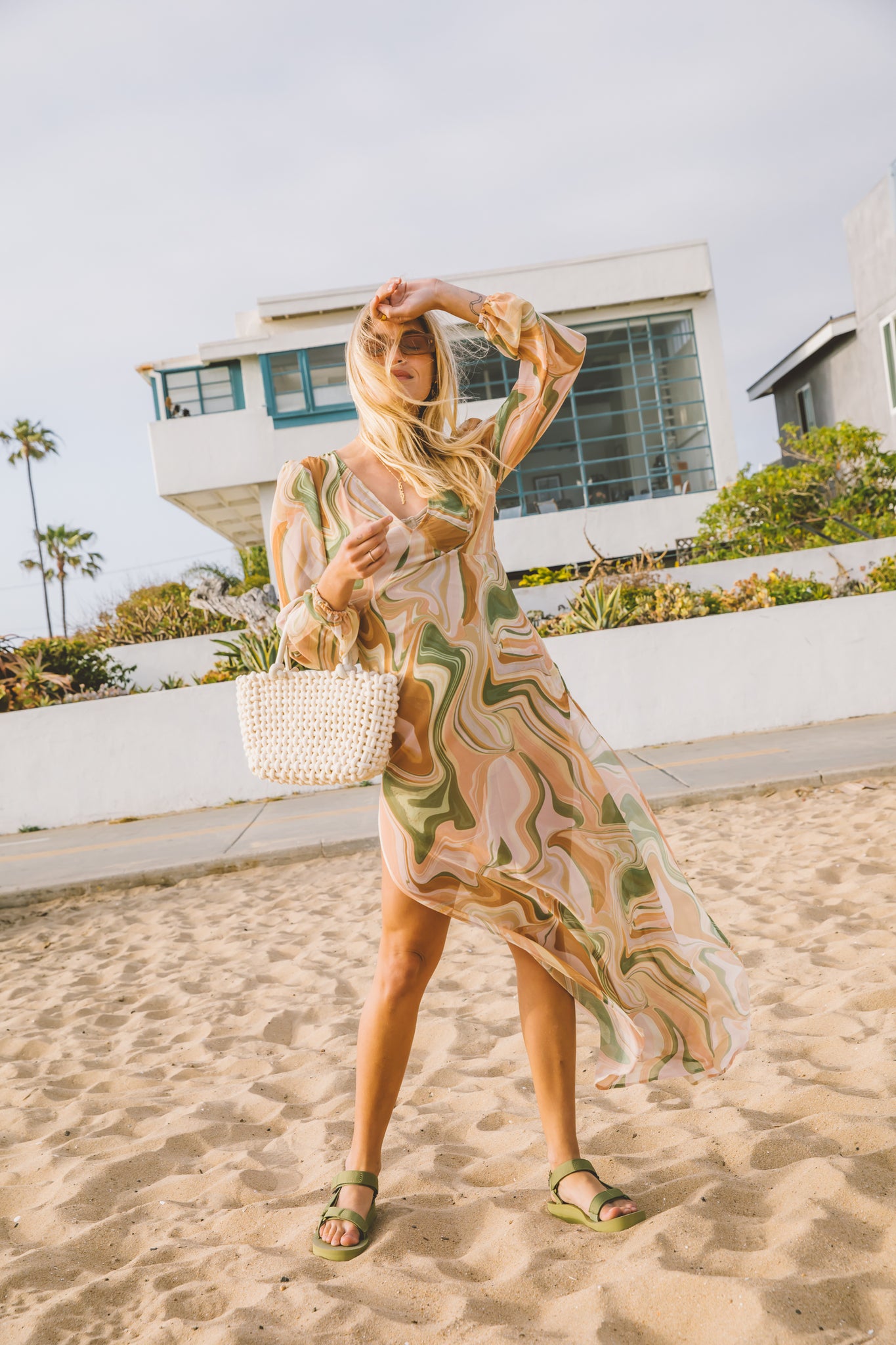 Beautiful sheer marble maxi cover up with a deep v neckline, long sleeves with elastic cuff and side seam slits.