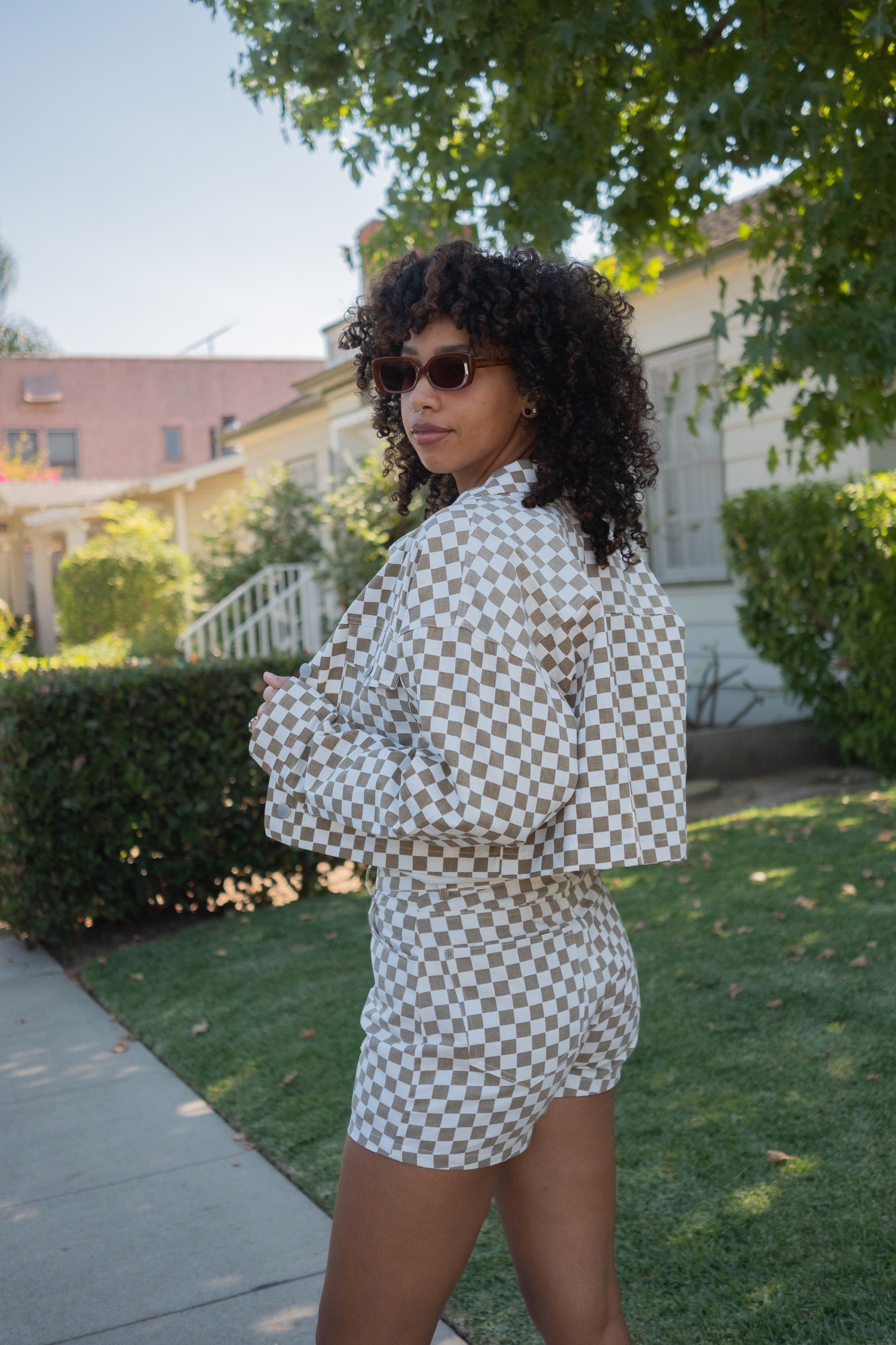 Stand out in this check jacket! Lightweight and perfectly cropped. Features two front pockets with silver hardware. Complete the whole look with the matching Margot Checkered Shorts.
