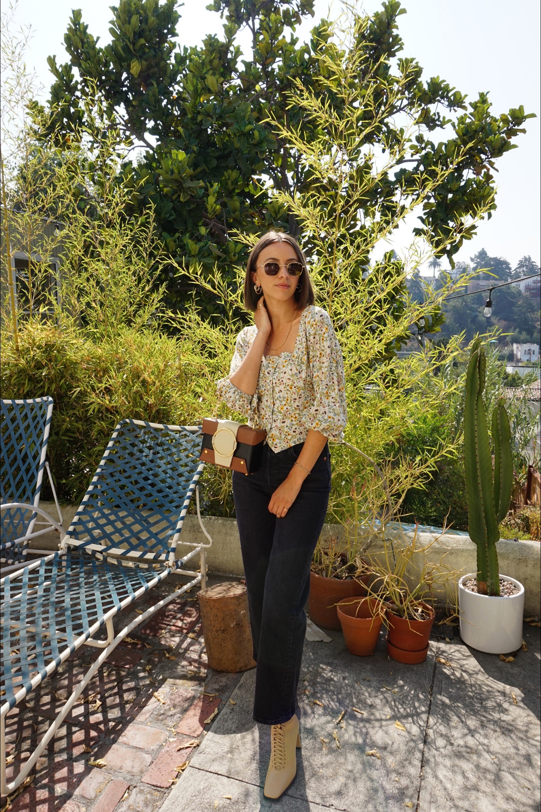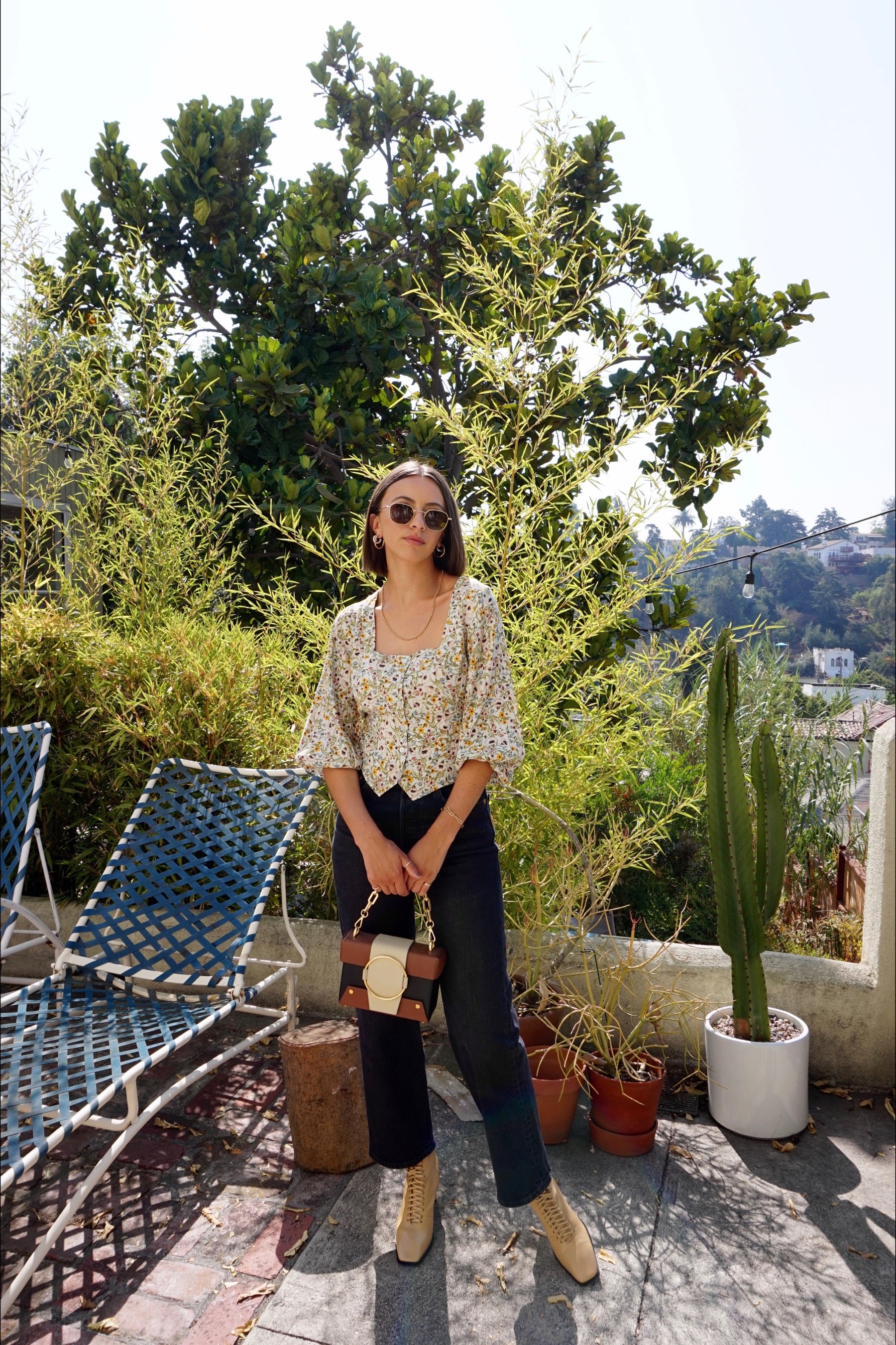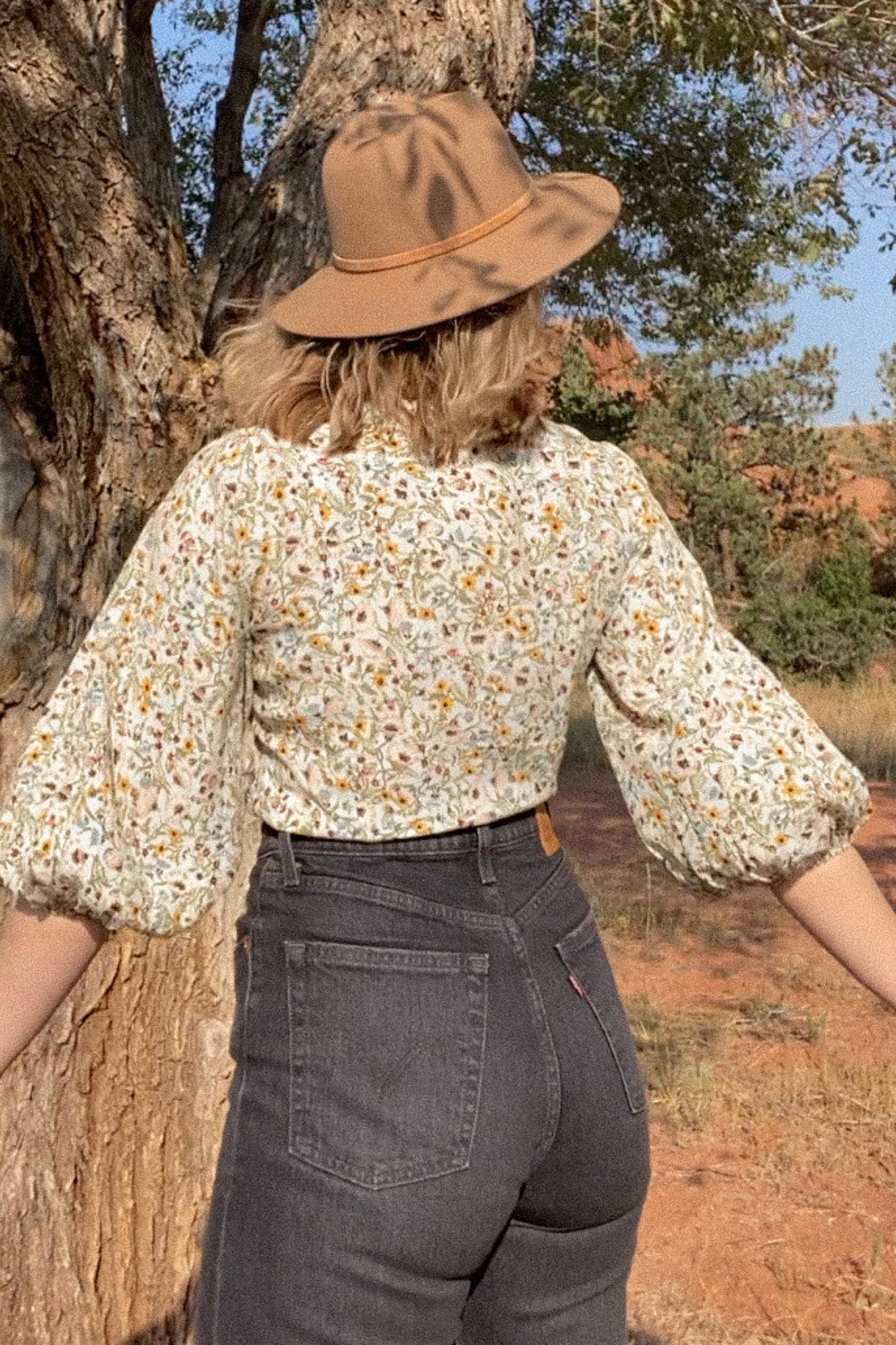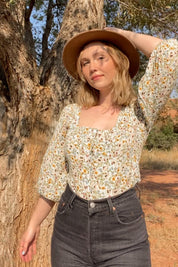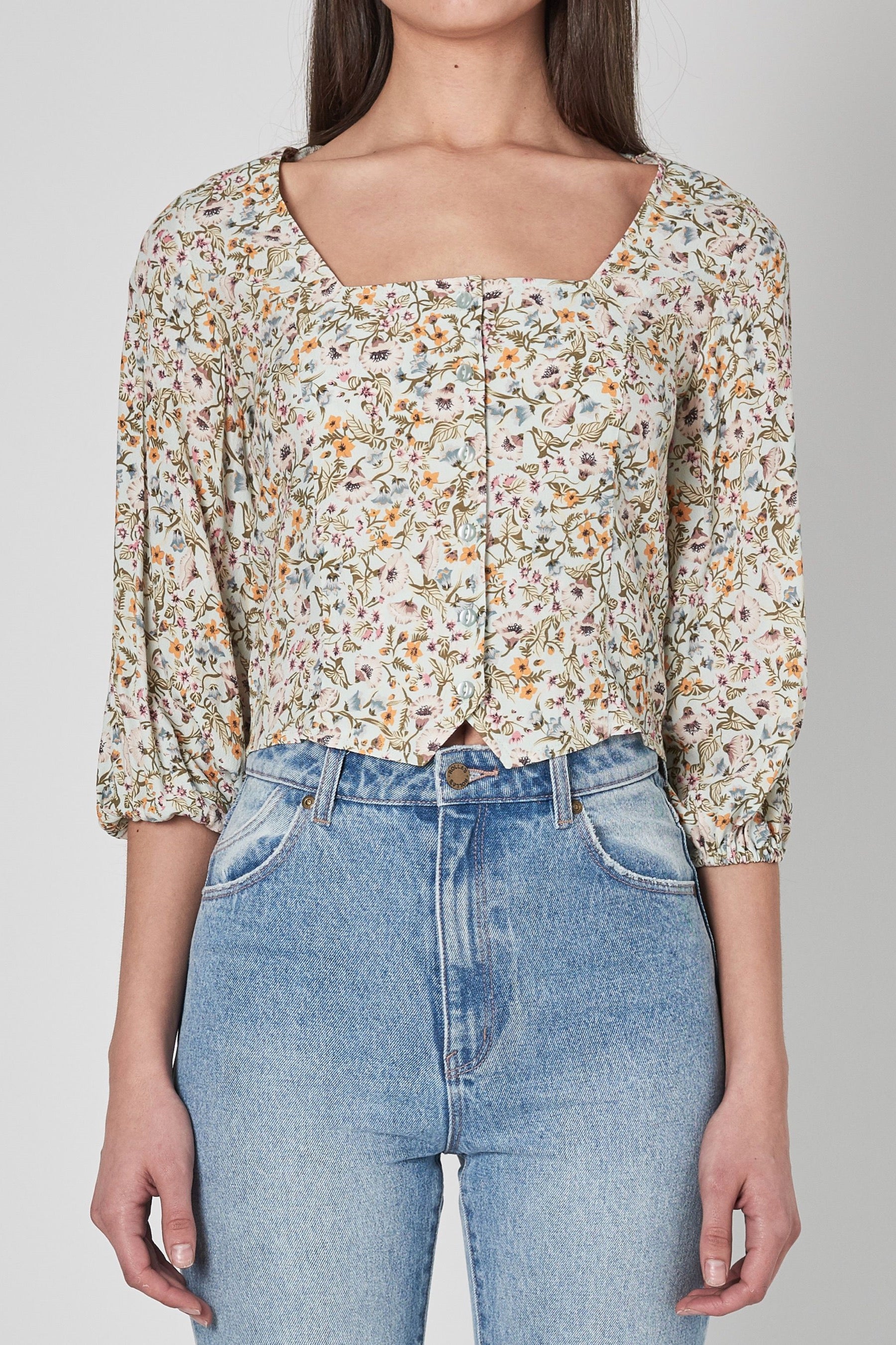 With a slim fitted button through bodice, the Meadow Floral Roxanne Top has a flattering silhouette that will draw attention to the exaggerated blouson sleeve. Sitting just above the hips, this is ideal to pair with any high rise Rollas denim.