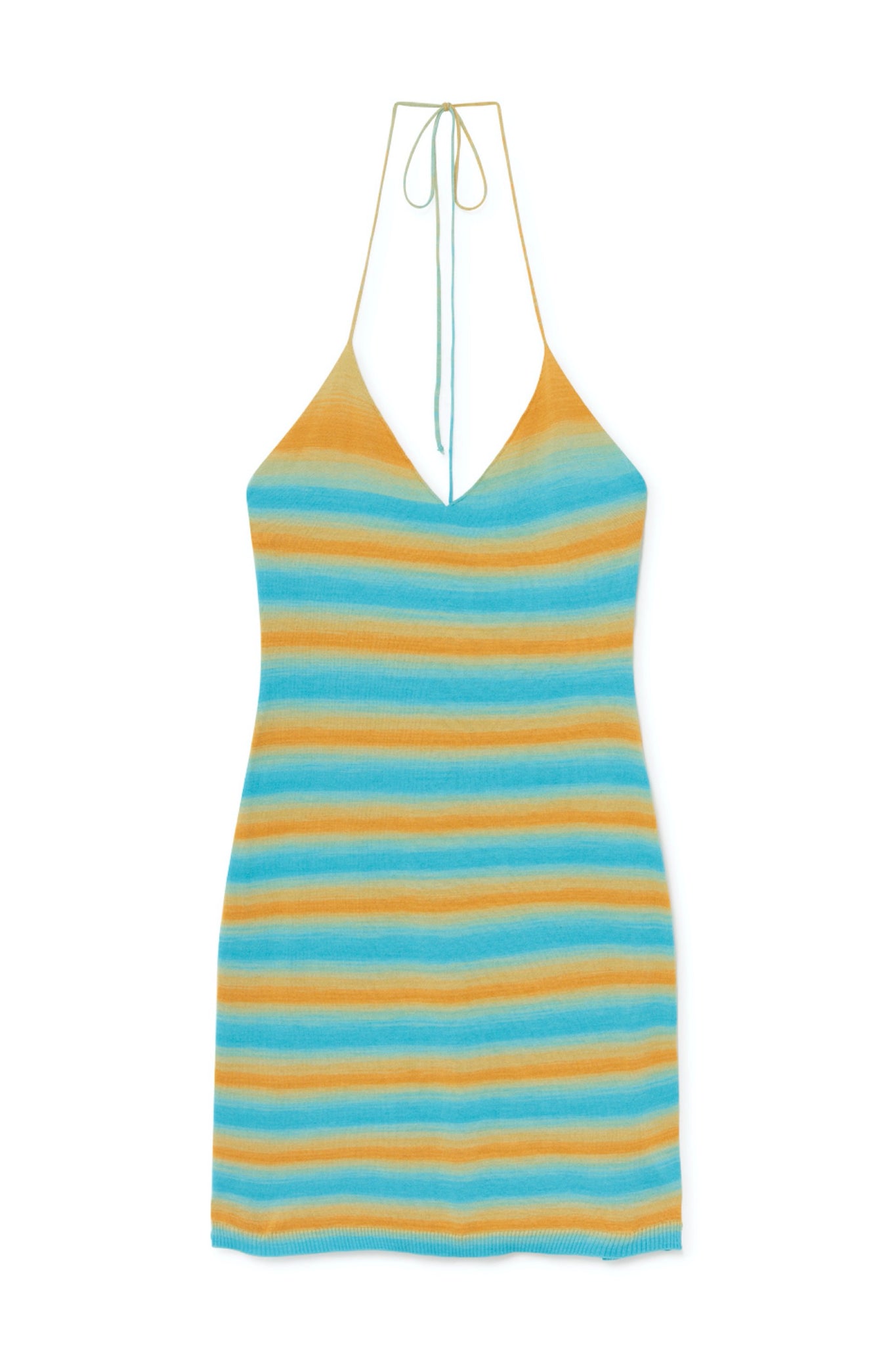 Striped mini dress featuring an adjustable strappy neck tie and soft knit body.