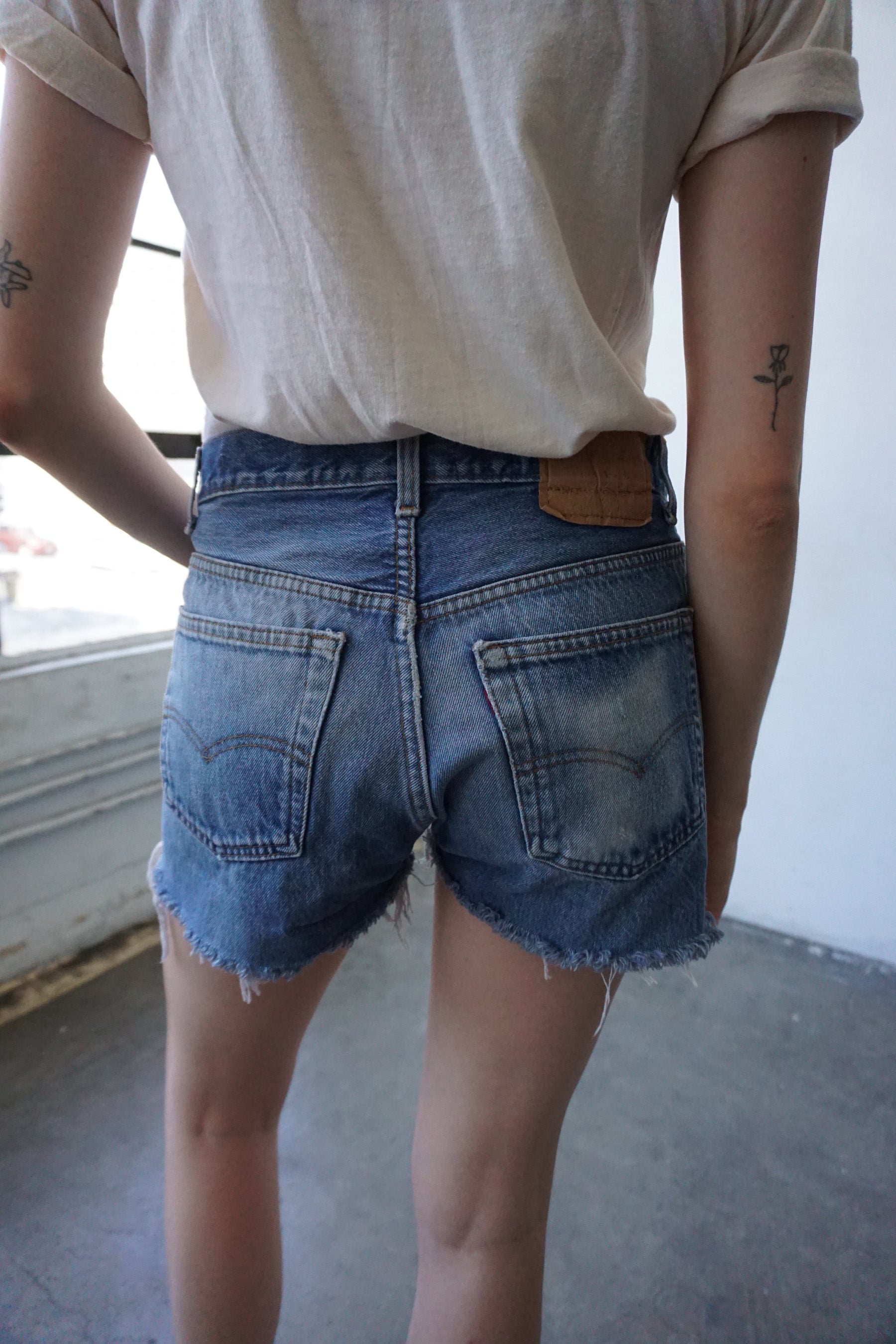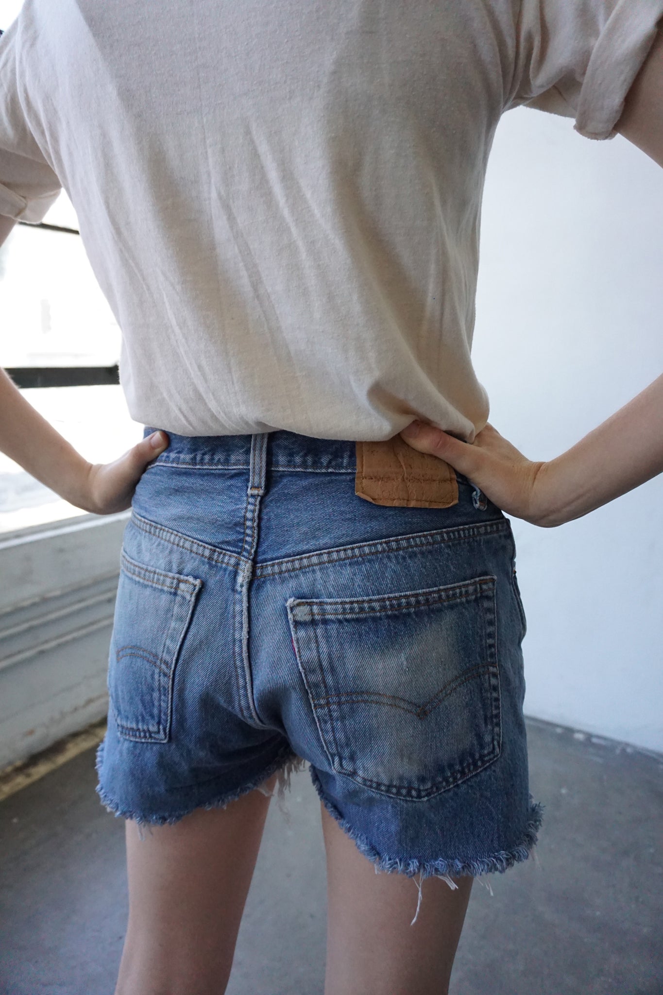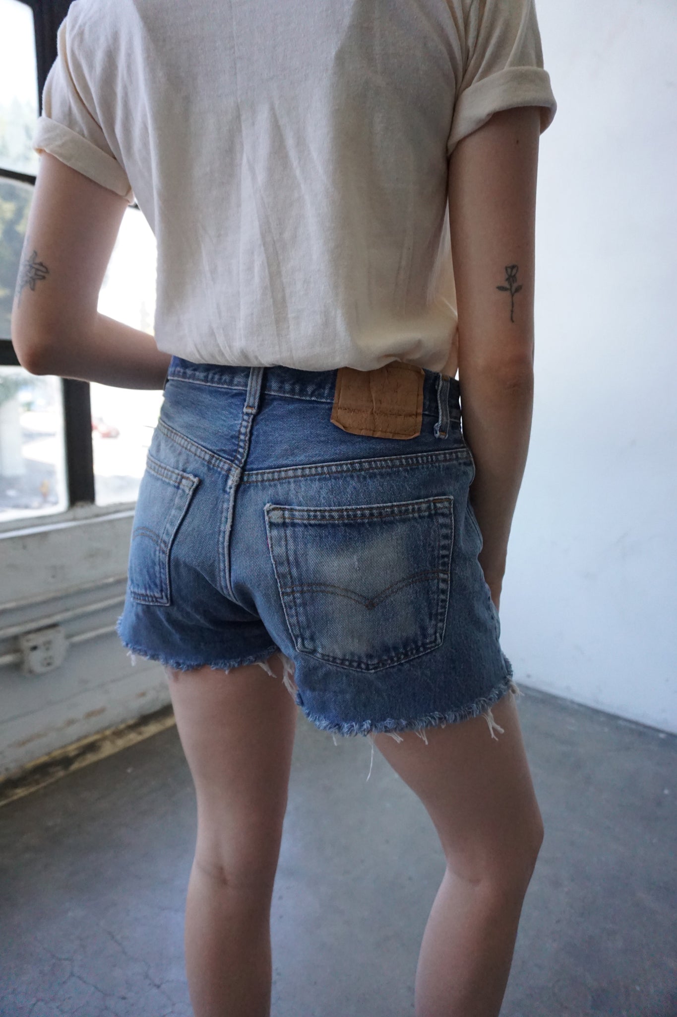 Levi's 501 cutoffs. U.S. made. Medium / dark wash. Mid rise. Button fly. 100% cotton, non-stretch denim.