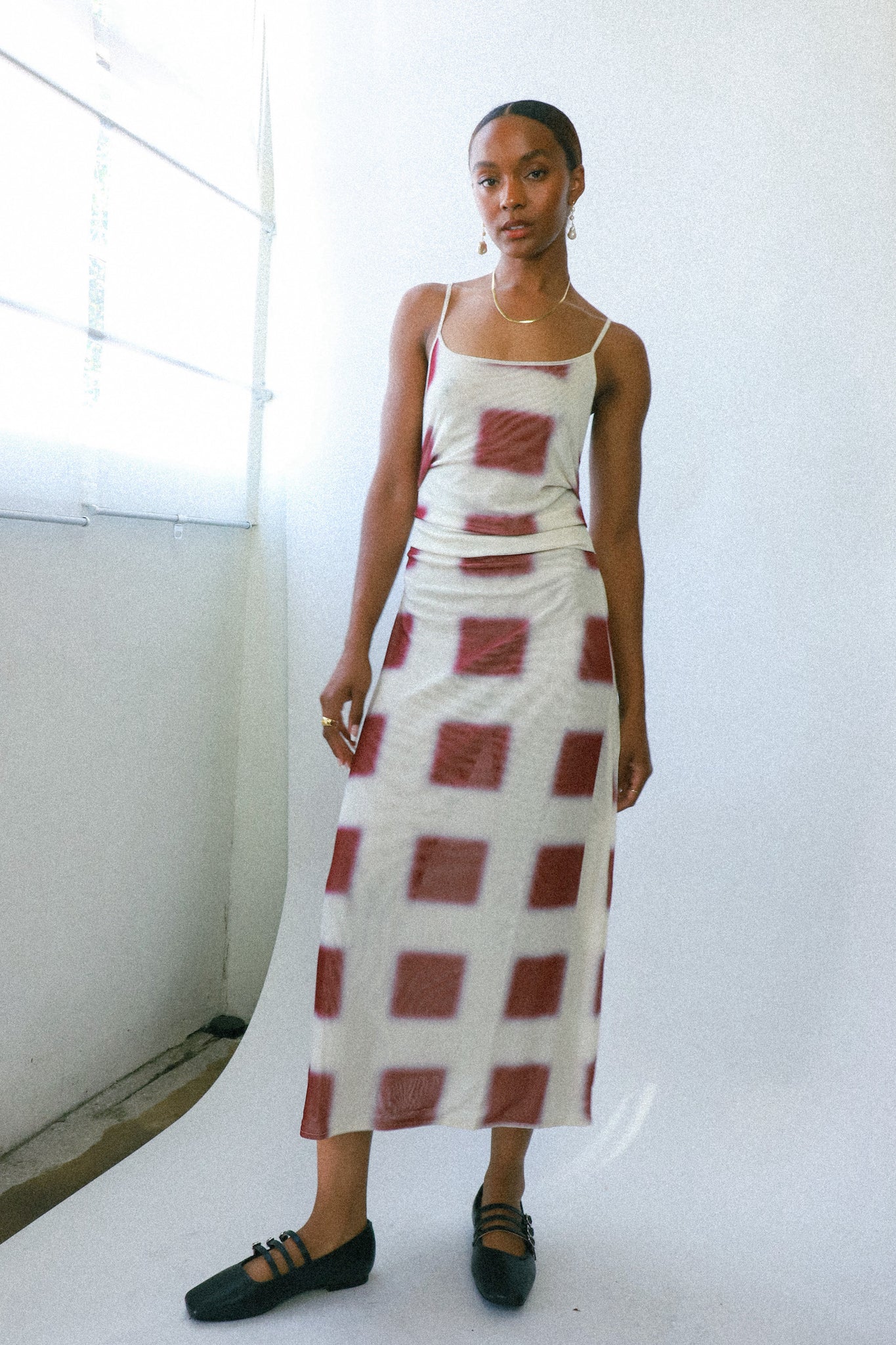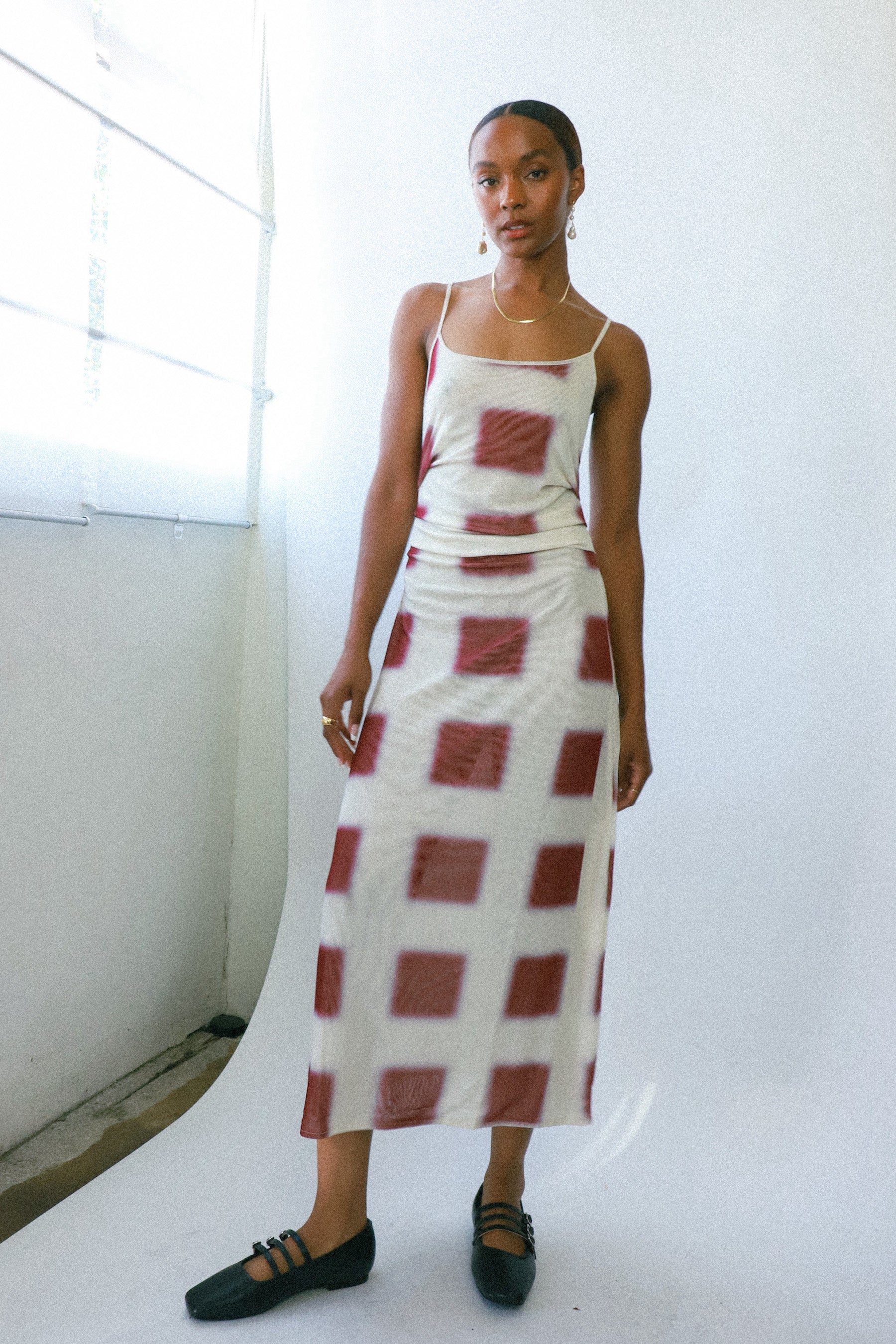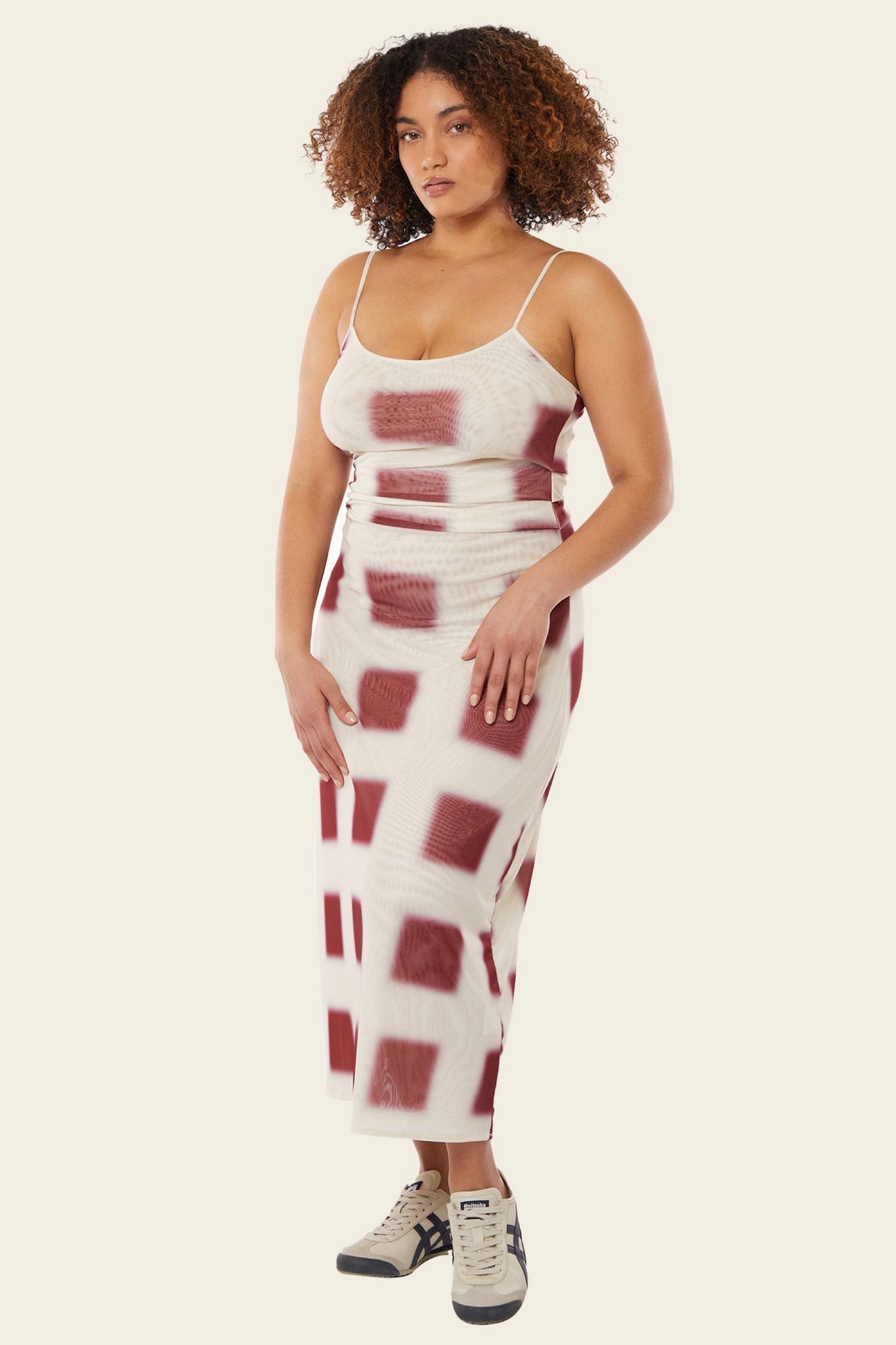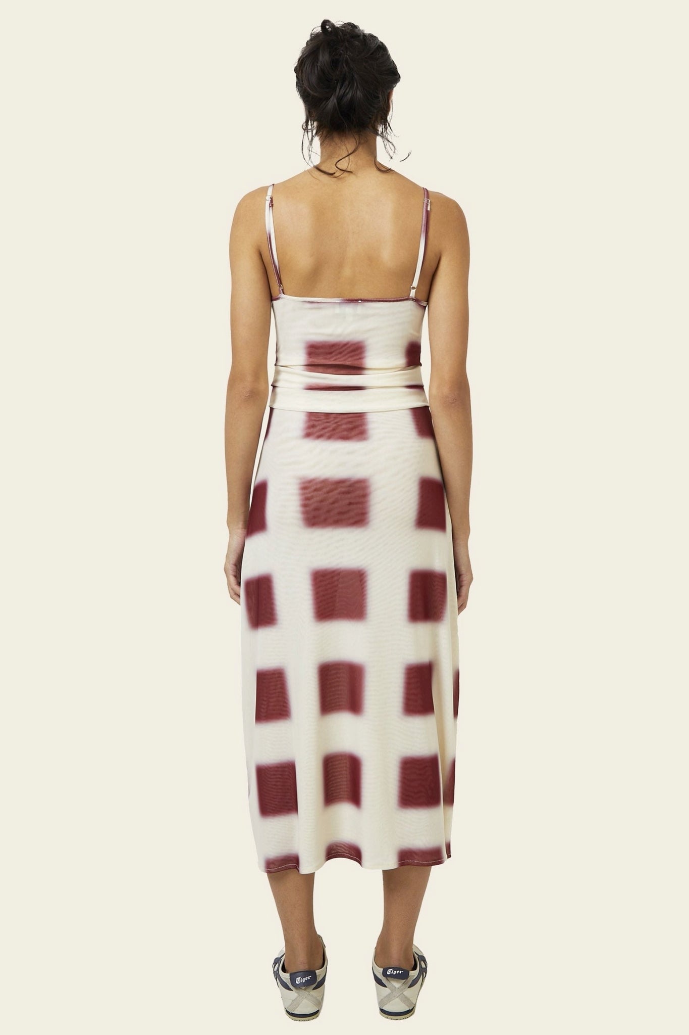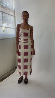 Simple midi dress body featuring the most flattering side ruching that showcases our newest merlot print.