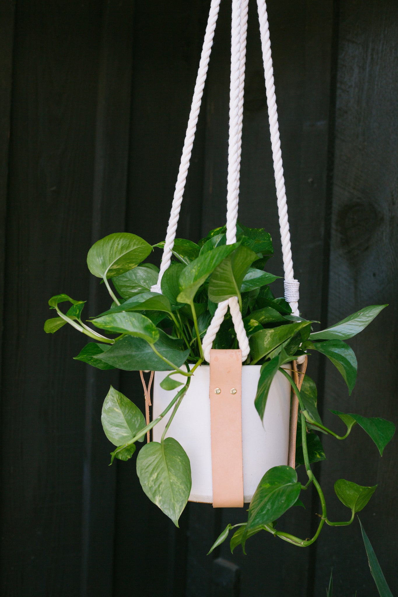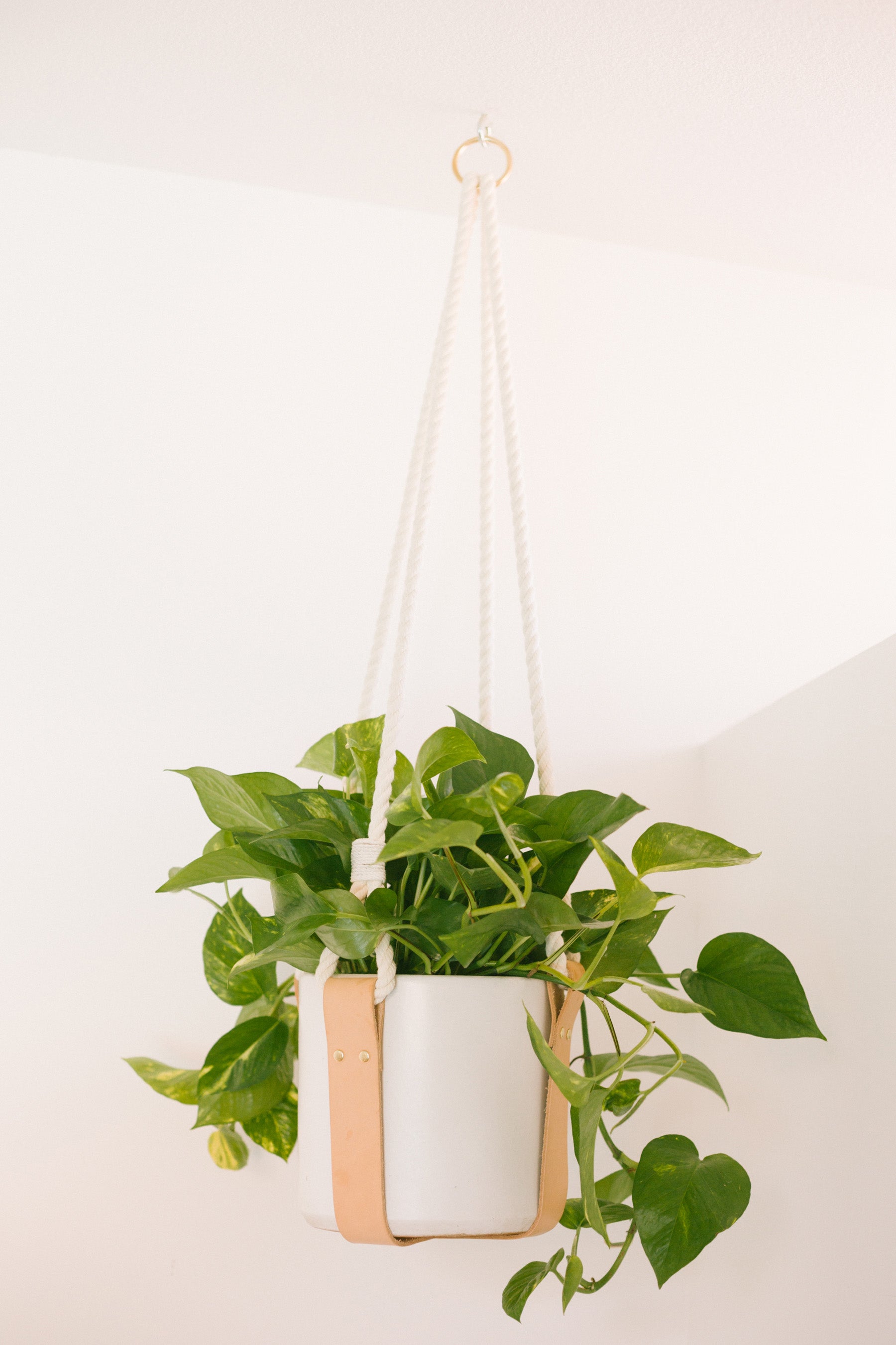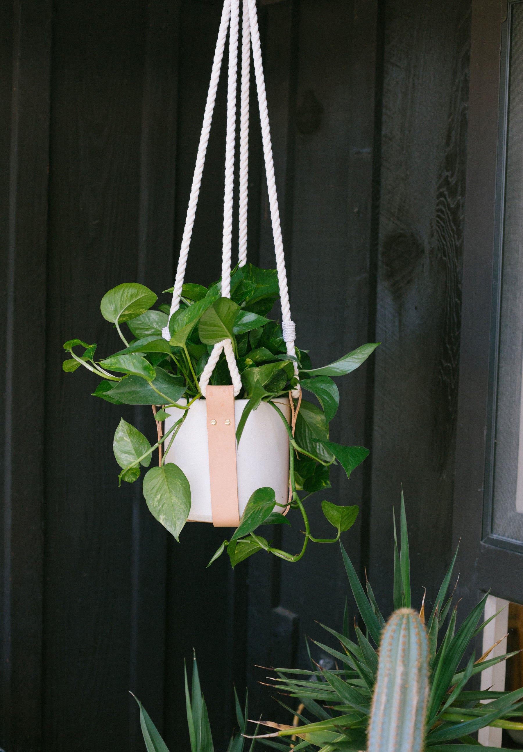 Please Note: All plant stands are made with leather straps and cotton rope and are intended for indoor use only. Wipe up all water spills immediately to avoid damage to leather. All plant stands were made to fit 8" cylinder or bell pots.