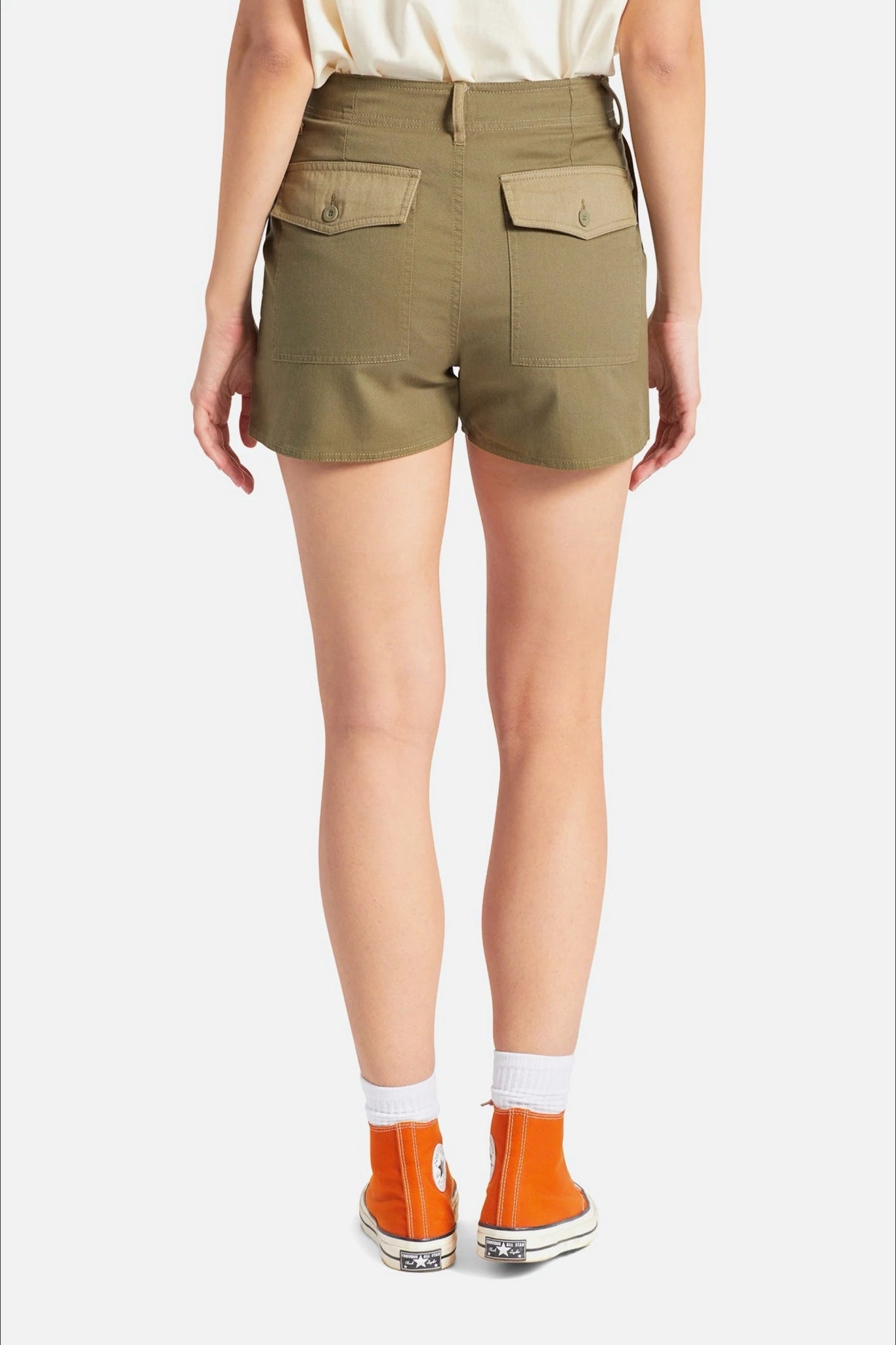 These are a high-waisted utility short with a straight leg. They’re designed with patch pockets and a seamless waistband that channels Hollywood vibes.