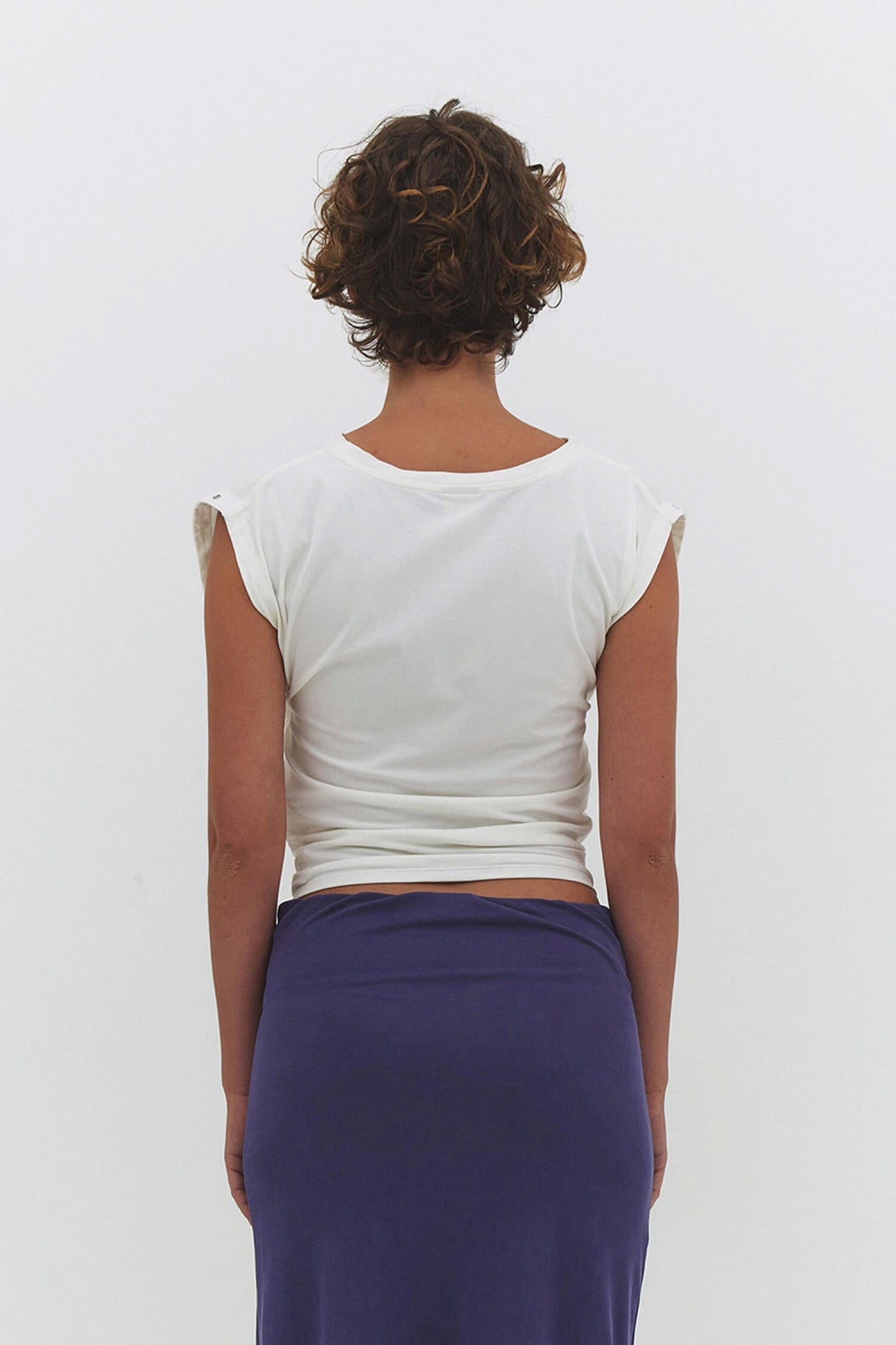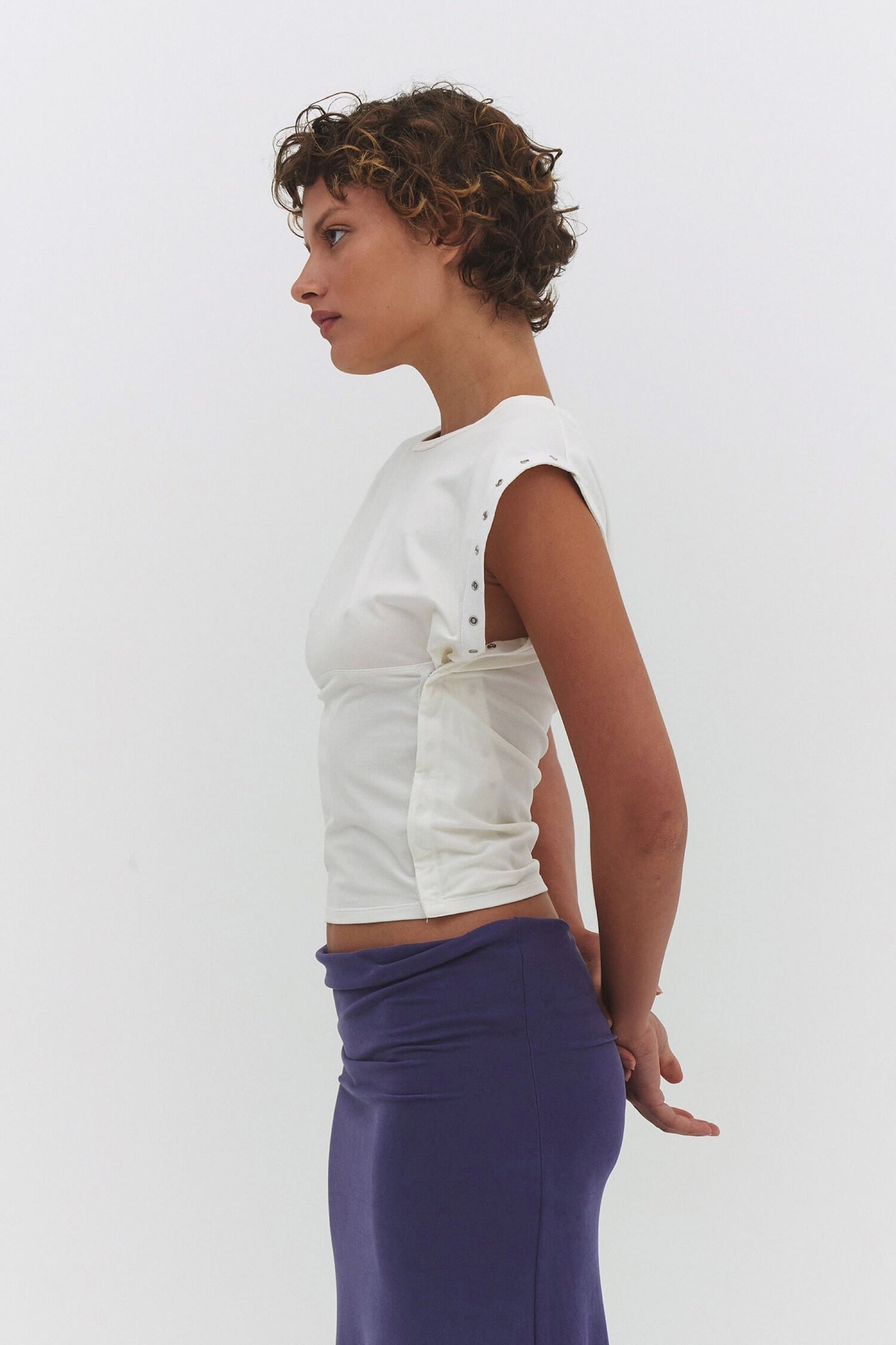 The Snap Tank is a cropped sleeveless top with snap details that can be adjusted to wear open, snapped and loose or snapped and fitted along the sides. Your new wardrobe essential.
