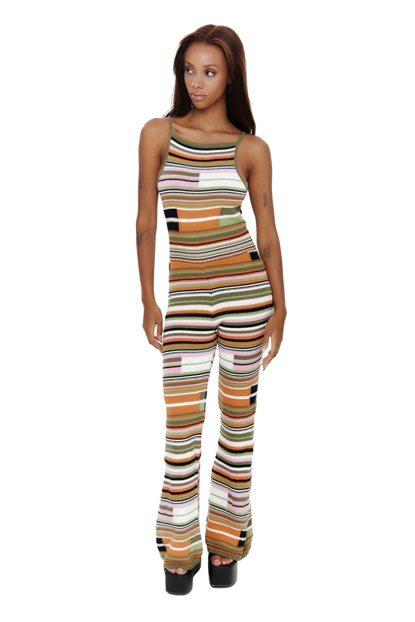 Crafted from a soft, luxurious knit in a bold stripe design. This jumpsuit features a modern slim fit transcending to a wide leg silhouette. Style with chunky trainers for an  effortlessly cool daytime look. A true statement piece for your sustainable summer wardrobe.