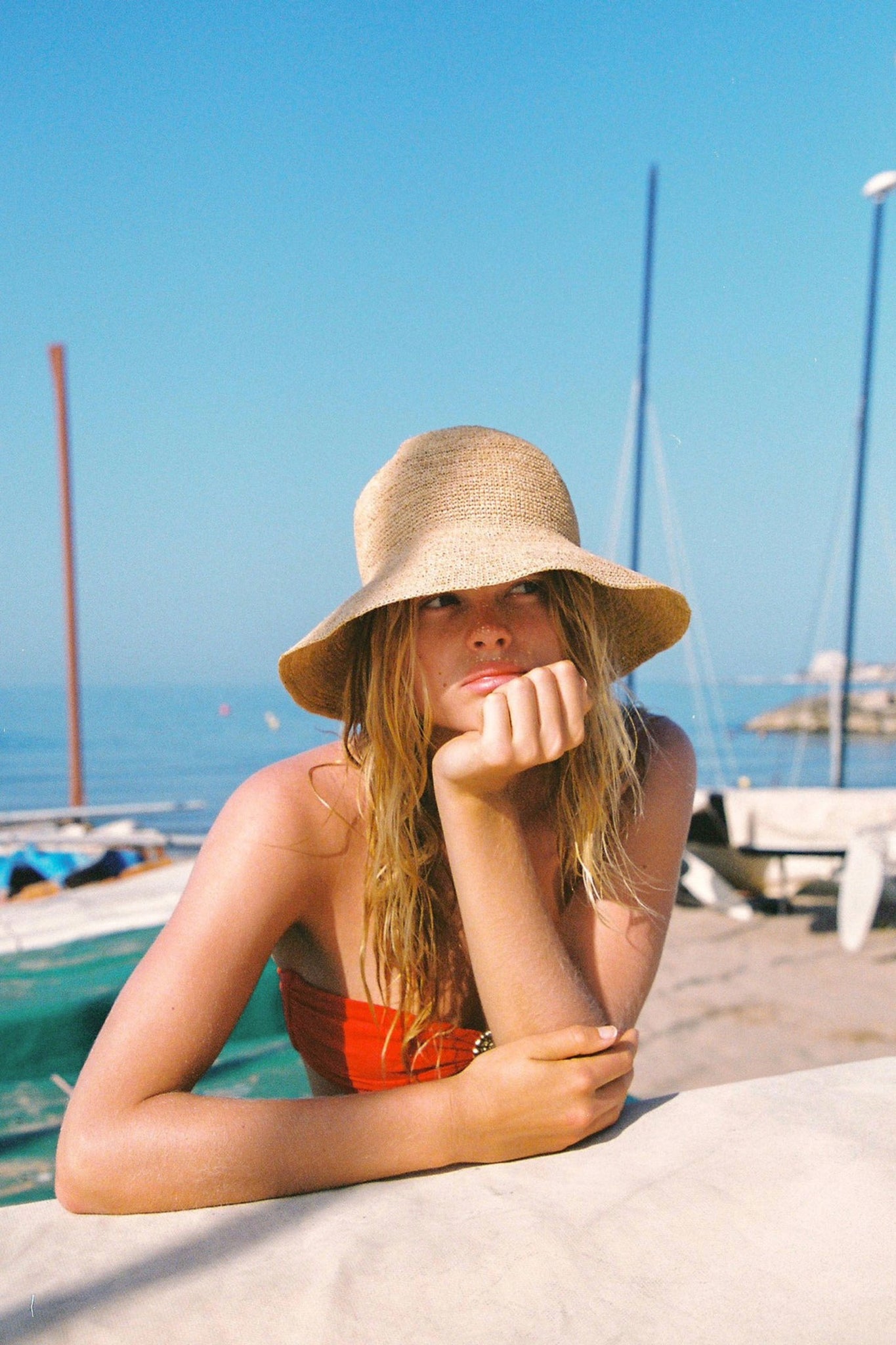 From rowing regattas to summer picnics and long days floating down the river. This hand crochet raffia sunhat features a classic round crown and domed down brim. Classic, chic and timeless.
