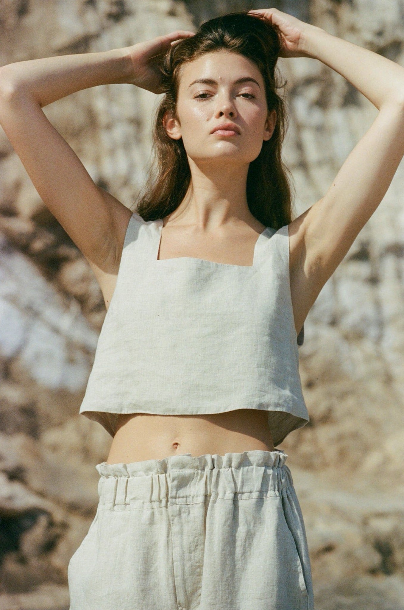 Made from quality linen, this tank features a trendy square neck and a cropped design that's perfect for warm weather. Versatile and stylish, it's a must-have addition to your wardrobe!
