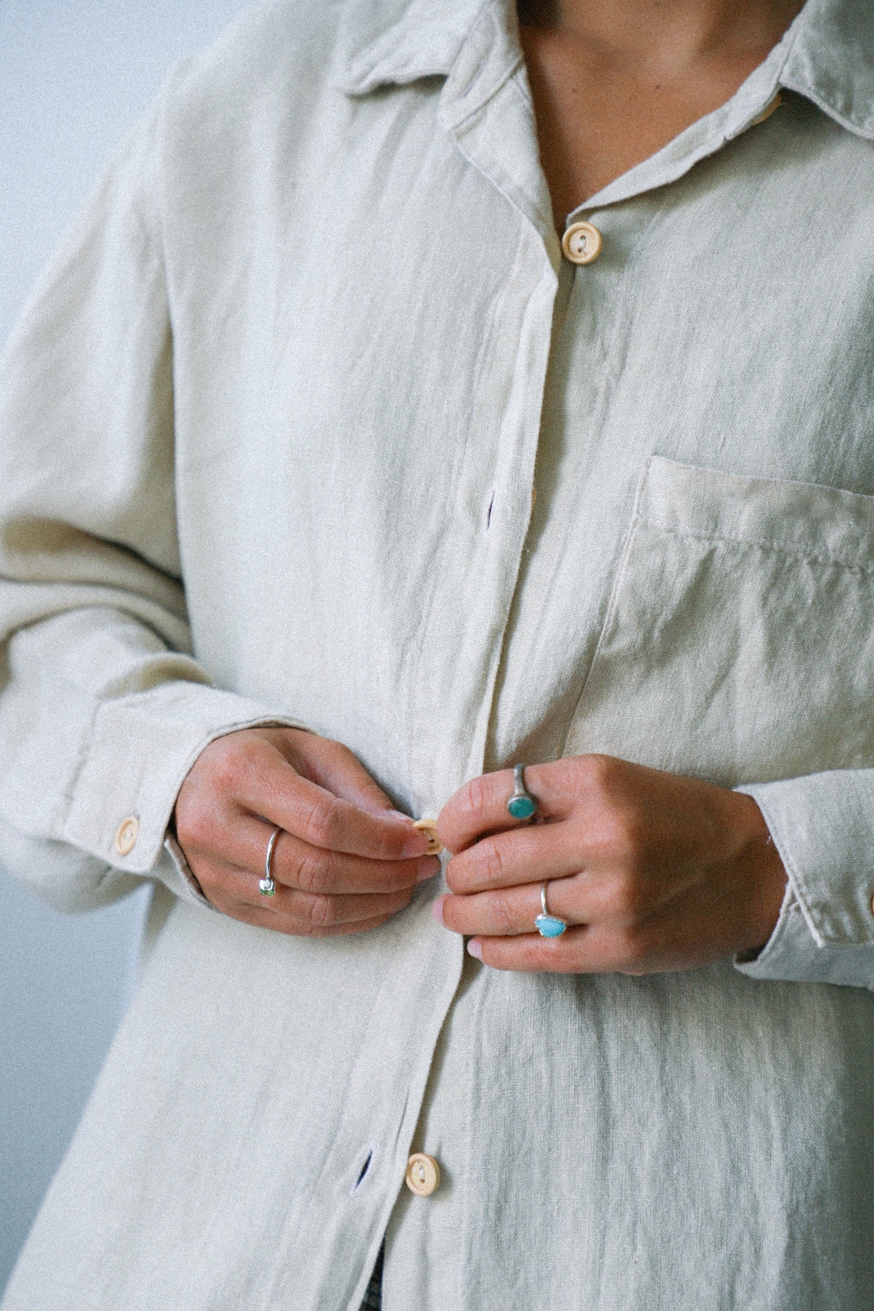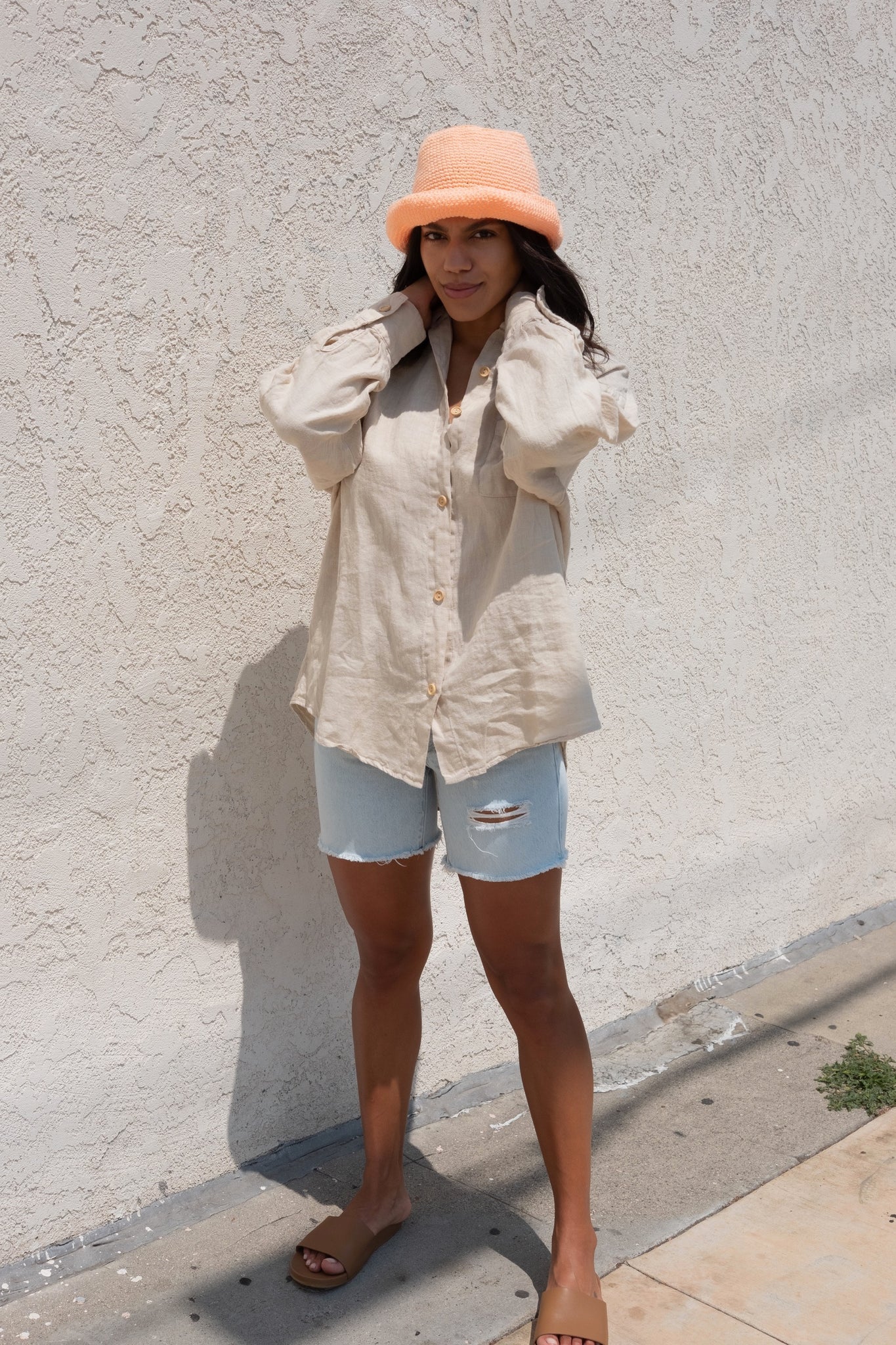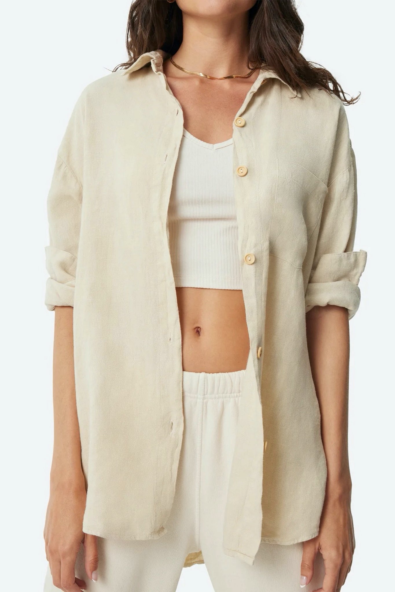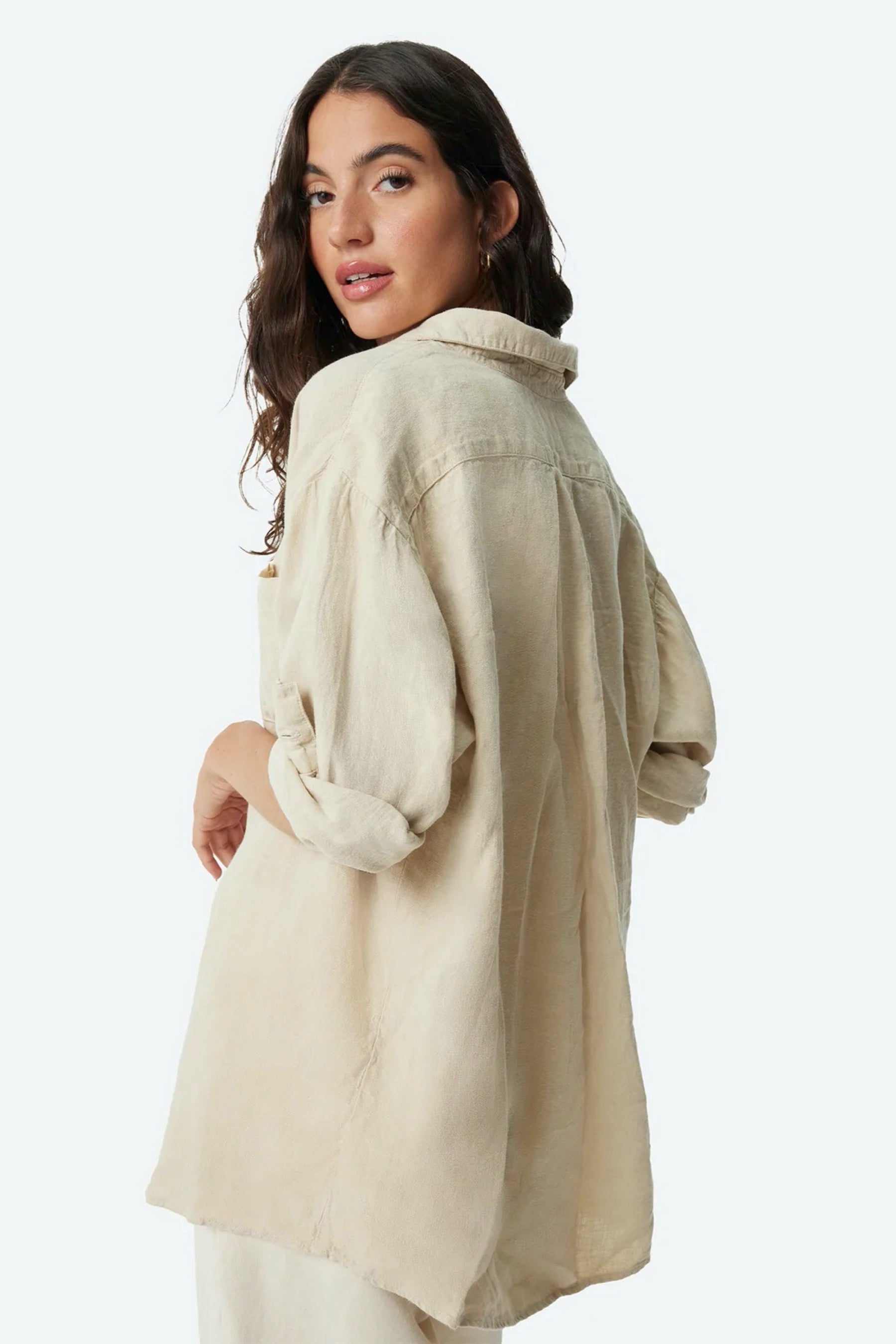 This long sleeve button-down is made with 100% Natural Linen and detailed with all-natural pear wooden buttons. The relaxed fit and oversized sleeves create an effortless vibe whether you crop the shirt up with a front knot or let the Linen hang loose for a breezy style.